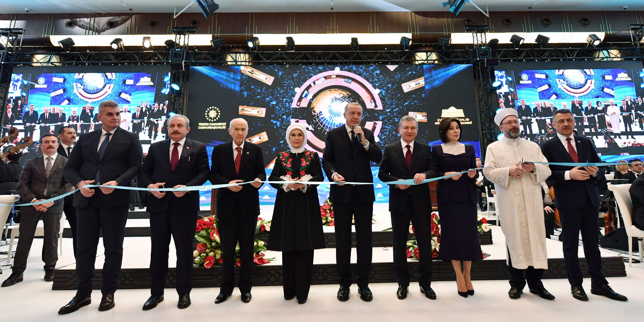 Cumhurbaşkanı Erdoğan, konuğu Özbekistan Cumhurbaşkanı Şevket Mirziyoyev ve beraberindekilerle, kütüphanenin hayırlı olmasını dileyerek kurdeleyi kesti, açılışı gerçekleştirdi.