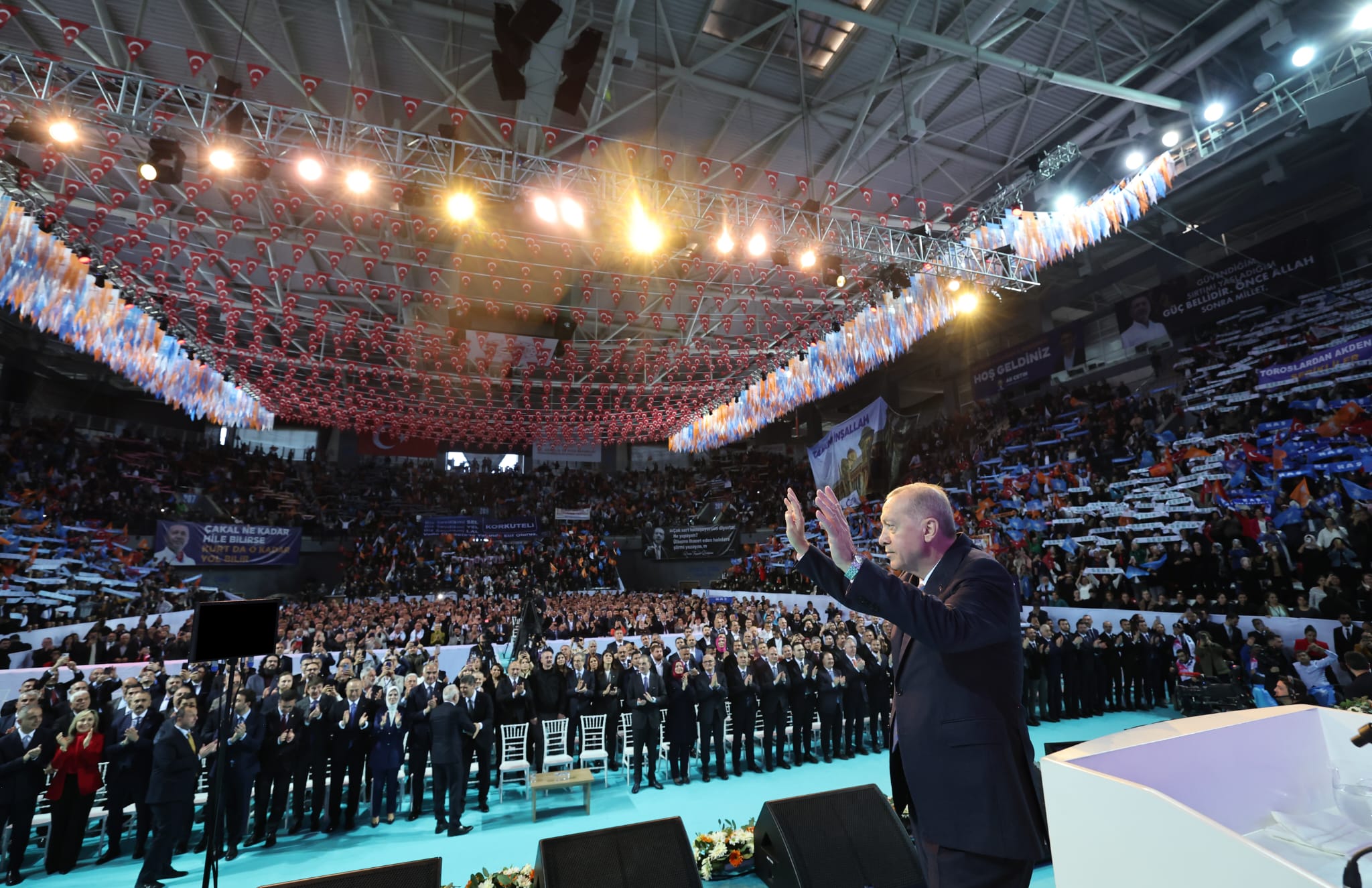 Türk bayrakları ve AK Parti flamalarıyla donatılan salonda "Dünya bir yana, biz yan yana", "Zalimin zulmü varsa mazlumun Erdoğan'ı var" ve "Umudun, icraatın, geleceğin adı AK Parti" yazılı pankartlar asıldı.