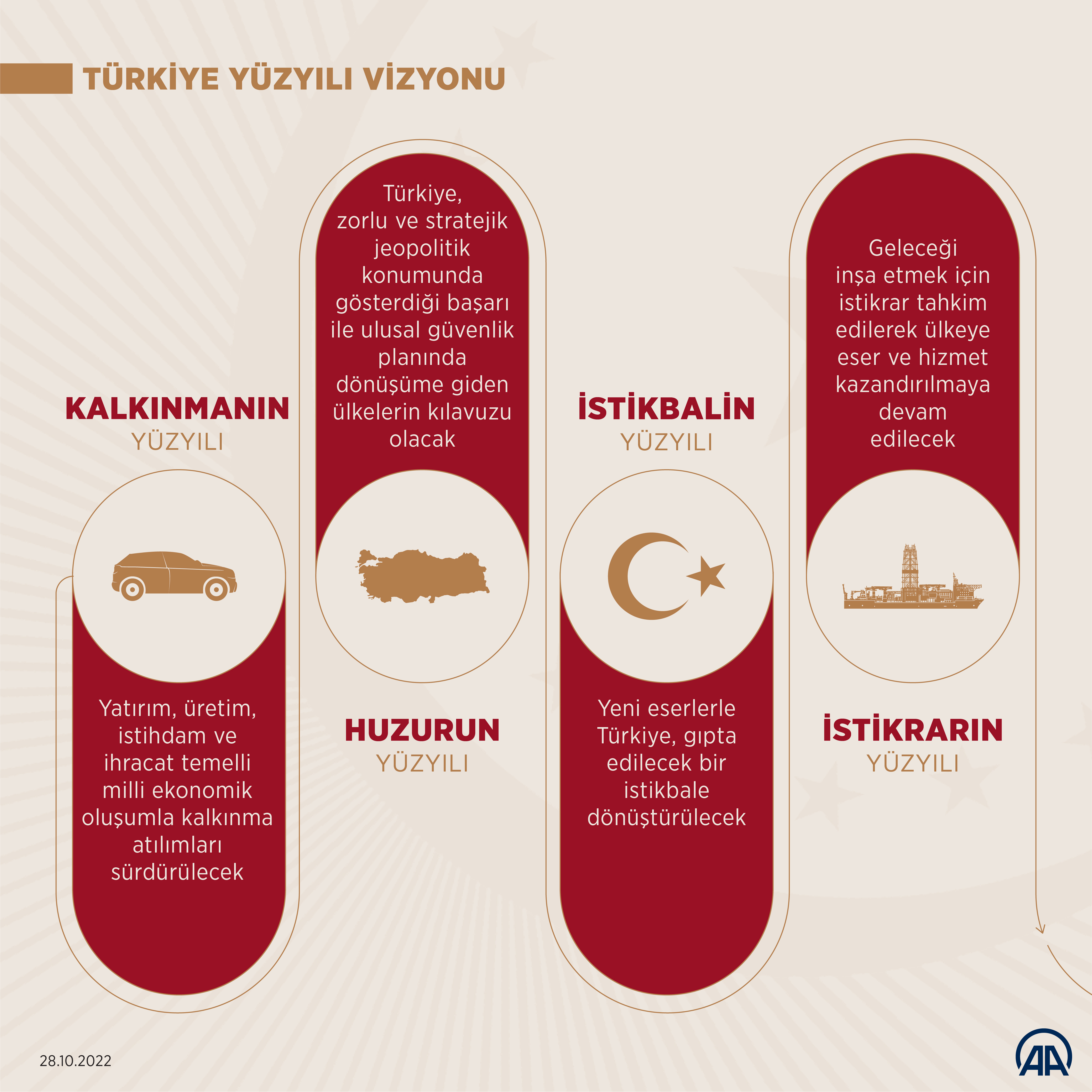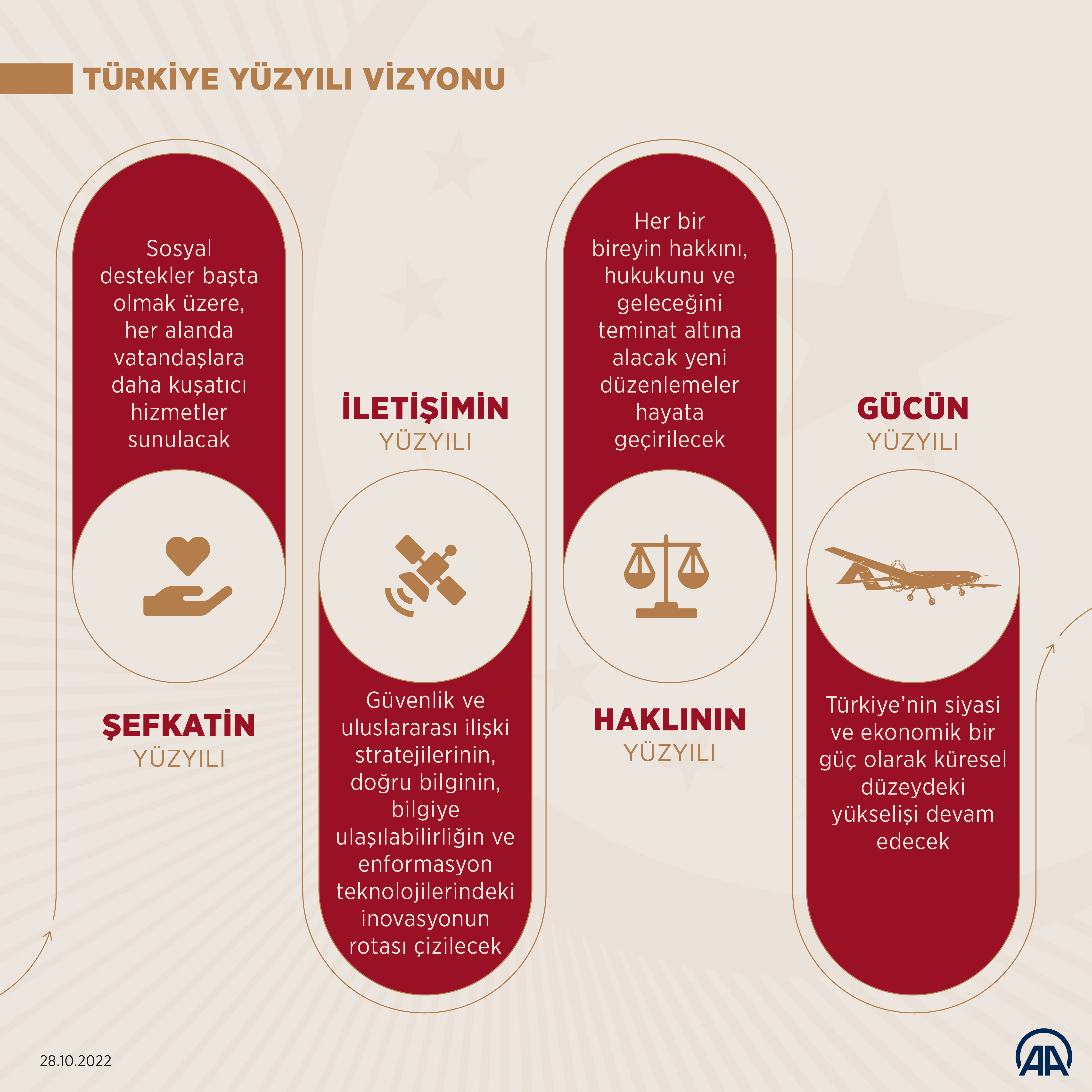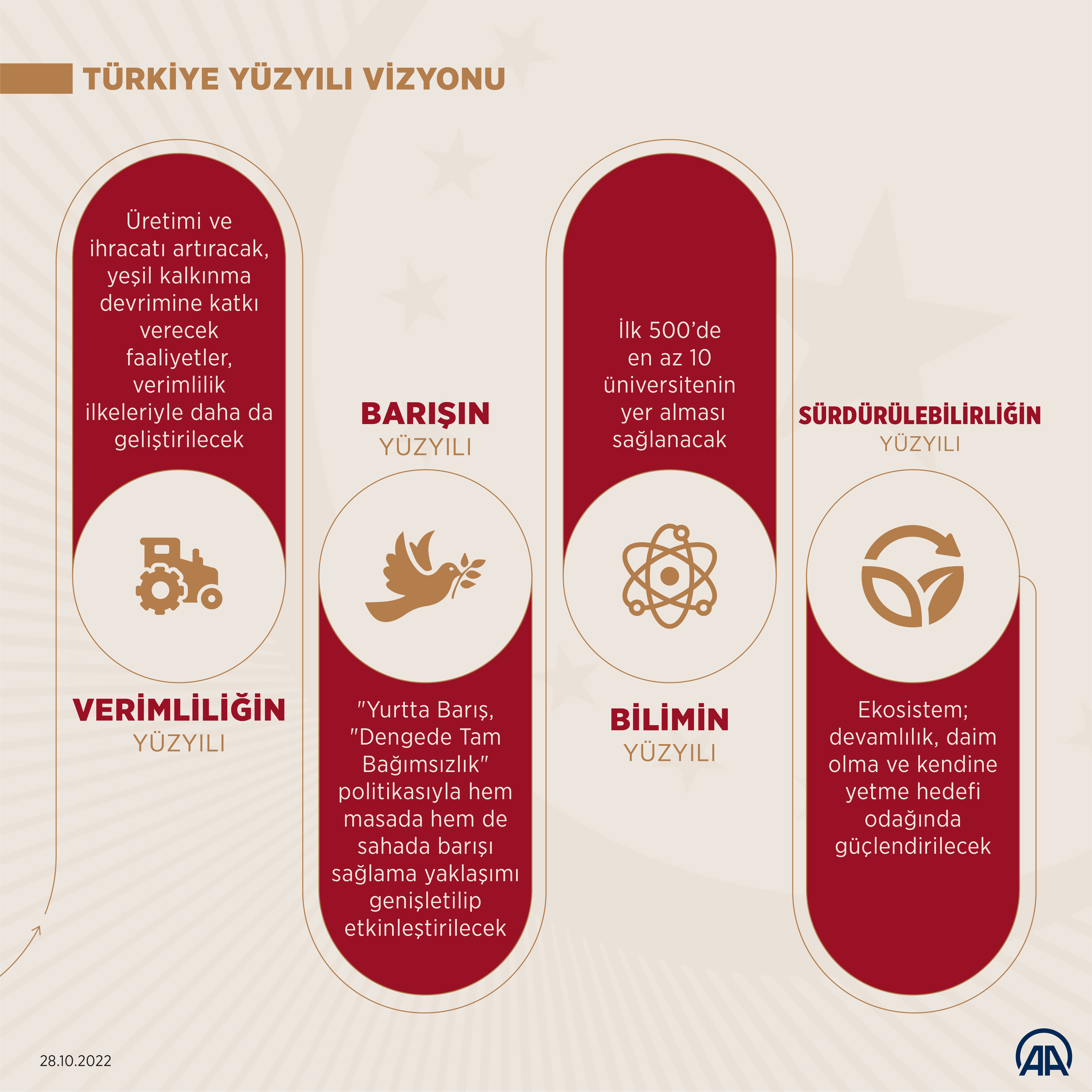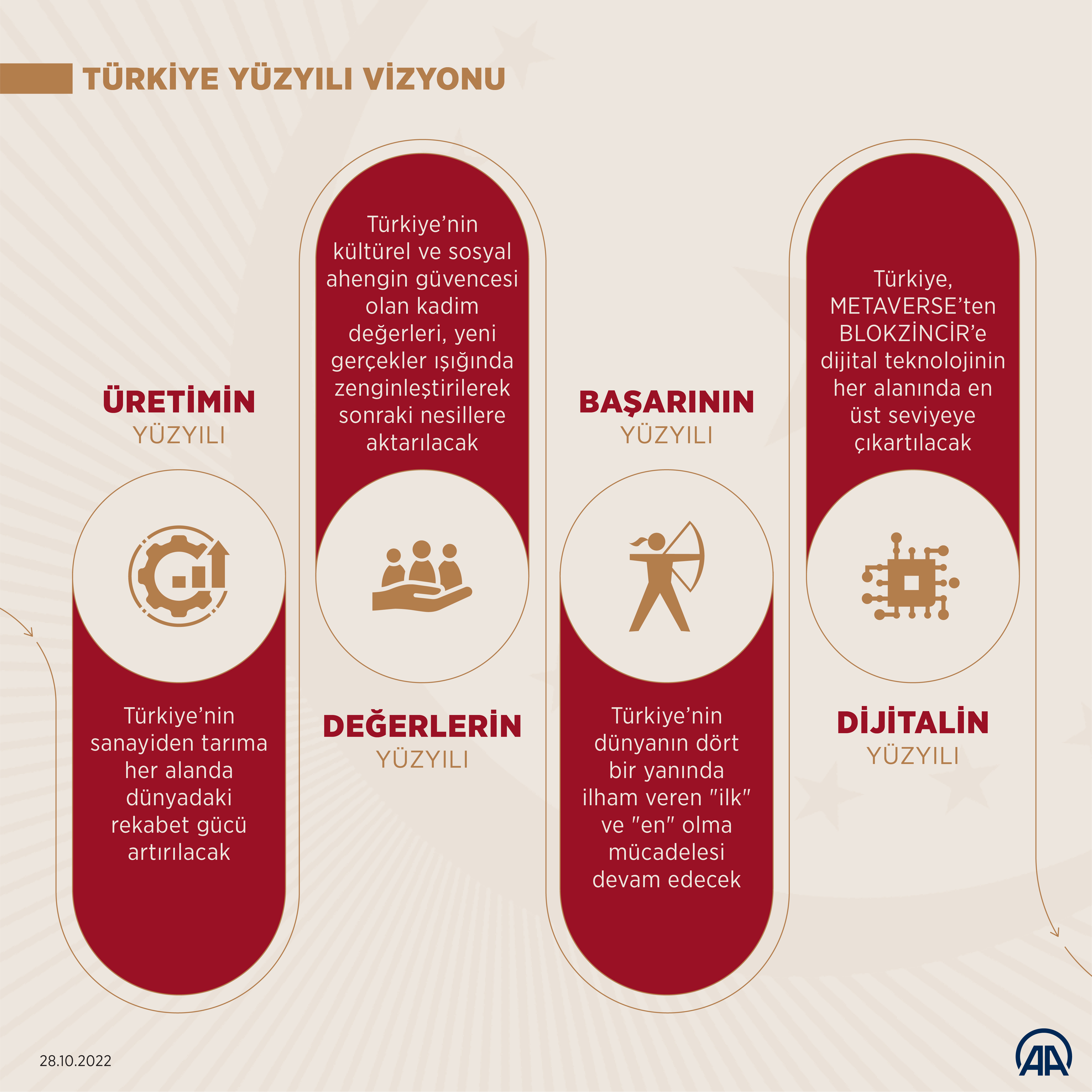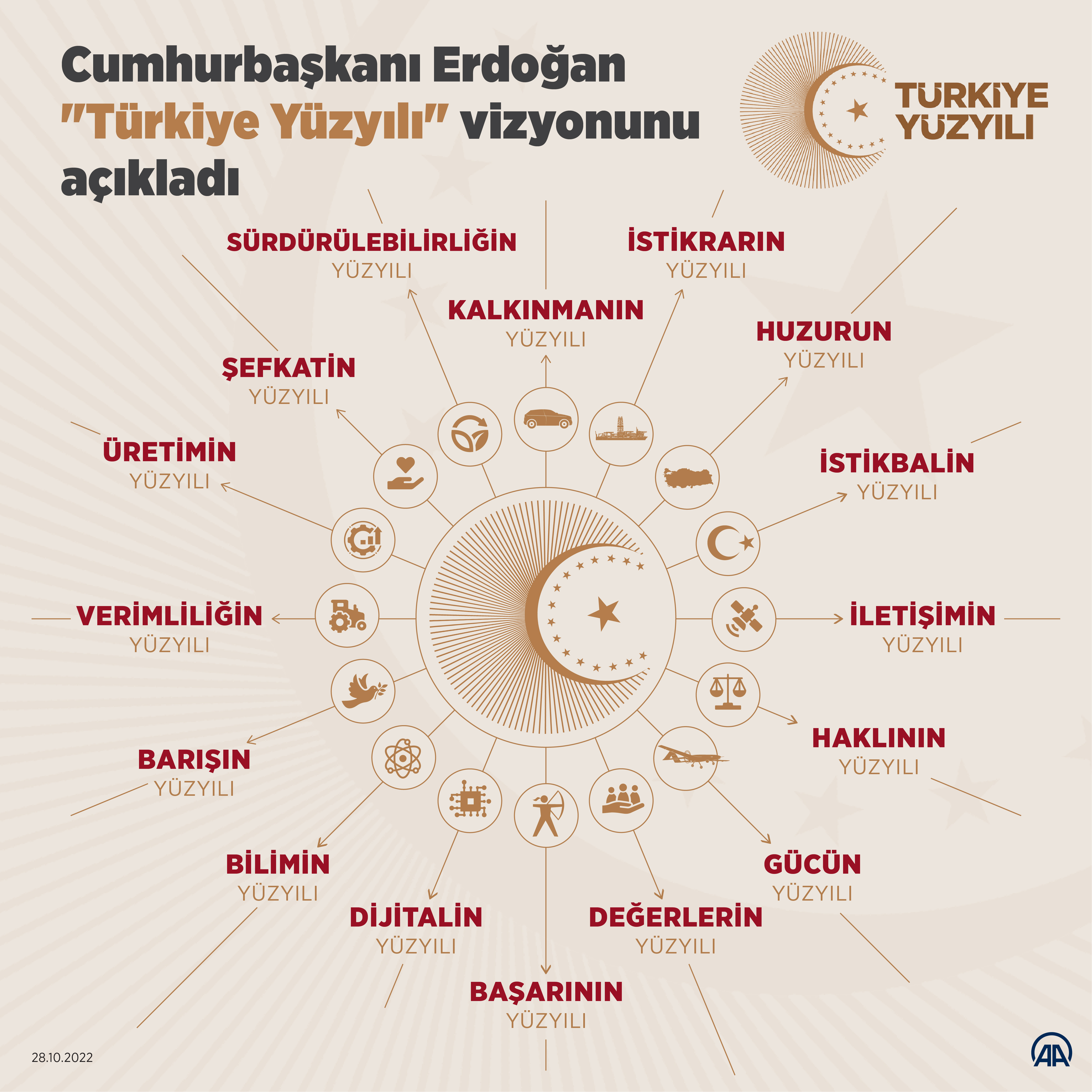 Türkiye Yüzyılı'nı, tüm bu kahramanların fedakârlıklarıyla sahip olunan güven ve huzur ikliminde yükselteceklerini belirten Cumhurbaşkanı Erdoğan, "Türkiye Yüzyılı'nı, ak saçlı büyüklerimizin, gönül coğrafyamızdaki dostlarımızın, el uzattığımız mazlumların dualarıyla yükselteceğiz. Türkiye Yüzyılı'nı, evlatlarının geleceği için yüreği kıpır kıpır çarpan annelerin, babaların hayallerini hayata geçirerek yükselteceğiz. Türkiye Yüzyılı'nı, gençlerimizin teknolojiden sanata, spordan çevreye kadar tüm alanlardaki beklentilerini karşılayarak yükselteceğiz. Türkiye Yüzyılı'nı, milli ve manevi değerlerimiz temelinde maziden atiye kurduğumuz köprüyü, insani ve ahlaki sütunlarla tahkim ederek yükselteceğiz. Türkiye Yüzyılı'nı, ülkemizi siyasi, ekonomik, teknolojik, askeri, diplomatik her alanda dünyanın en büyük 10 devleti arasına çıkartarak yükselteceğiz." değerlendirmesini yaptı.