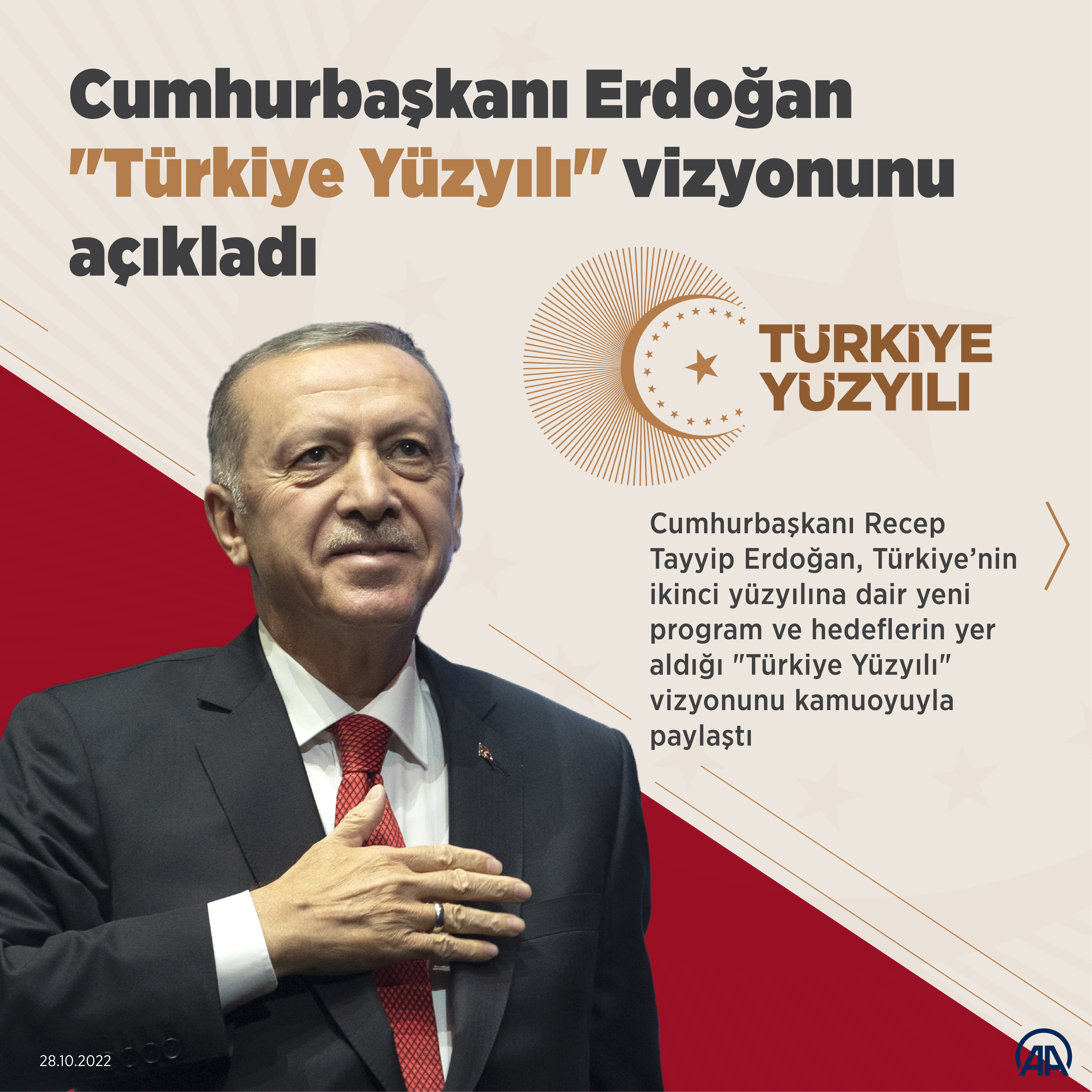 Allah'a her gün, her an, böyle bir milletin mensubu olma şerefini bahşettiği için dua ettiğine işaret eden Cumhurbaşkanı Erdoğan, "Milletimize kazandırdığımız eser ve hizmetleri, ona minnetimizi ifadenin sadece bir girizgâhı, sadece bir dibacesi olarak görüyoruz. Ömrümüzün 40 yılını siyasetçi, belediye başkanı, başbakan ve cumhurbaşkanı olarak hizmetine adadığımız insanımızın hakkını ne yapsak ne etsek ödeyemeyeceğimizi biliyoruz. Türkiye Yüzyılı vizyonumuz, bu borcun ifası yolunda aşkla girişilmiş yeni bir gayrettir. Dünyanın yeni ve hayati meydan okumalarla karşı karşıya olduğu şu dönemde, Türkiye Yüzyılı programımızla, Cumhuriyet'imizin yeni yüzyılına güçlü bir başlangıç yapmak istiyoruz." ifadelerini kullandı.