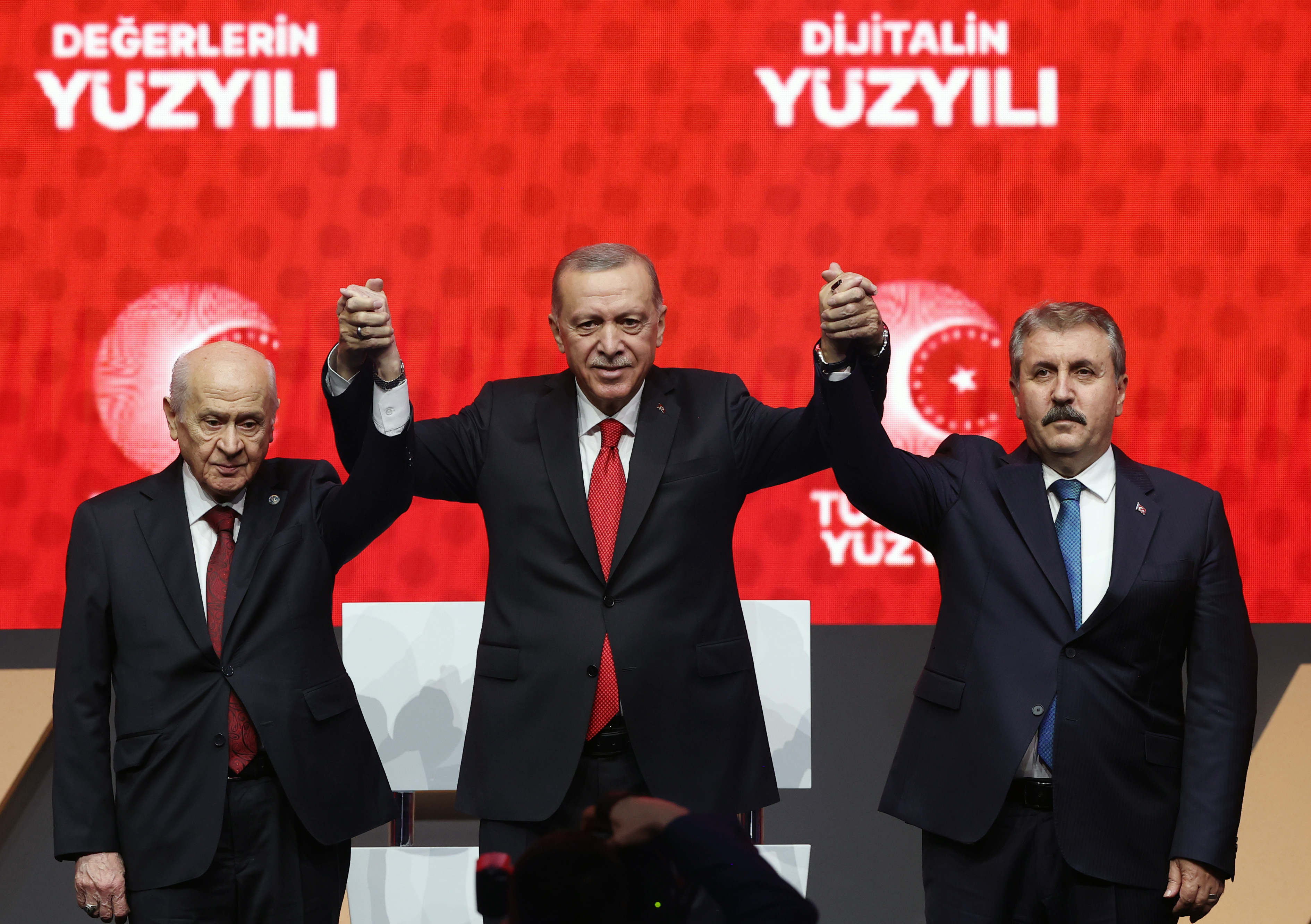Konuşması 1 saat 35 dakika süren Cumhurbaşkanı Erdoğan, programın sonunda Bahçeli ve Destici ile katılımcıları selamlayarak fotoğraf çektirdi.
