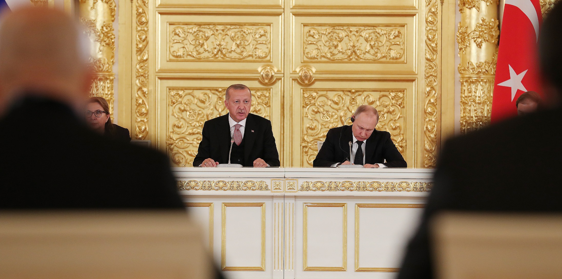 Cumhurbaşkanı Recep Tayyip Erdoğan ile Rusya Devlet Başkanı Vladimir Putin, Kremlin Sarayı'nda, Türk ve Rus iş dünyası temsilcileriyle bir araya geldi.