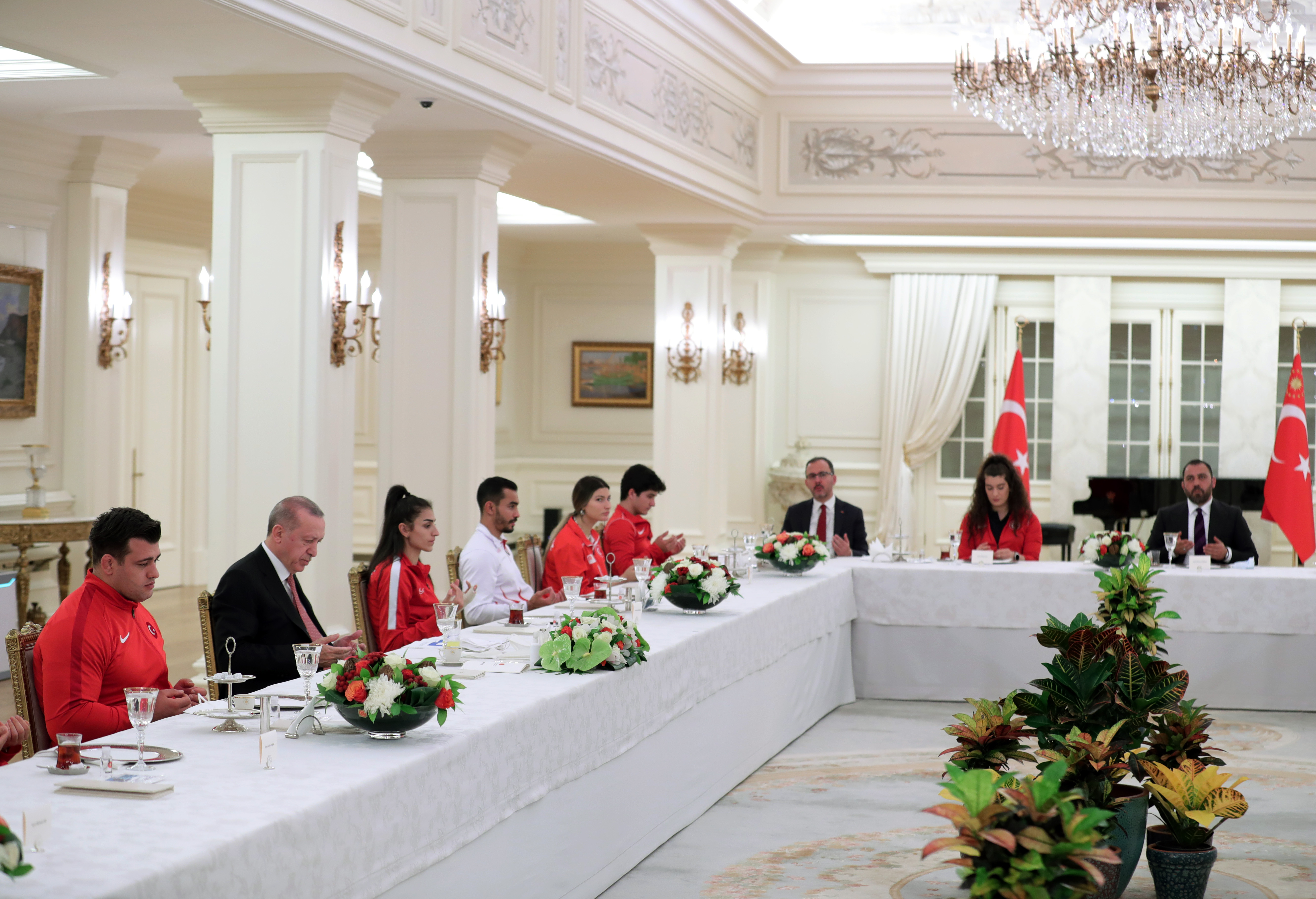 Çankaya Köşkü'nde, Gençlik ve Spor Bakanı Mehmet Muharrem Kasapoğlu'nun da hazır bulunduğu iftar yemeğine boks, eskrim, jimnastik, güreş, halter ve tekvando branşlarında madalya kazanan şu sporcular katıldı: