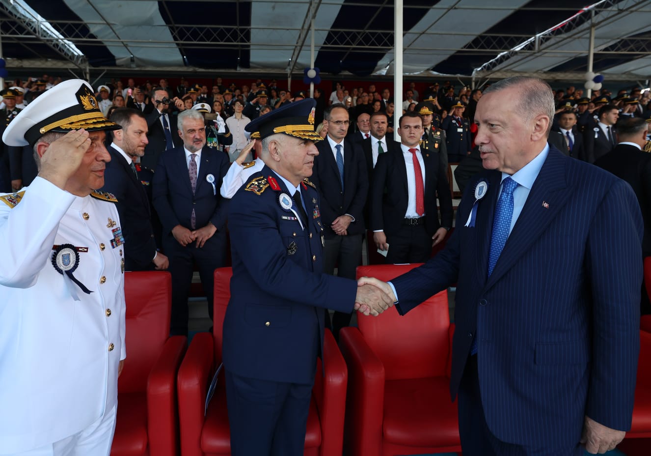 30 Ağustos Zafer Bayramı'nı Cumhurbaşkanlığı Külliyesi'nde kutladıklarına vurgu yapan Cumhurbaşkanı Erdoğan, "Milletin evinde dualarla, marşlarla yine büyük bir coşkuyla kutladık. Dün Kara Harp Okulumuzun hem mezuniyet sevincini paylaştık hem de inşası tamamlanan yaklaşık 1500 kişi kapasiteli camimizi ibadete açtık. Bugün önce Deniz Harp Okulumuzda bahriyelilerimize diplomalarını takdim ettik, şimdi de sizlerin mezuniyet heyecanına ortak oluyoruz." diye konuştu.