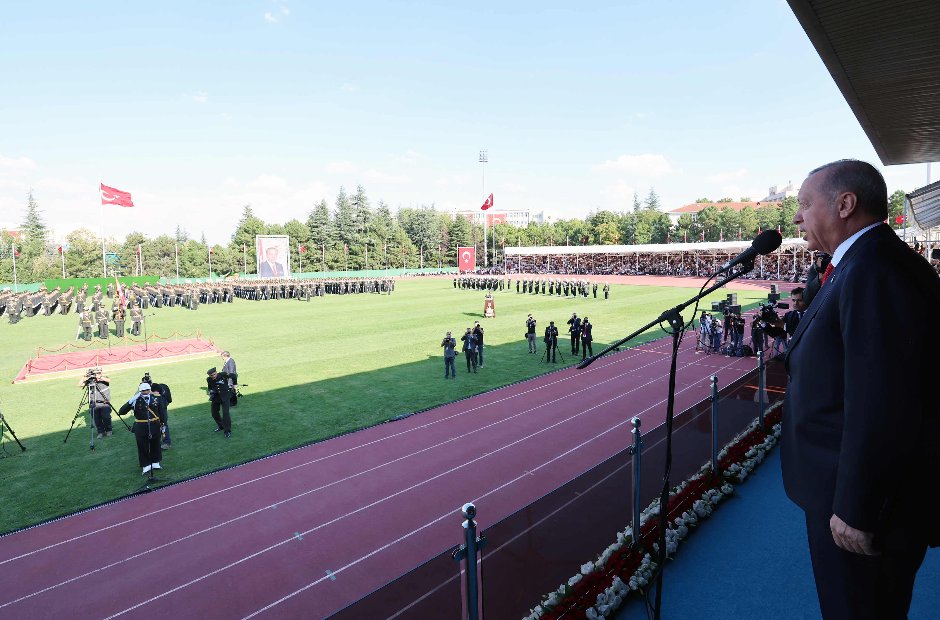 Osman Yüksel Serdengeçti'nin "Bir kahraman bekliyoruz" şiirinden "Kal'a gibi dik başın bulutlarla yarışsın, dalga dalga saçların rüzgârlarla karışsın, adını nakşedelim eski kadim surlara, sesini haykıralım asırdan asırlara. Ufukları kaplasın bayraklarımız al al, göklere zaferlerimizi çizsin vahşi bir kartal, kahramanlar büyüsün masalda dev misali, eğilsin öpsün gökler, canım nazlı hilali. Selam dursun karşısında bütün şerefler, şanlar, namını tebcil etsin yıldızlar, kehkeşanlar." mısralarını okuyan Cumhurbaşkanı Erdoğan, "Türkiye Cumhurbaşkanı ve Türk Silahlı Kuvvetleri’nin Başkomutanı olarak her birinizi kalpten tebrik ediyor, tek tek alınlarınızdan öpüyor, yeni görev yerlerinizde Mevla’dan başarılar diliyorum. Birincilikle mezun olan teğmenlerimizi ayrıca kutluyorum." dedi.