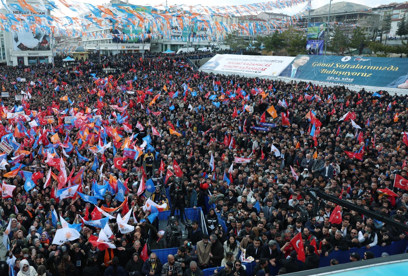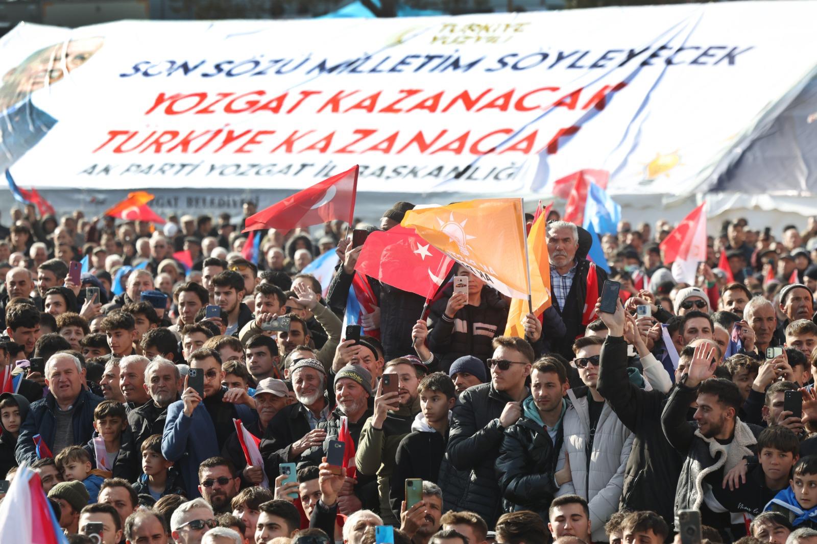 Yozgat'ın verdiği oy oranıyla Türkiye'de 4'üncü sıraya yerleştiğini ifade eden Cumhurbaşkanı Erdoğan, "Şimdi 31 Mart seçimlerinde Yozgat, aynı şekilde Allah'ın izniyle sandıkları patlatıyor mu? Celal Köse kardeşime gerekli olan desteği veriyor mu? İlçelerde aynı şekilde sandıkları patlatıyor muyuz? Sizlerin güvenine layık olmak için daha fazla çalışacağız. Yıllarca ihmal edilen, yıllarca kaderine terk edilen Yozgat'ımızın hak ettiği yerlere gelmesi için daha çok koşturacağız." ifadelerini kullandı.