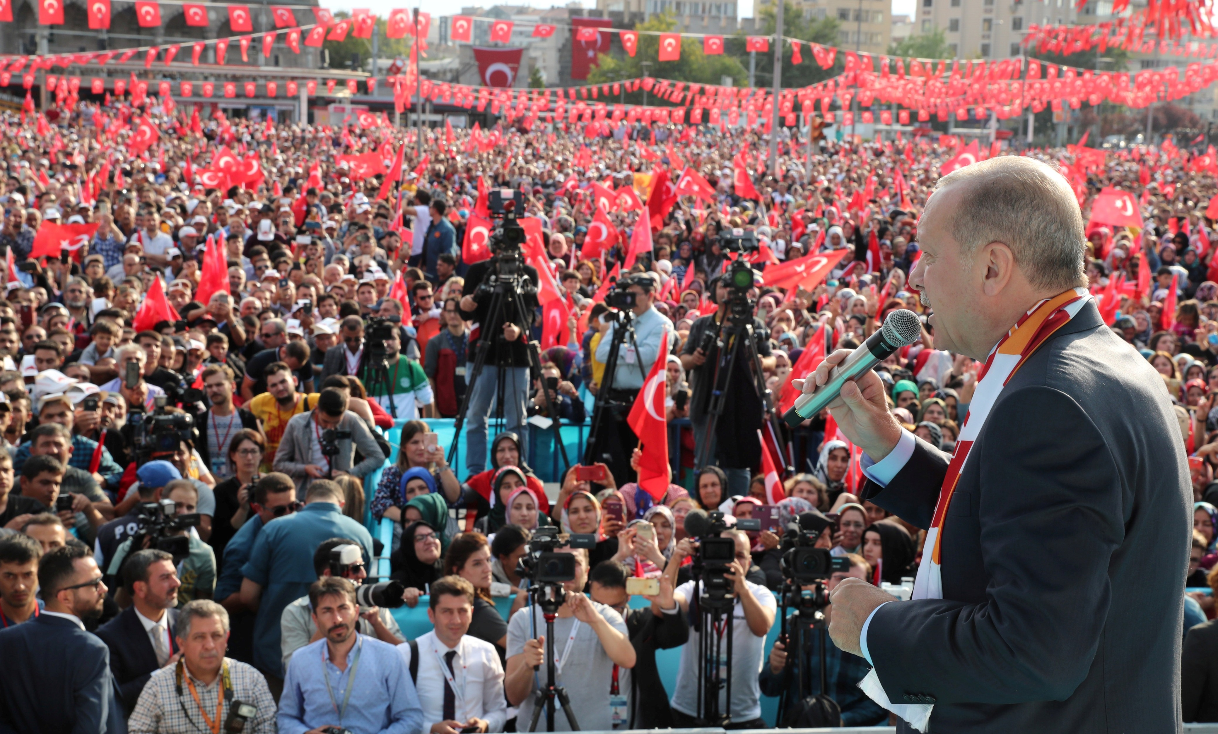 Türkiye'nin, tarihinin en önemli ve zorlu mücadelelerinden birini verirken Kayseri'den yükselen birlik, beraberlik, kararlılık sesinin dalga dalga tüm ülkeye yayıldığına olan inancını aktaran Erdoğan, "Anadolu'nun buğulu şehri sapasağlam arkamızda durdukça Allah'ın izniyle bizi yolumuzdan kimse alıkoyamaz. Bu millet, bir asır önce yedi düvel üzerine geldiğinde mücadeleden geri durmayı, teslim olmayı asla düşünmedi. Çanakkale'de, Kut'ül Amare'de, İstiklal harbimizde bu inançla dönemin düvel-i muazzama güçlerini dize getirmeyi başardık." diye konuştu.