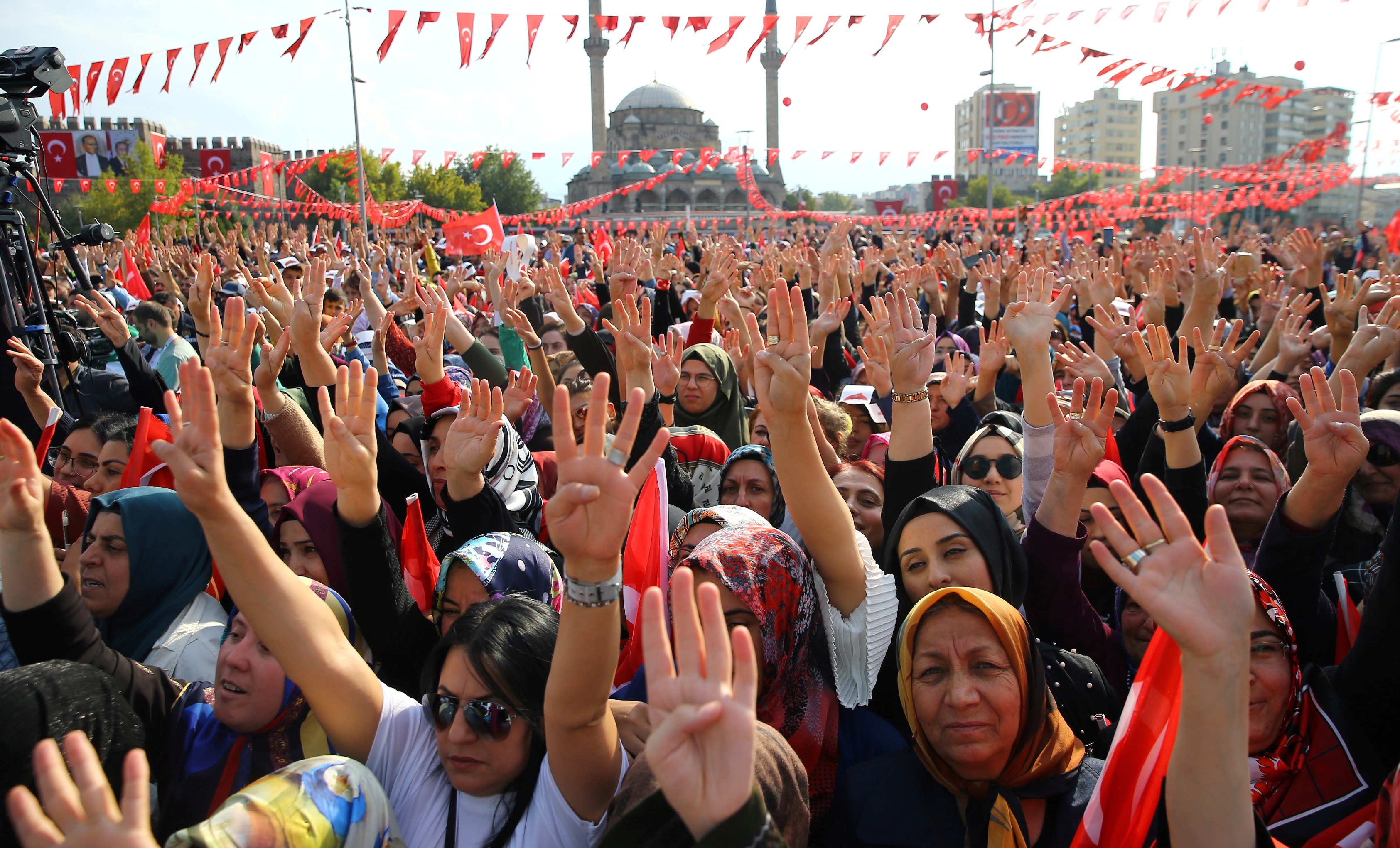 Cumhurbaşkanı Erdoğan, alandaki kadınları göstererek, "Bu Şerife bacılar oldukça tanıyacaklar. İstiklali ve istikbali için gerekirse baş verip baş eğmemeye hazır bu milleti tanıyacaklar. Kayseri'deki şu manzara, Kayseri'den yükselen bu ses birilerine ders olur." ifadelerini kullandı.
