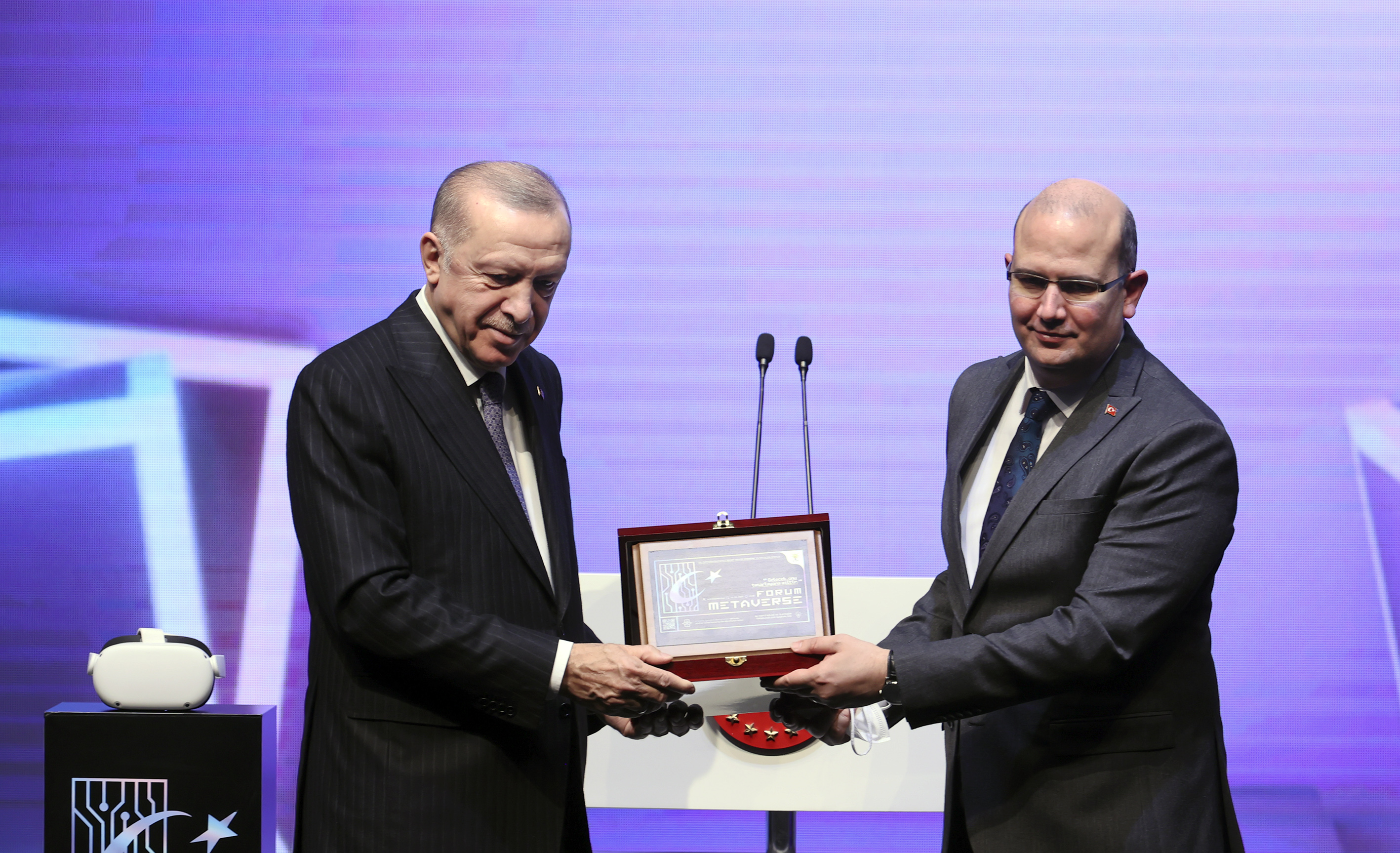 AK Parti Bilgi ve İletişim Teknolojilerinden Sorumlu Genel Başkan Yardımcısı Ömer İleri, Cumhurbaşkanı Erdoğan'a, Forum Metaverse etkinliğine ilişkin artırılmış gerçeklik teknolojisiyle hazırlanan davetiyeyi plaket olarak takdim etti.