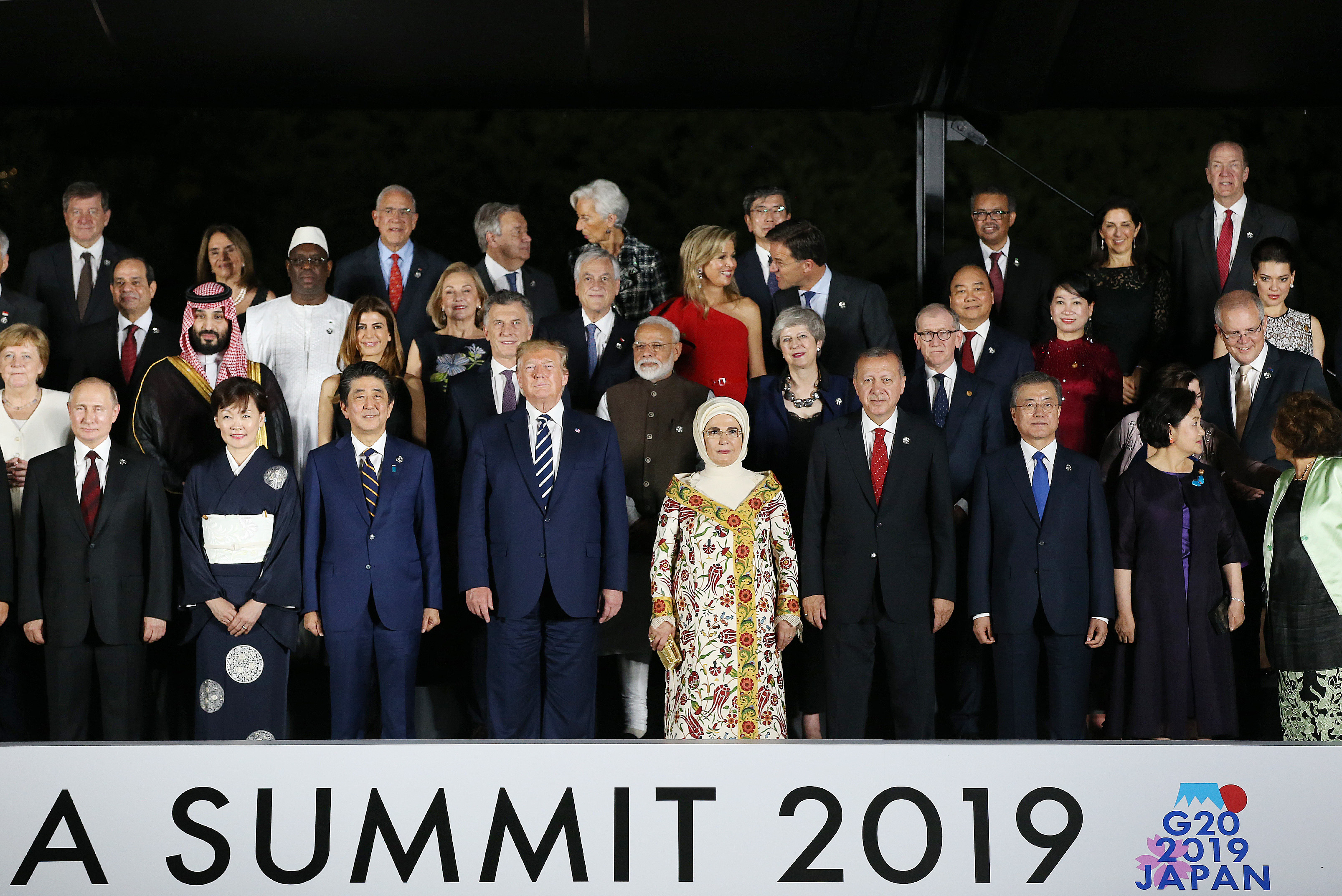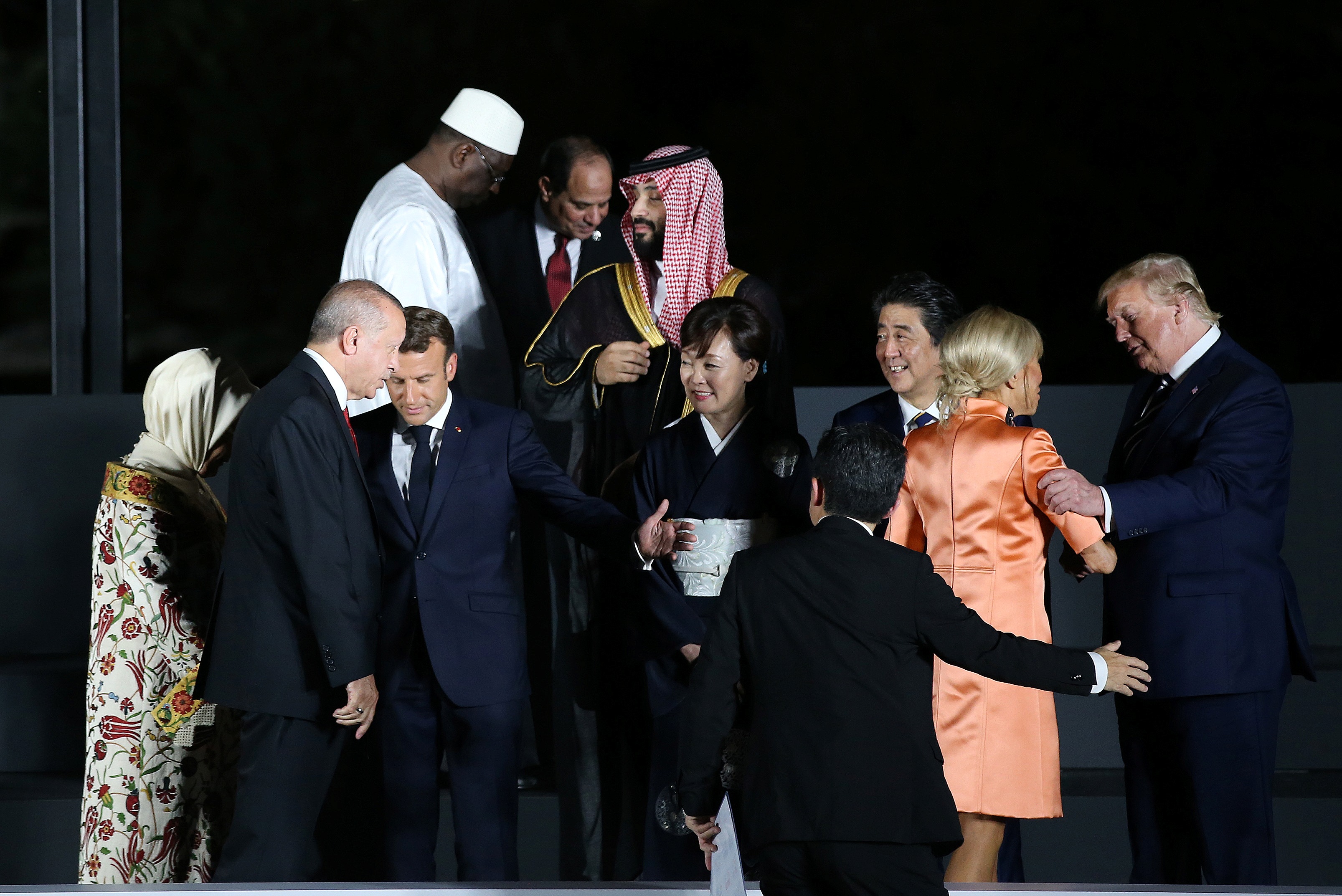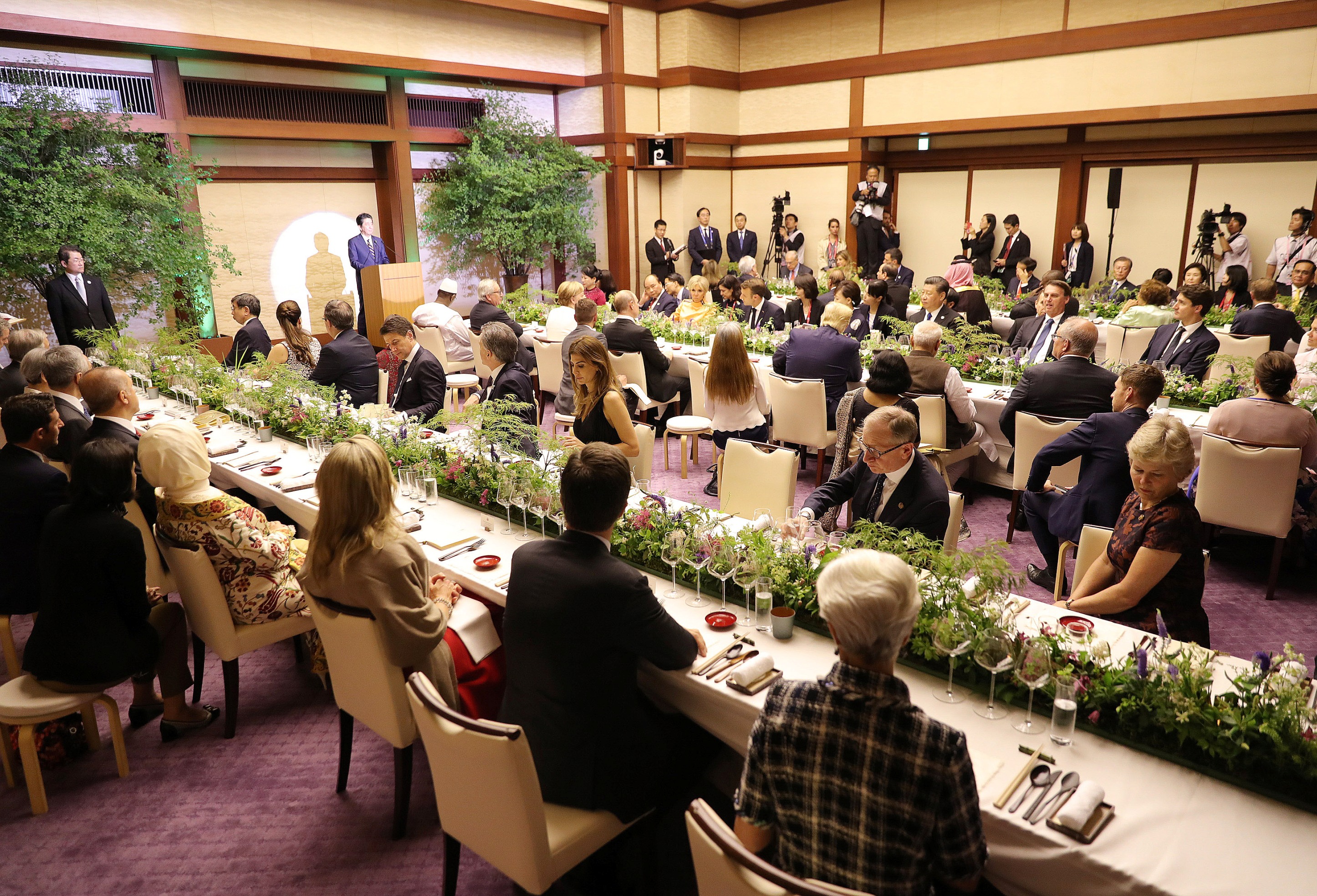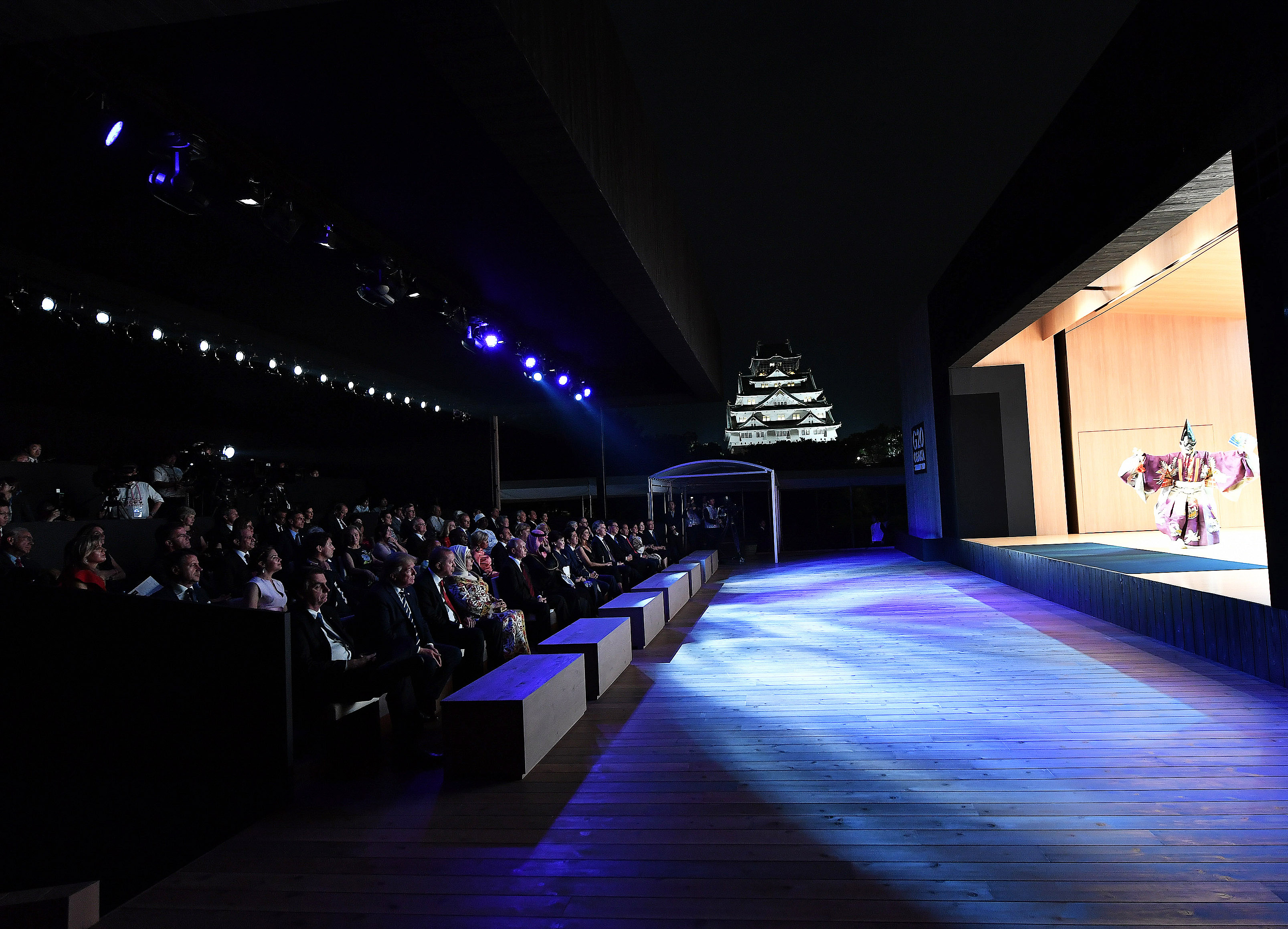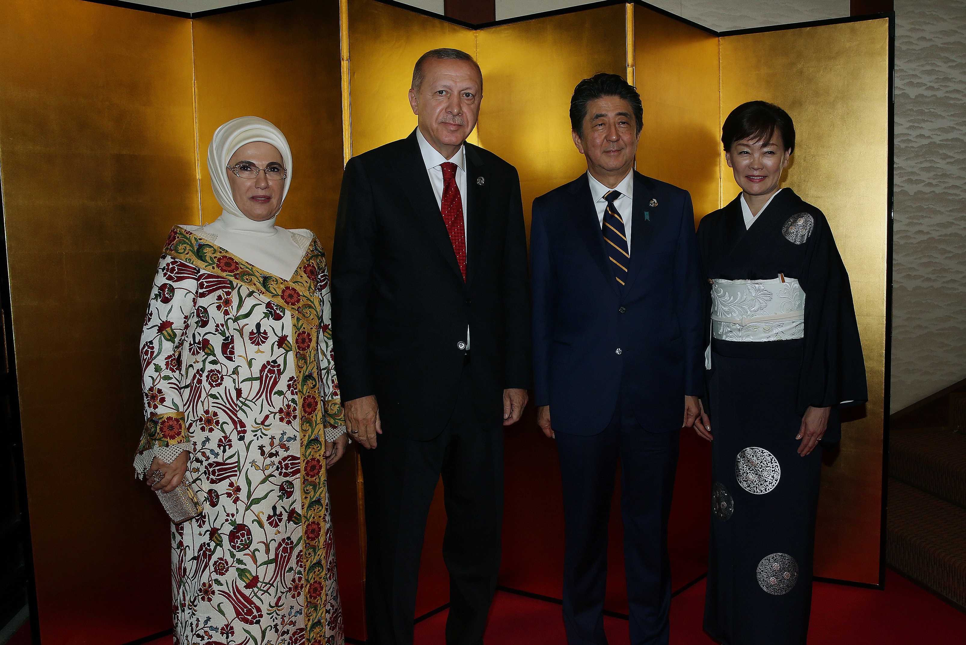 Kültürel etkinlik ve liderler yemeğine katılmak üzere Osaka Devlet Konukevi'ne gelen liderler ve eşleri Japonya Başbakanı Şinzo Abe ve eşi Akie Abe tarafından karşılandı.