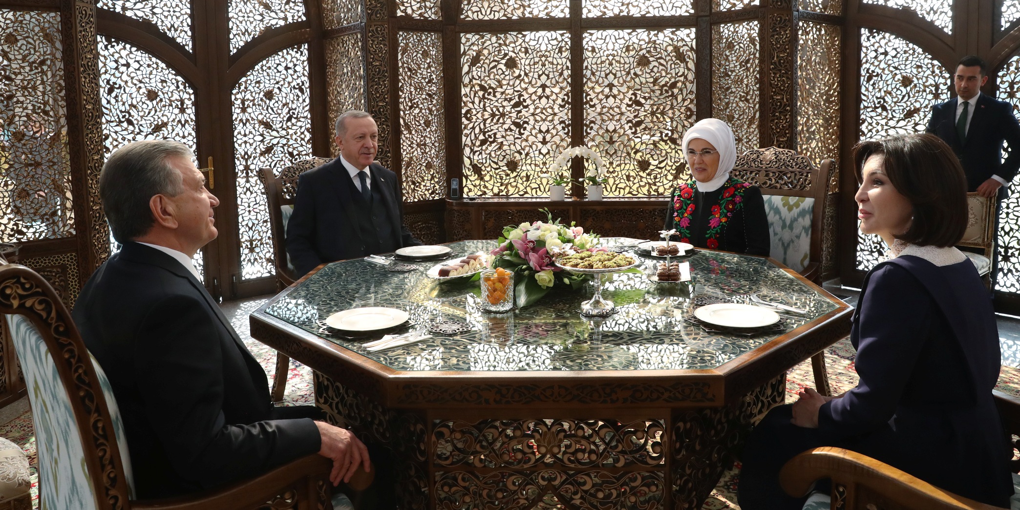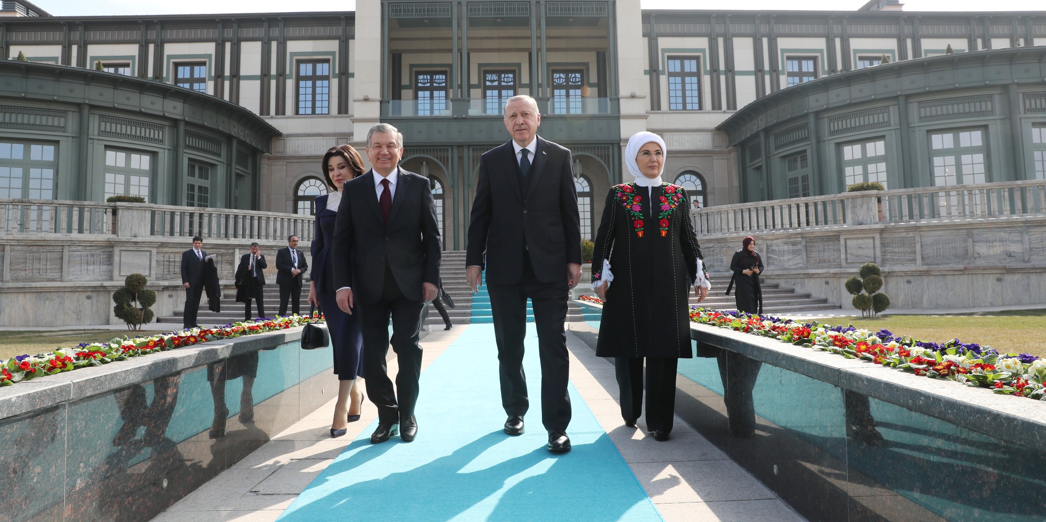 Erdoğan ve eşi Emine Erdoğan, Özbekistan Cumhurbaşkanı Mirziyoyev ve eşi Ziroat Mirziyoyeva'yı kapıda karşıladı.