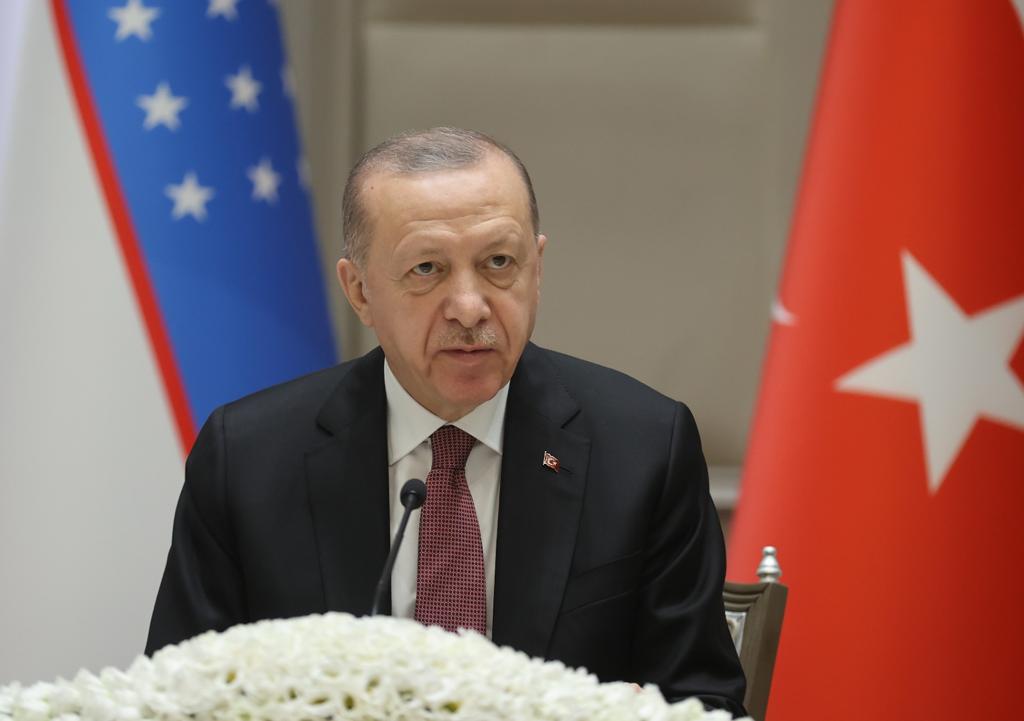 Özbekistan Cumhurbaşkanı Şevket Mirziyoyev ile imzaladıkları ortak bildirinin gelecek dönemde bir yol haritası teşkil edeceğinin altını çizen Cumhurbaşkanı Erdoğan, "Bugün ayrıca Türk Devletleri Teşkilatımız başta olmak üzere, uluslararası platformlarda dayanışmamızı, bölgesel meselelerde yakın temasımızı sürdürmemiz noktasında irademizi teyit ettik. Bizim ortak yanlarımız çok, özellikle beslendiğimiz kaynaklar aynı." diye konuştu.