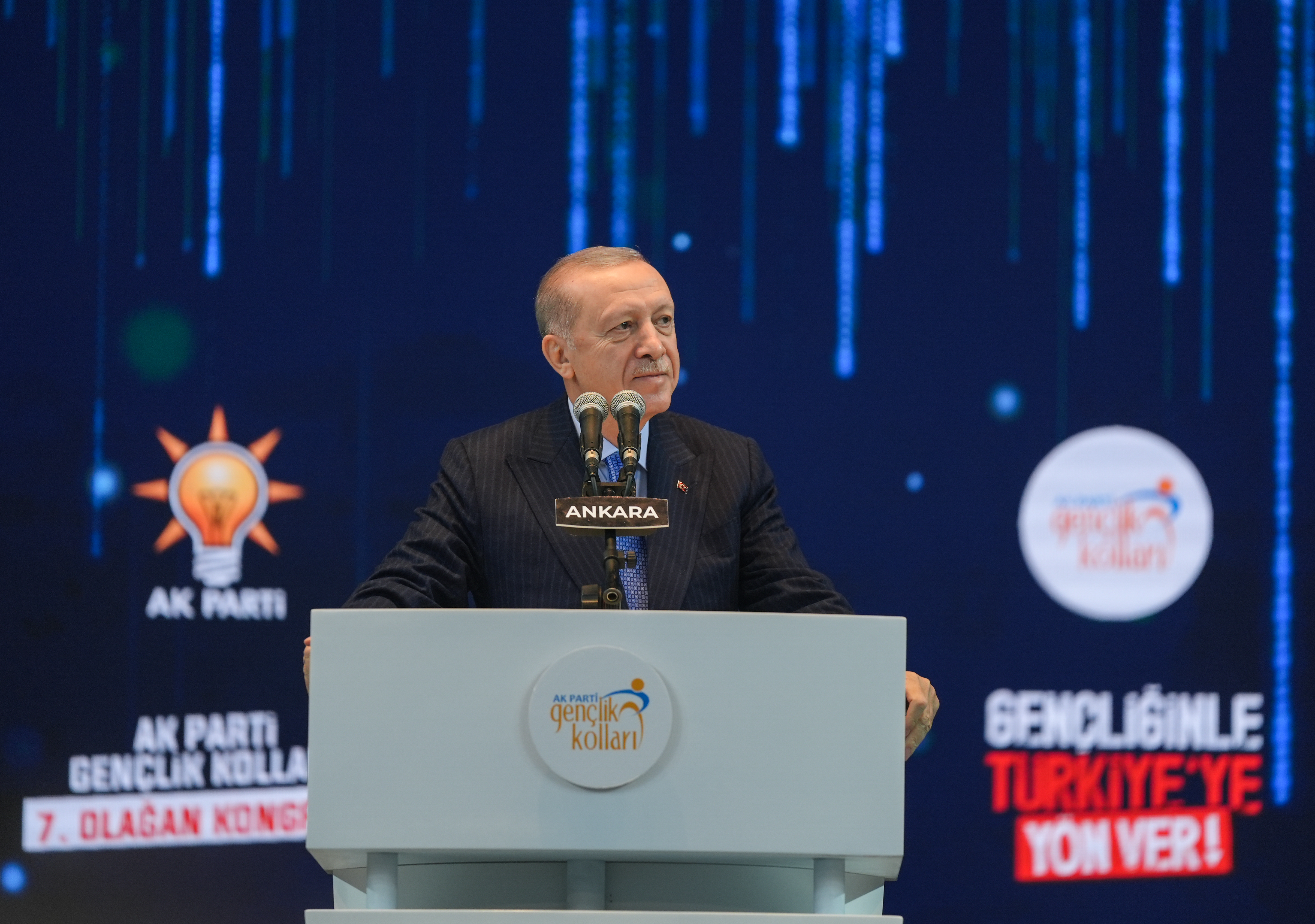 "14 Ağustos 2001'de milletimizin talebi ve duasıyla yola çıkarken refikimiz gençlerimizdir dedik. 3 Kasım 2002'de sessizlerin sesi, kimsesizlerin kimsesi olarak iktidara gelirken gençlerimizin başımızın üstünde yeri vardır dedik." ifadelerini kullanan Cumhurbaşkanı Erdoğan, siyasi hayatları ve iktidarları boyunca daima gençlerle yol yürüdüklerini, onlara yoldaşlık ettiklerini söyledi.