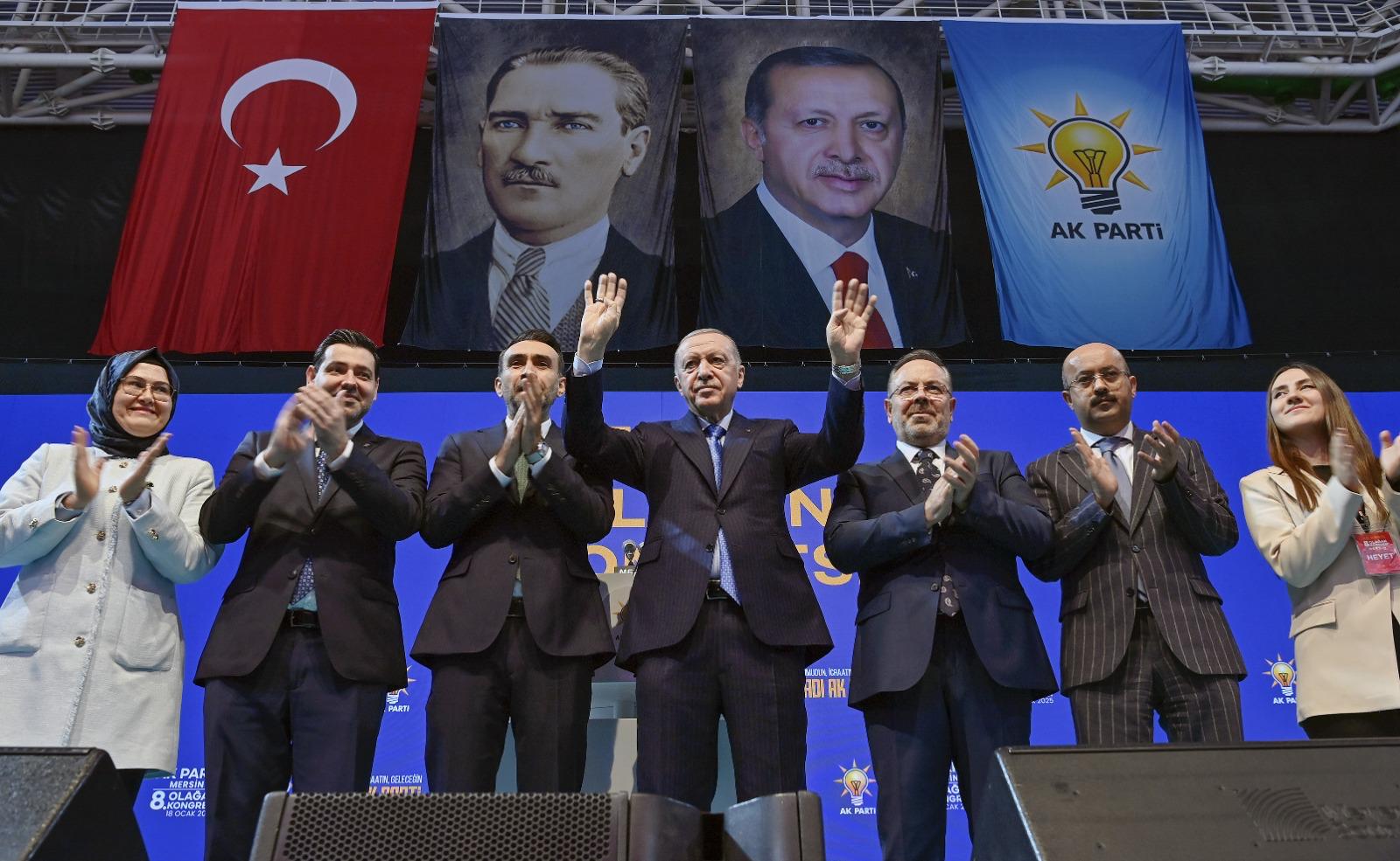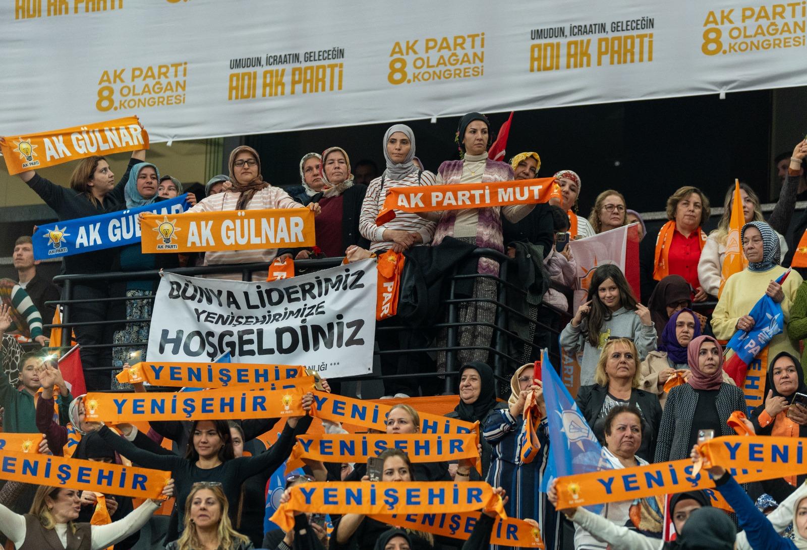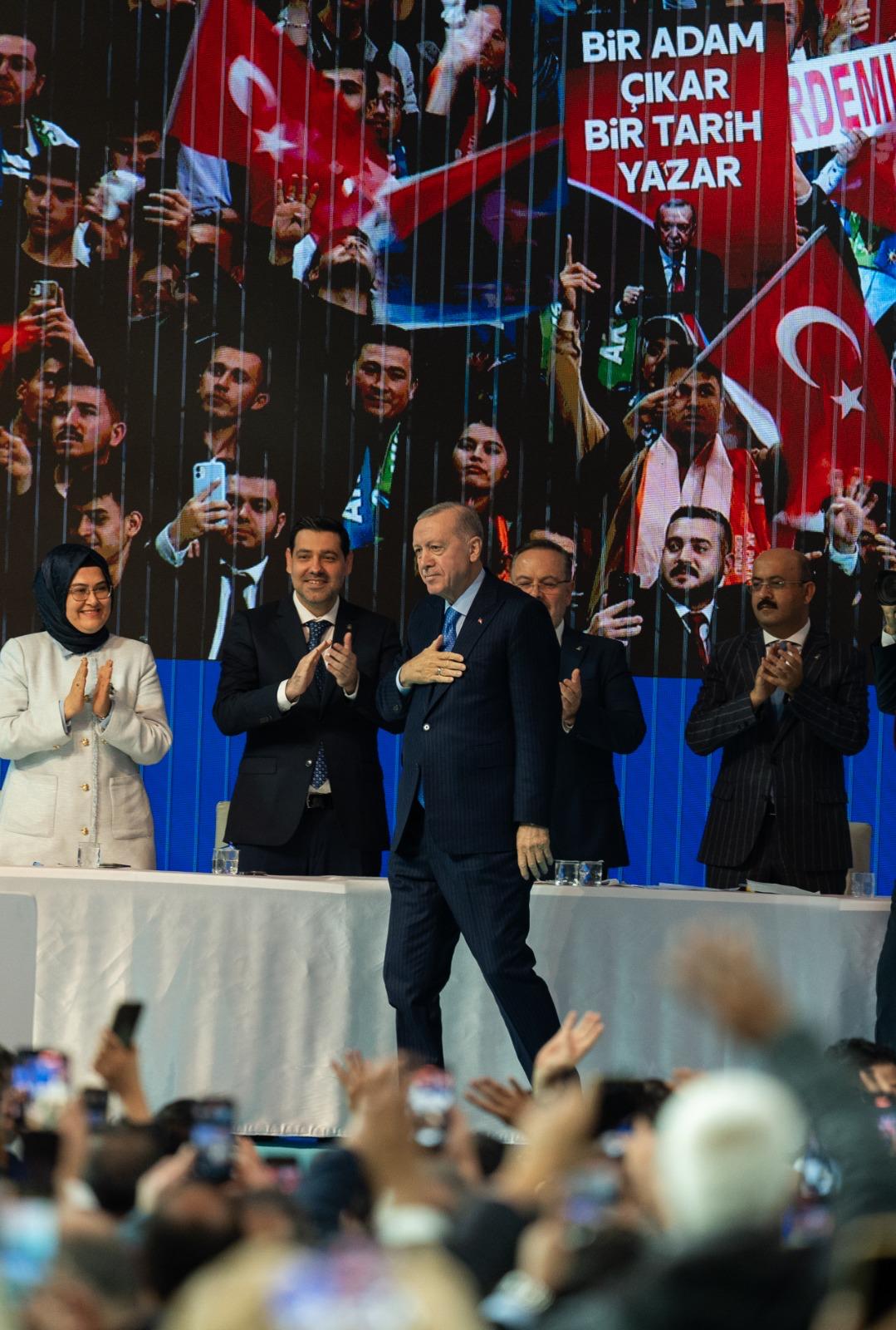 Türk bayrakları ve AK Parti flamalarıyla donatılan salonda, "Erdoğan sahnede diğerleri hani nerede?", "Eski Türkiye'ye bay bay, Türkiye Yüzyılı'na hay hay" ve "Dünya siyasetine format atan lider" pankartları yer aldı.