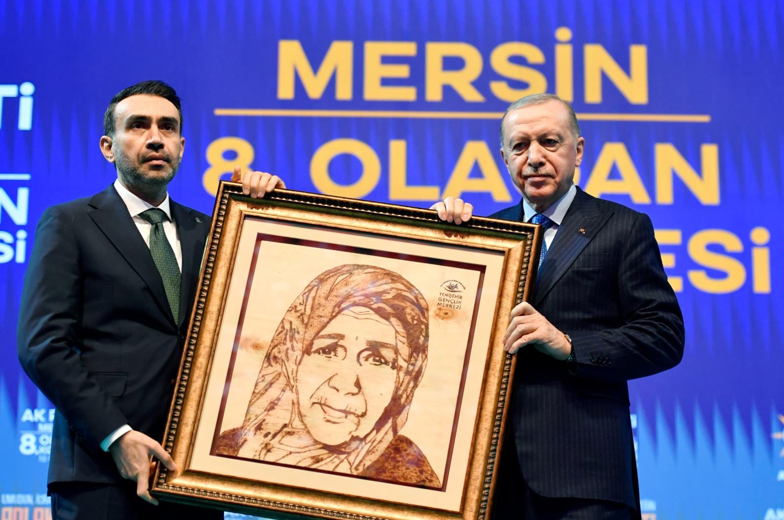Cumhurbaşkanı Erdoğan, konuşmaya başladığı sırada, kendisinin gençlik fotoğrafının yer aldığı ve "Ben de özledim ben de resmin var şu an elimde sana koşmak isterim" yazılı pankartla koreografi yapıldı. AK Parti Mersin İl Başkanı Adem Aldemir, Cumhurbaşkanı Erdoğan'a bir tablo armağan etti.