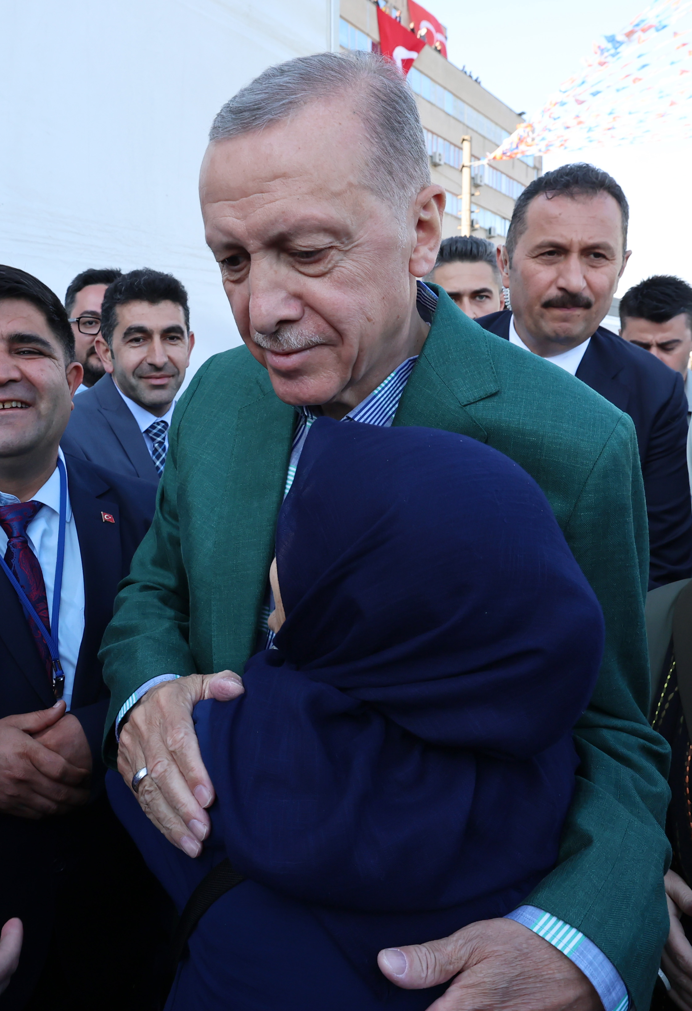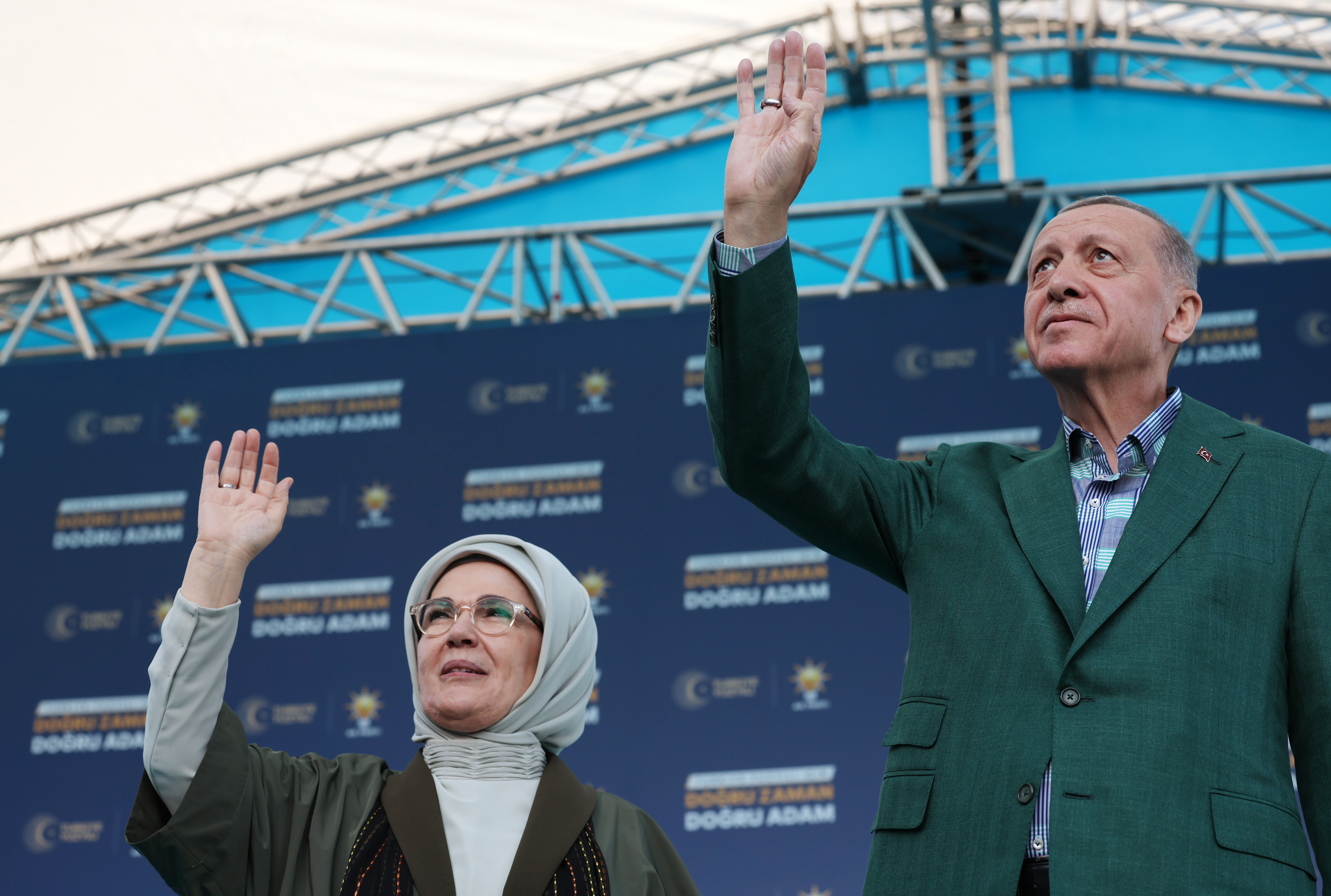 Partisinin Tekirdağ Çerkezköy'de düzenlenen mitinginde eşi Emine Erdoğan ile sahneye çıkan Cumhurbaşkanı ve AK Parti Genel Başkanı Recep Tayyip Erdoğan, Cengiz Kurtoğlu'nun "Duyanlara Duymayanlara" şarkısına eşlik etti.