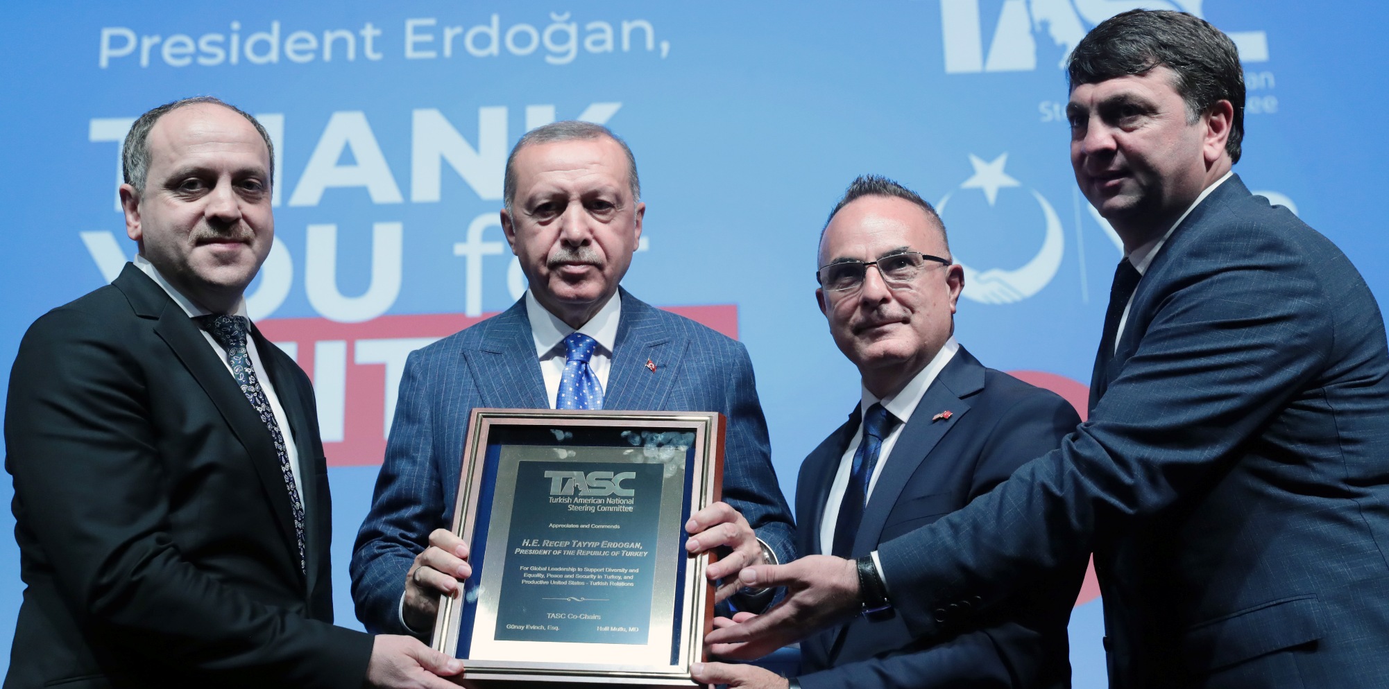 Konuşmanın ardından Cumhurbaşkanı Erdoğan'a Türk-Amerikan Ulusal Yönlendirme Komitesi yöneticileri tarafından hediye takdim edildi.