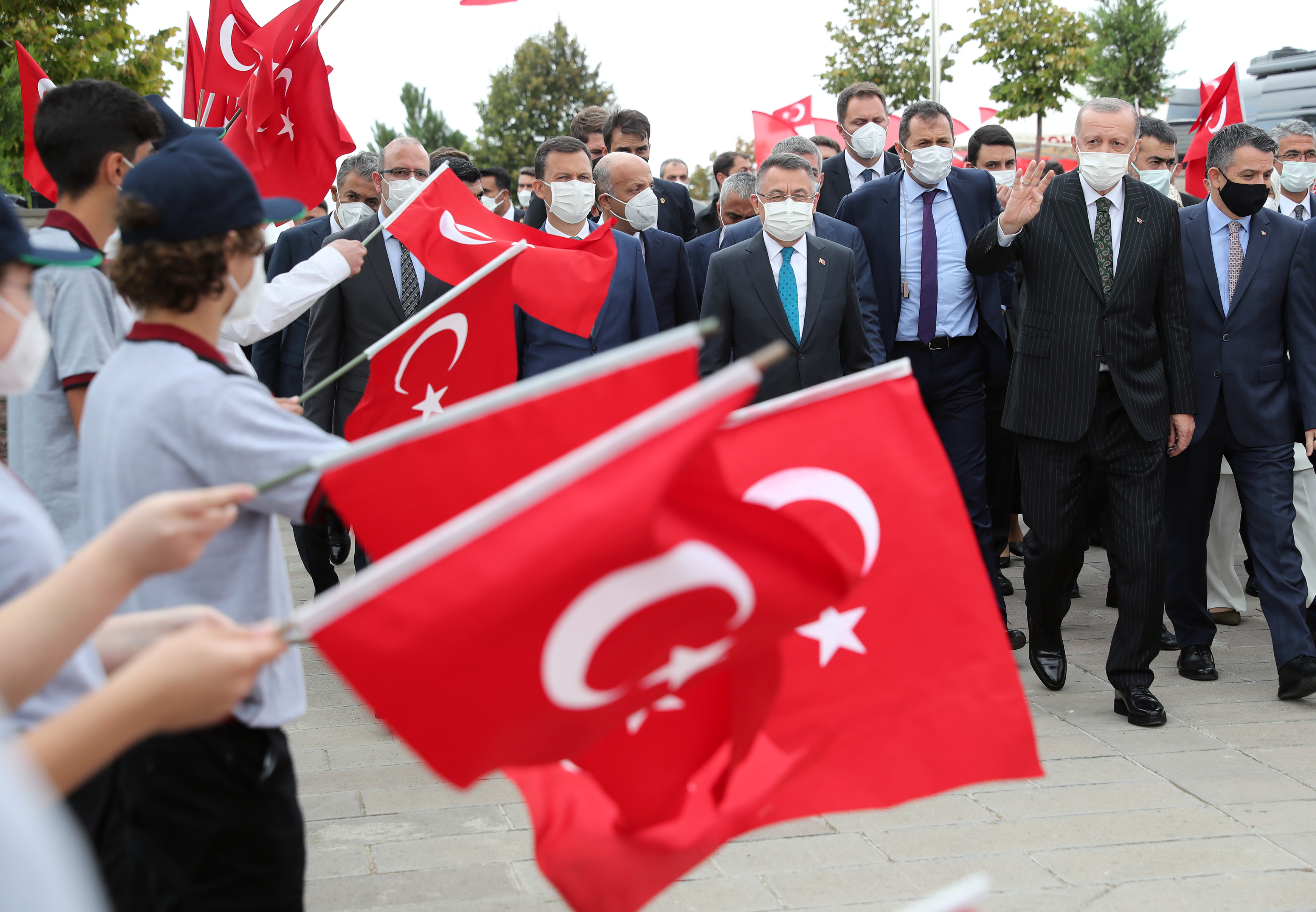 Cumhurbaşkanı Erdoğan, Duatepe Anıtı'na gelişinde elinde Türk bayrağı olan gençler tarafından karşılandı.