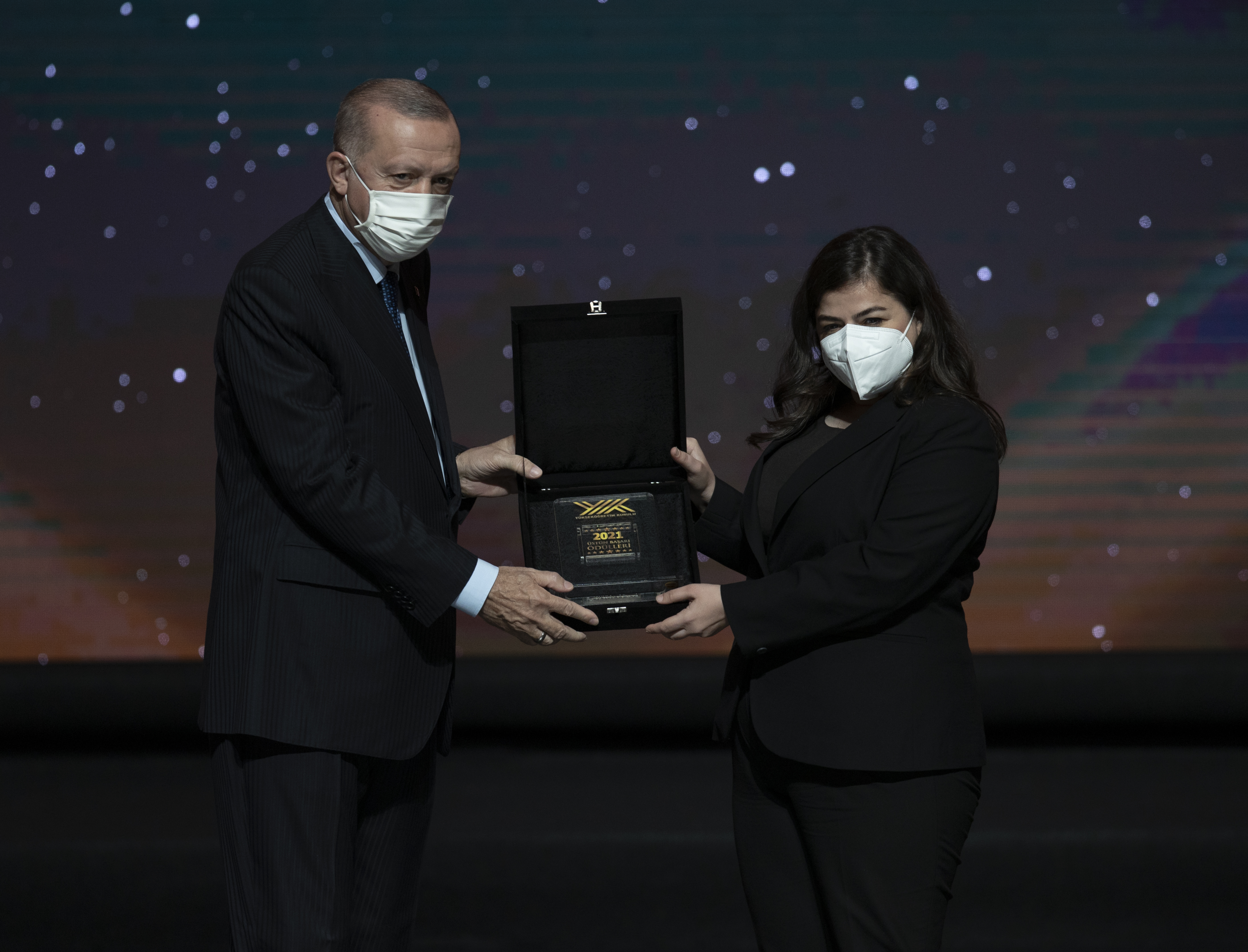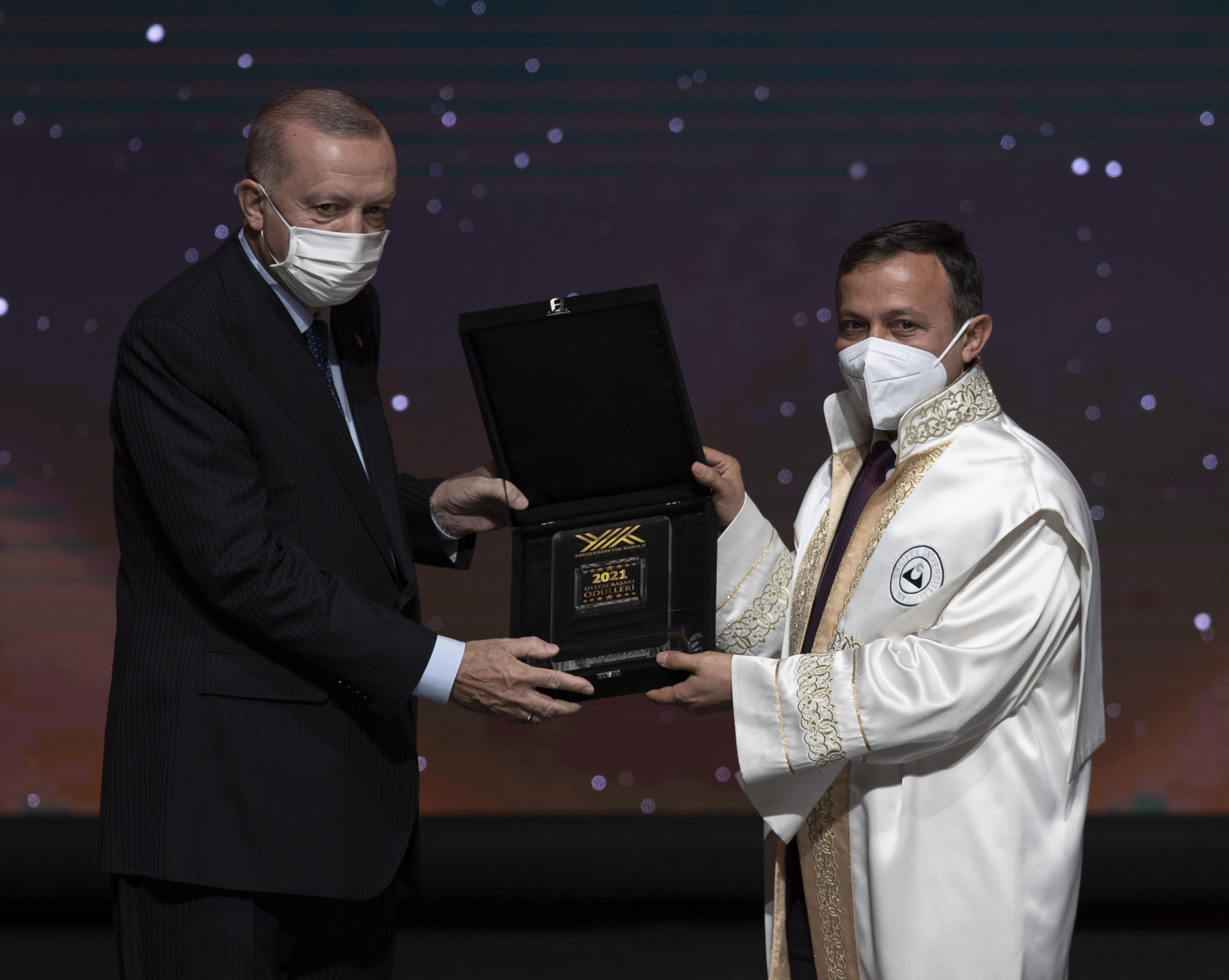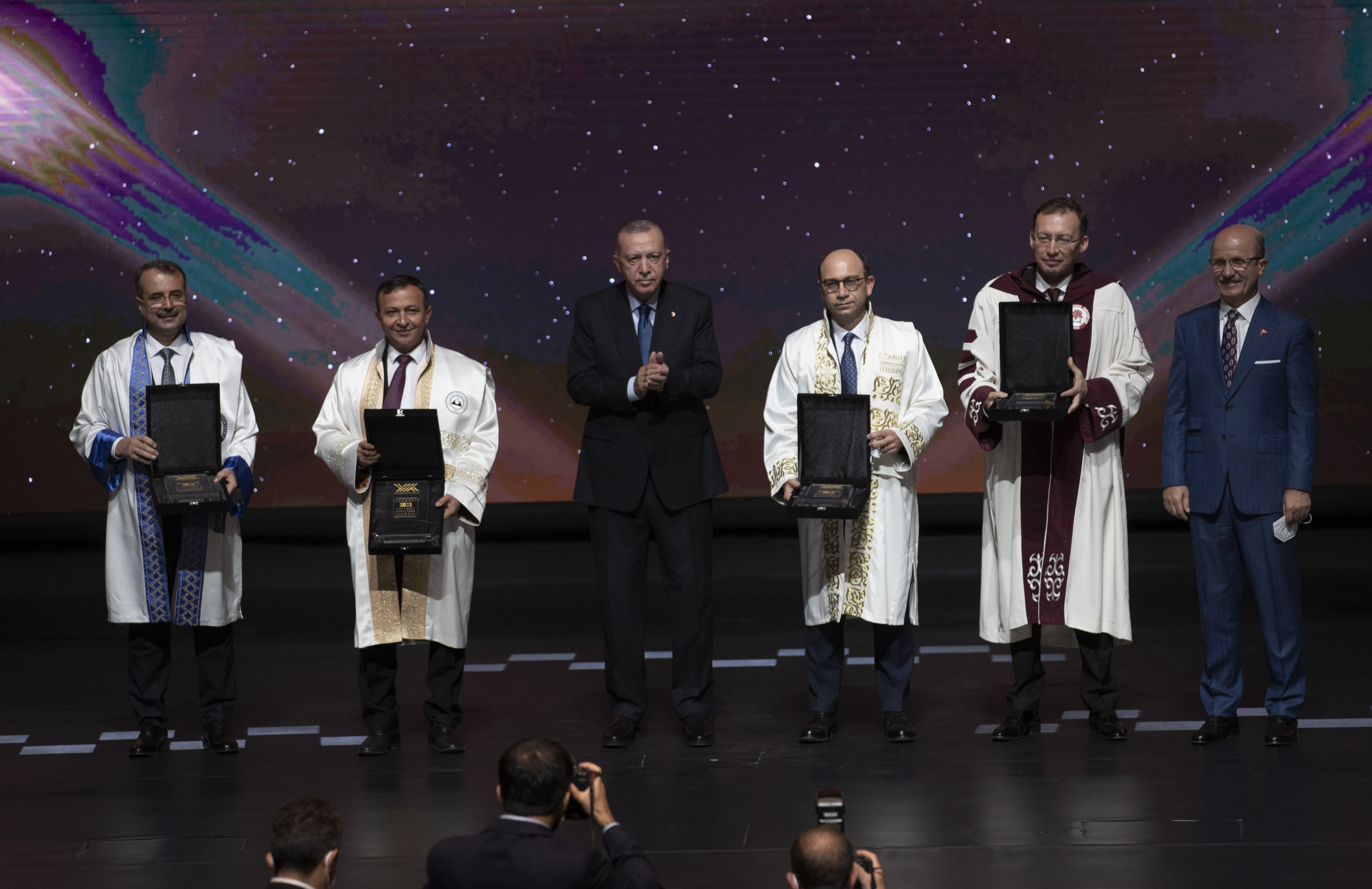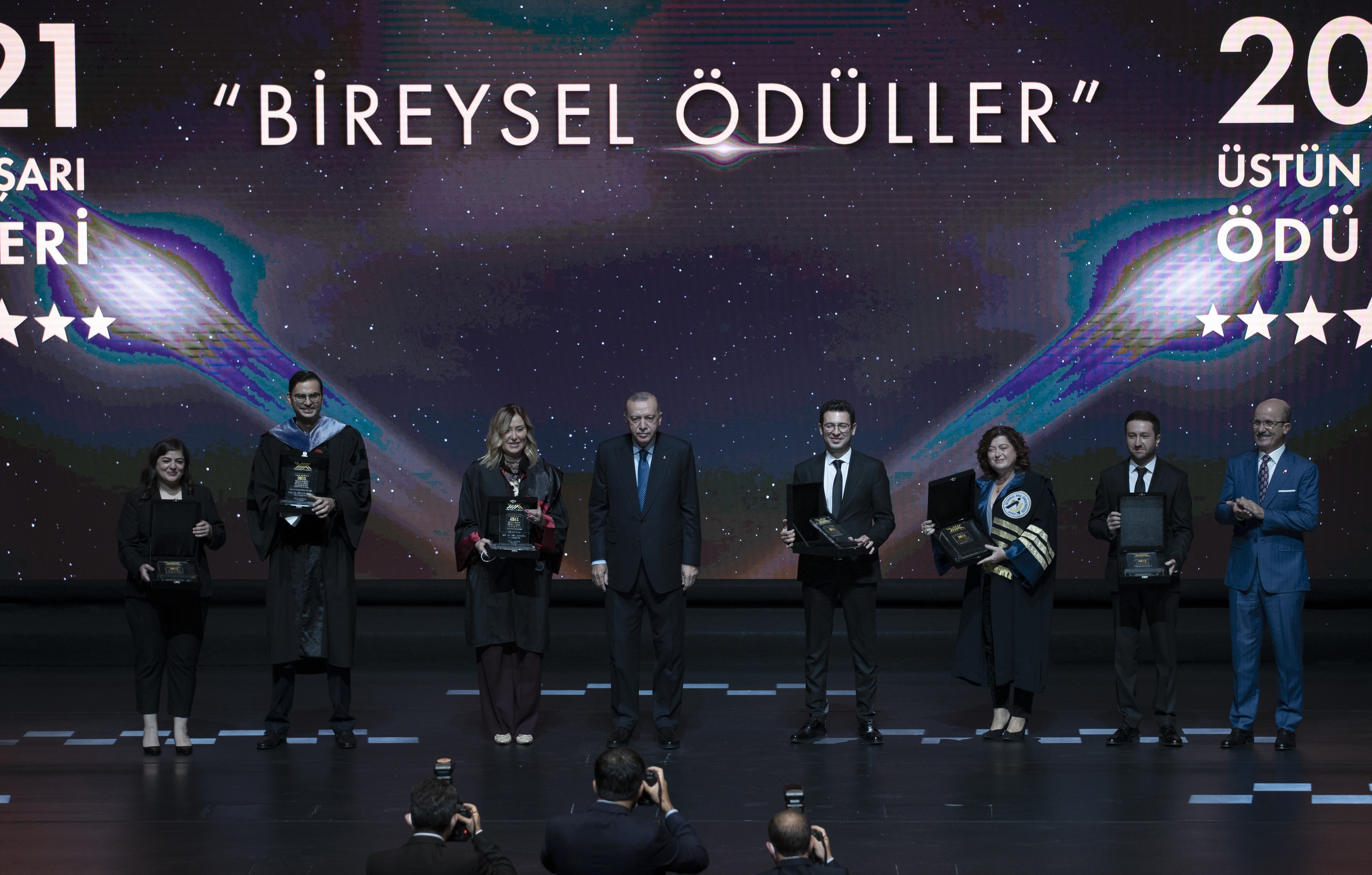 Cumhurbaşkanı Erdoğan, hitabının ardından YÖK Üstün Başarı Ödüllerini almaya hak kazanlara verdi.