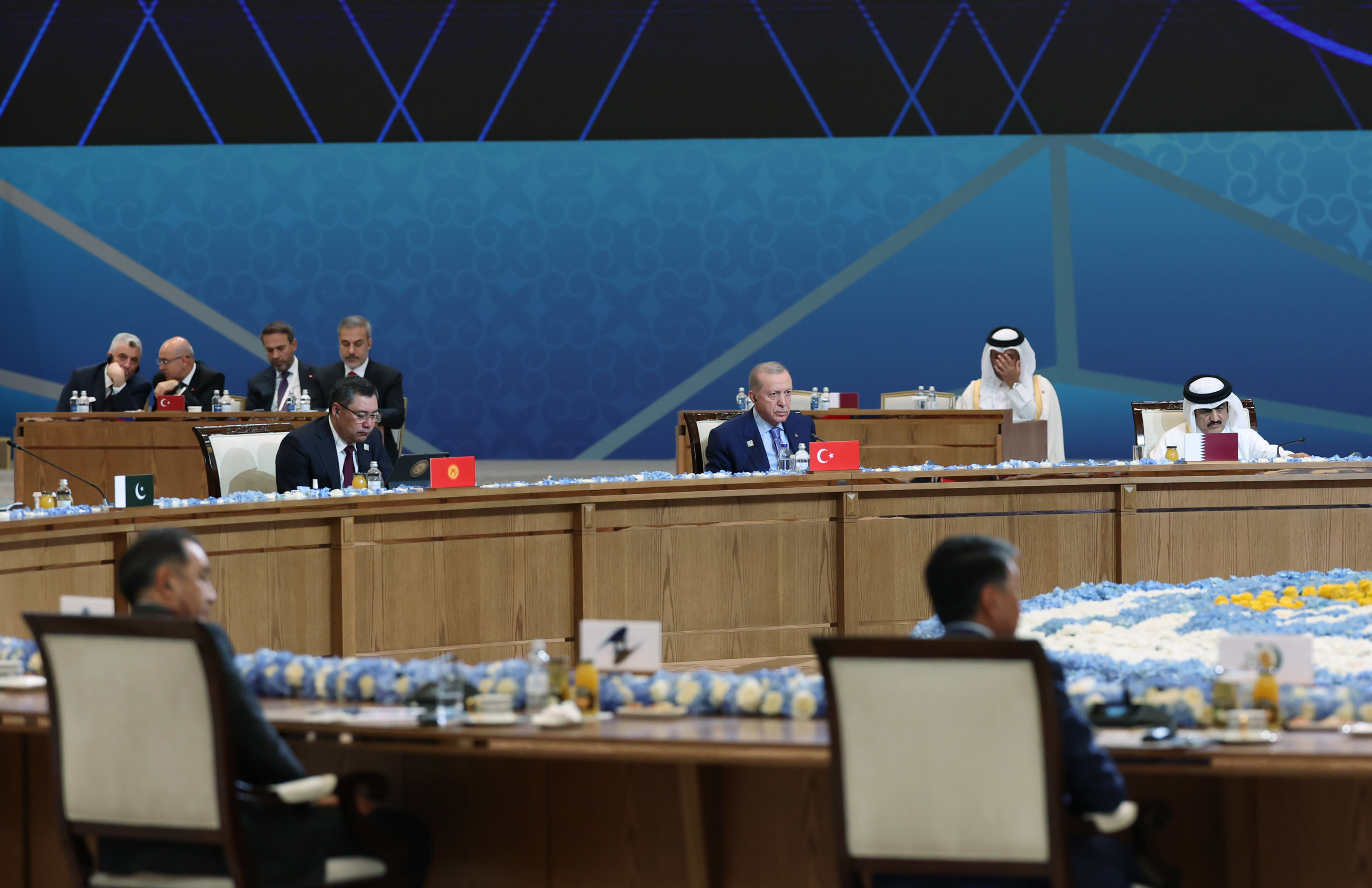 Zirve için belirlenen, "Sürdürülebilir Barış ve Kalkınma Arayışında Çok Taraflı Diyaloğun Güçlendirilmesi" temasının son derece isabetli olduğunu söyleyen Cumhurbaşkanı Erdoğan, "Kural temelli uluslararası sistemin sütunlarının sarsılmakta olduğu bir dönemden geçiyoruz. Terörizm, İslam ve yabancı düşmanlığı, düzensiz göç, iklim değişikliği, enerji ve gıda güvenliğiyle tedarik zincirlerindeki aksamalar gibi meydan okumalar, yaşanan jeopolitik sarsıntıların şiddetini artırıyor. Bunun en son ve acı örneği hepimizin gözleri önünde Gazze başta olmak üzere işgal edilmiş Filistin topraklarında sergilenmektedir." diye konuştu.