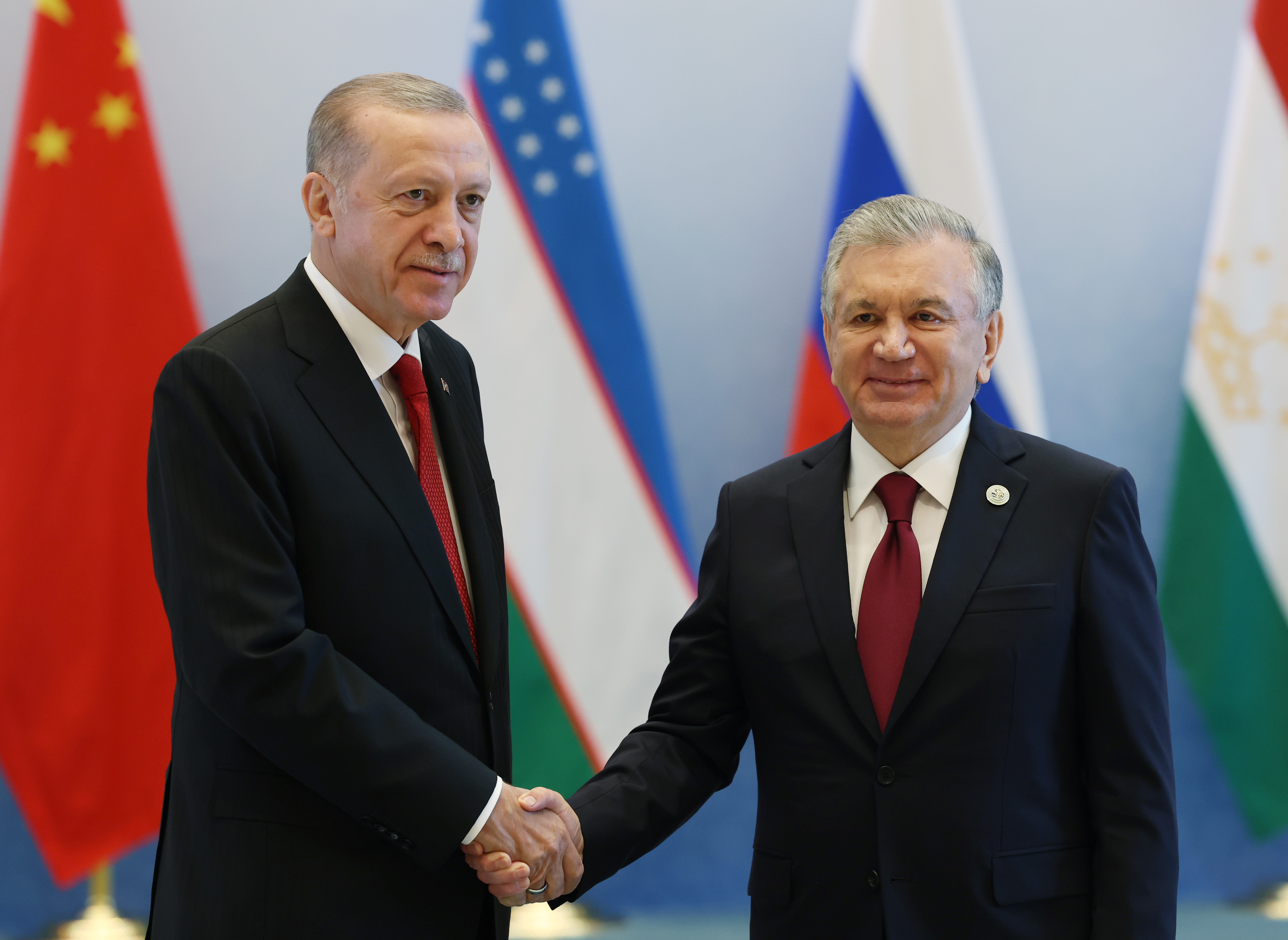 Cumhurbaşkanı Erdoğan, Zirve'nin düzenlendiği Ebedi Şehir kompleksine geldi. Burada gözlemci üye ve özel konuk heyet başkanları için düzenlenen selamlama törenine katılan Cumhurbaşkanı Erdoğan, Özbekistan Cumhurbaşkanı Şevket Mirziyoyev tarafından karşılandı.