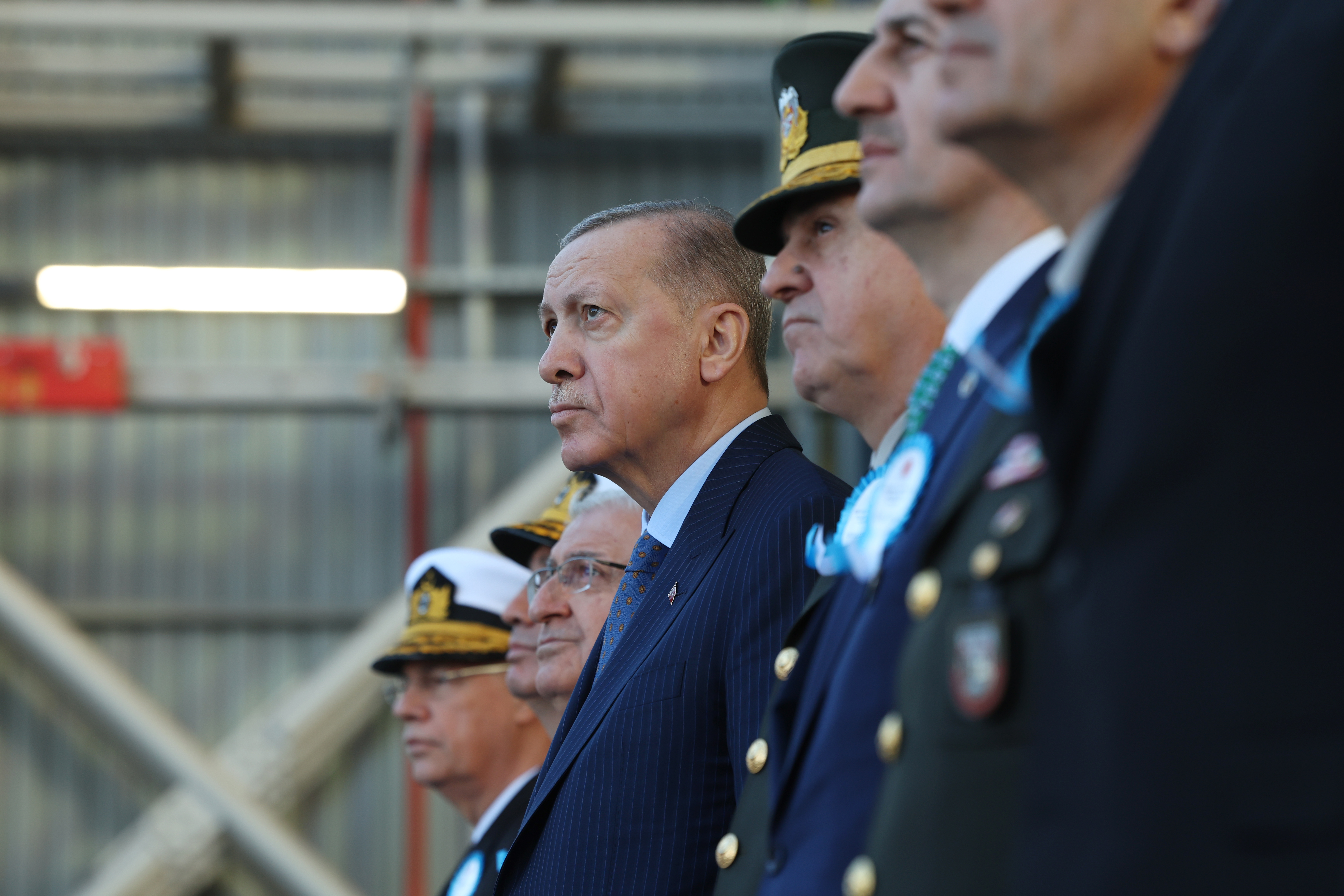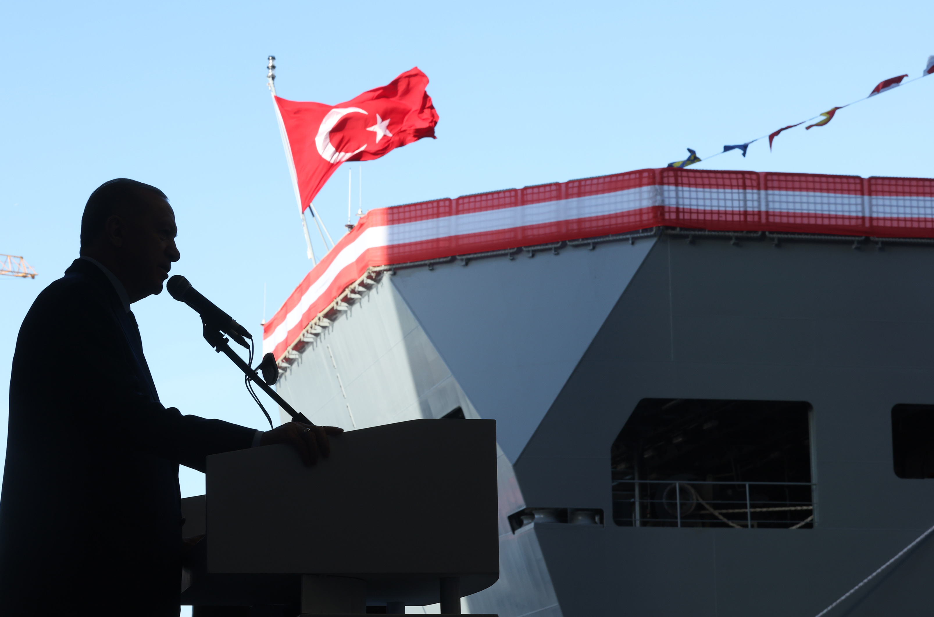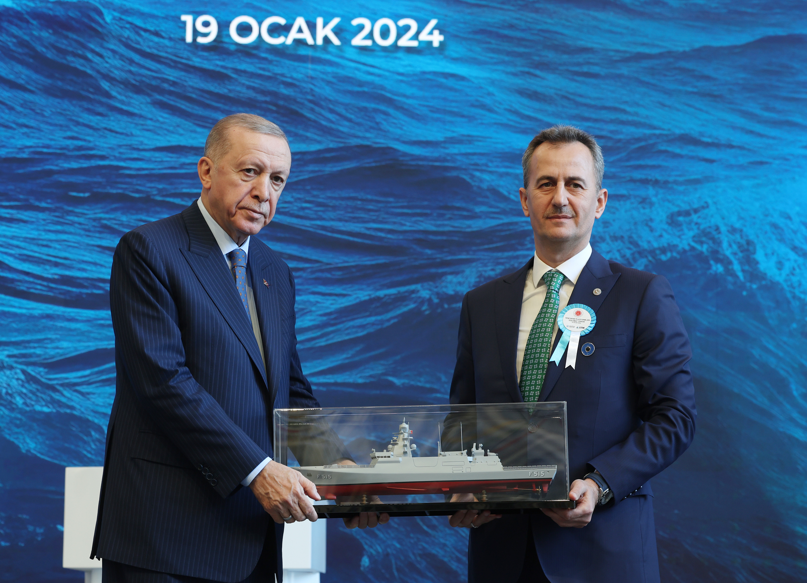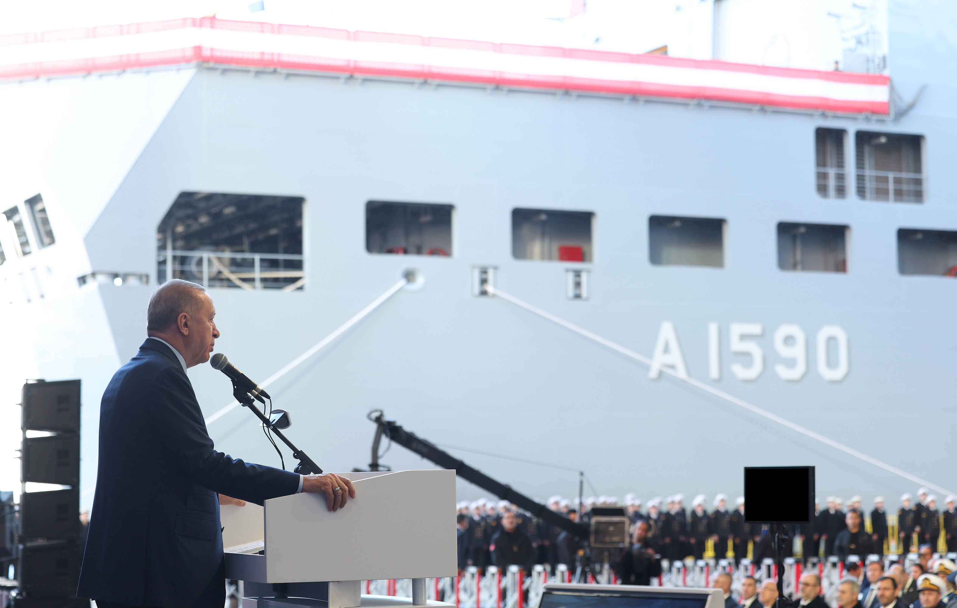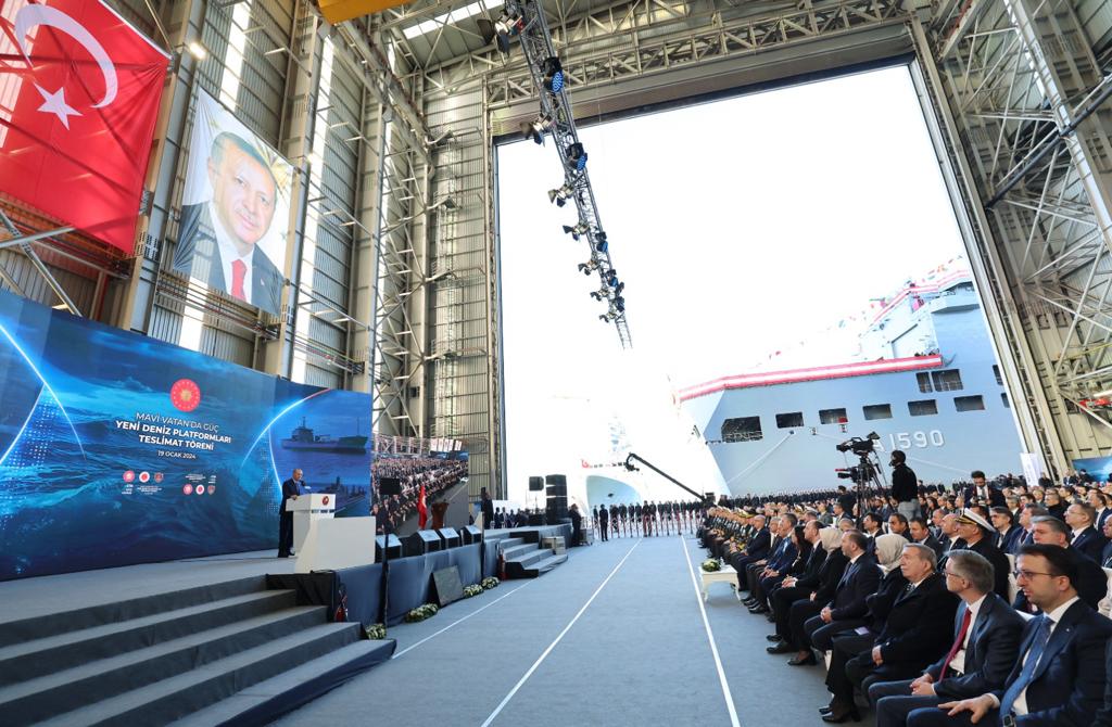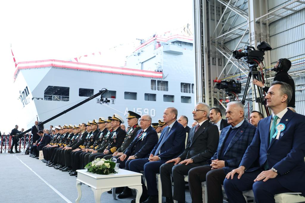 Millî Savunma Bakanı Yaşar Güler, Genelkurmay Başkanı Orgeneral Metin Gürak, Cumhurbaşkanlığı Savunma Sanayii Başkanı Haluk Görgün, Deniz Kuvvetleri Komutanı Oramiral Ercüment Tatlıoğlu'nun da konuşma yaptığı törende, Cumhurbaşkanı Erdoğan, bahriyelileri selamladı.