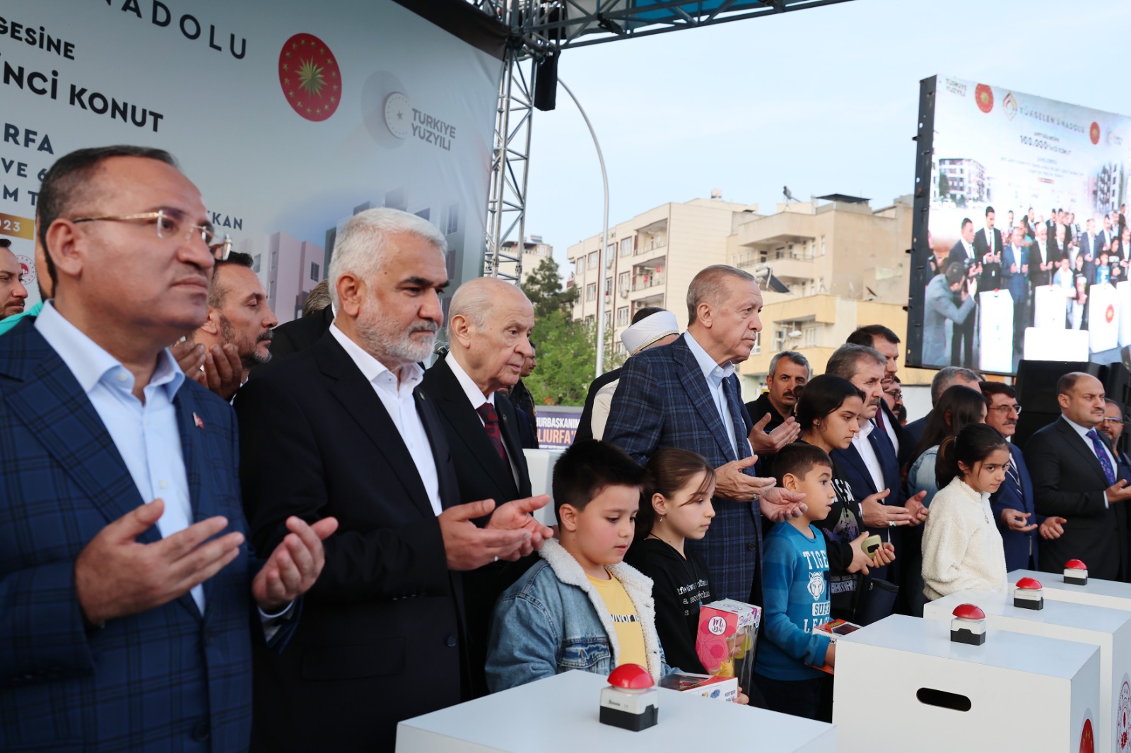 "Bu depremlerden etkilenen şehirlerden birisi de Şanlıurfa idi. Tespitlere göre Şanlıurfamızda 12 bin 728 binadaki 22 bin 464 bağımsız bölüm kullanılamaz hâle geldi. Bölge genelinde ise bu rakamlar 311 bin binadaki 872 bin bölüme ulaşıyor. Deprem haberini alır almaz devleti ve milletiyle tüm imkânlarımızı bu bölgeye taşıdık. Arama kurtarma faaliyetleri, gıdadan giyeceğe ve barınmaya kadar acil yardım ihtiyaçları, enkaz kaldırma çalışmaları derken kalıcı konutların yapım safhasına da geldik."