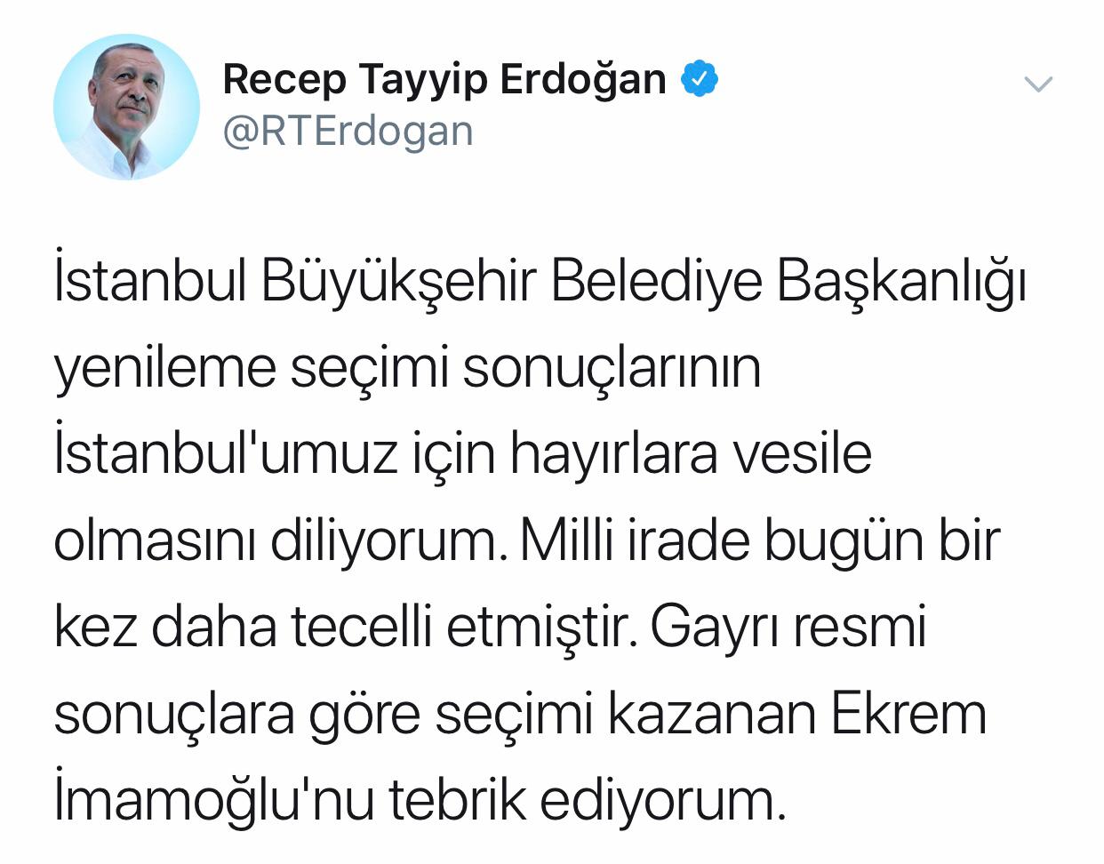 Cumhurbaşkanı Erdoğan, "İstanbul Büyükşehir Belediye Başkanlığı yenileme seçimi sonuçlarının İstanbulumuz için hayırlara vesile olmasını diliyorum. Milli irade bugün bir kez daha tecelli etmiştir. Gayriresmi sonuçlara göre seçimi kazanan Ekrem İmamoğlu'nu tebrik ediyorum." ifadelerini kullandı.