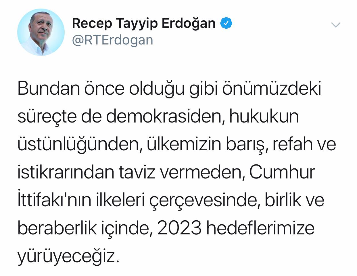 Bundan önce olduğu gibi ilerleyen süreçte de demokrasiden, hukukun üstünlüğünden, ülkenin barış, refah ve istikrarından taviz vermeden, Cumhur İttifakı'nın ilkeleri çerçevesinde, birlik ve beraberlik içinde, 2023 hedeflerine yürüyeceklerini vurgulayan Erdoğan, şunları kaydetti: