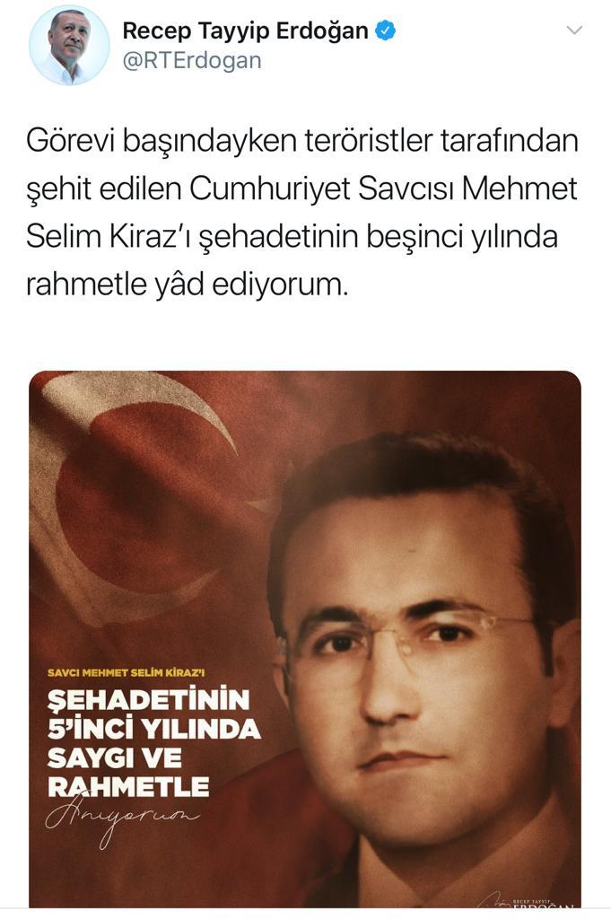 Cumhurbaşkanı Erdoğan, resmi sosyal medya hesabından yaptığı paylaşımda, "Görevi başındayken teröristler tarafından şehit edilen Cumhuriyet Savcısı Mehmet Selim Kiraz'ı şehadetinin beşinci yılında rahmetle yad ediyorum." ifadelerini kullandı.