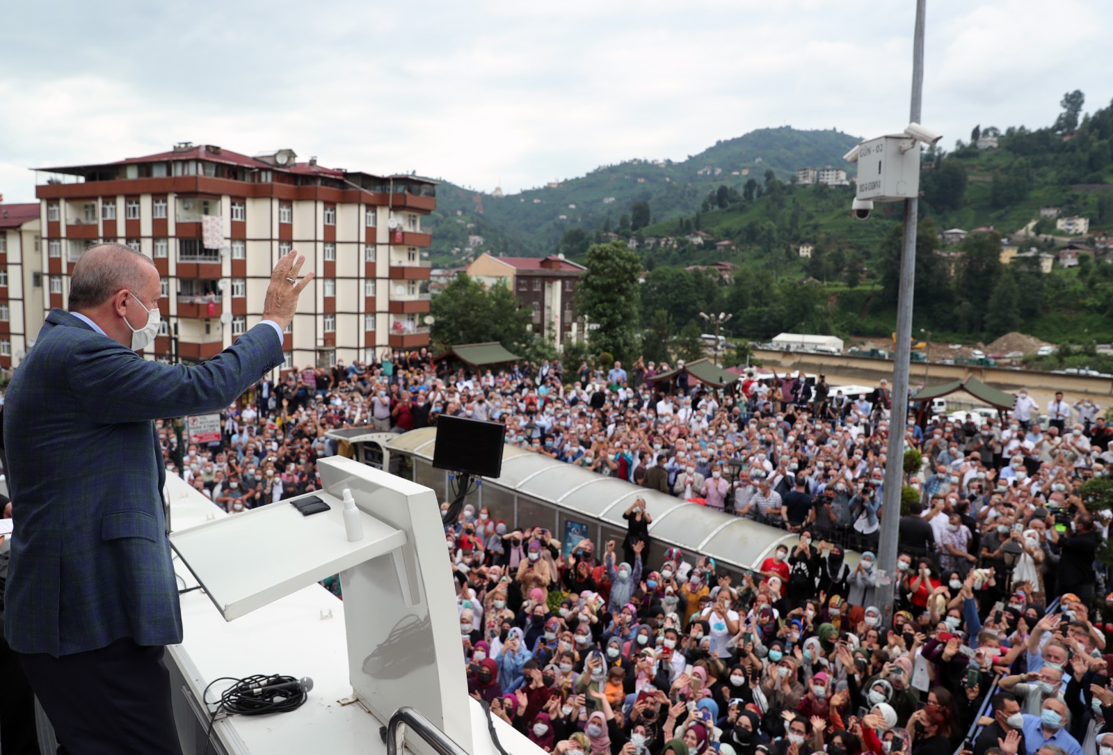 Cumhurbaşkanı Erdoğan, şiddetli yağış nedeniyle sel ve heyelanın meydana geldiği Rize'de, AK Parti Güneysu İlçe Başkanlığı önünde vatandaşlara hitap etti.