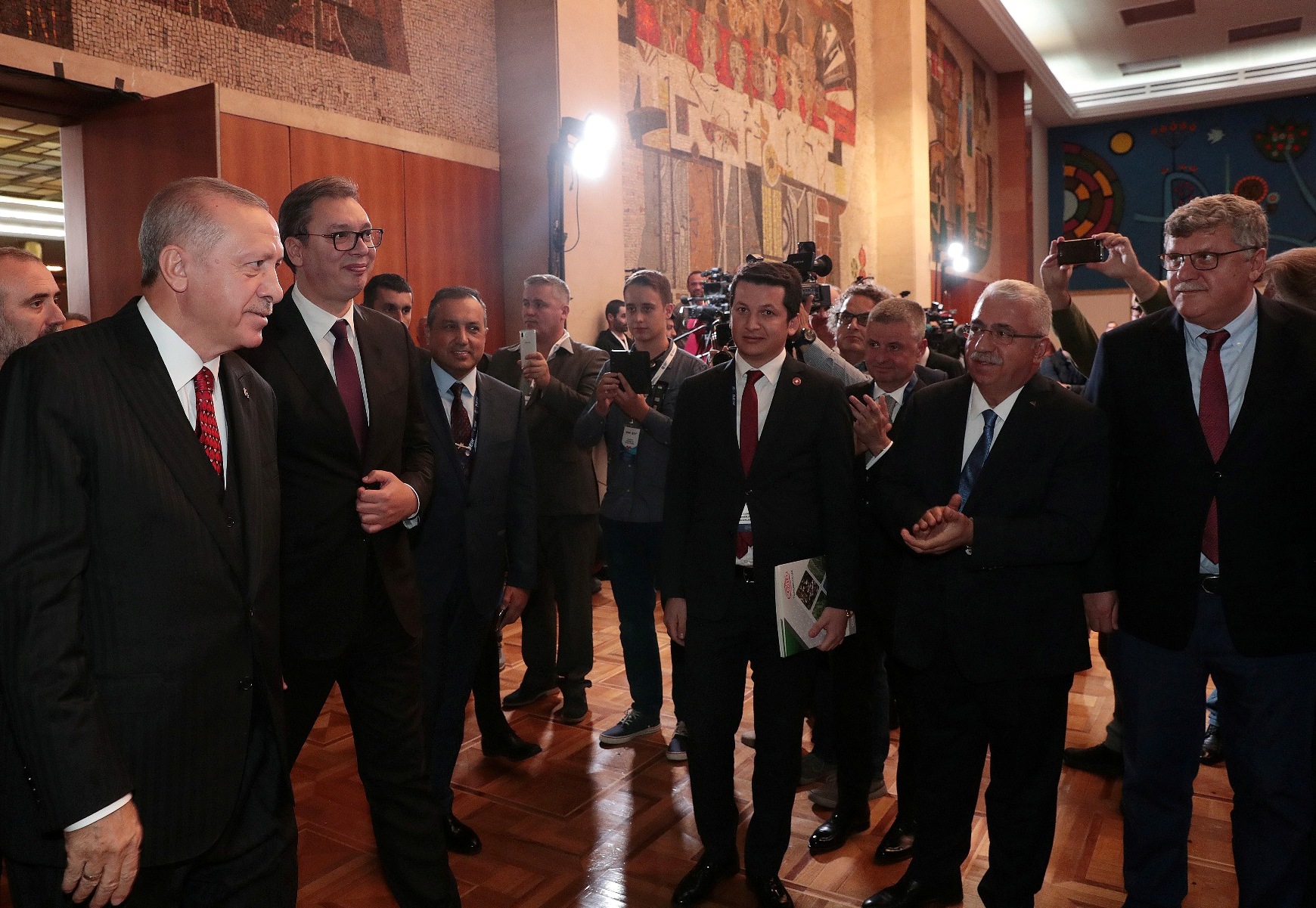 Ziyaretin ve toplantının verimli geçmesini ve her iki ülke için hayırlara vesile olmasını dileyen Erdoğan, "Sırbistan'la kökleri asırlara uzanan sağlam dostluk bağlarımız bulunuyor. Türkçede ve Sırpçada çok sayıda ortak kelime, bu güzel coğrafyayı, Balkanlar'ı anlatan şiirlerimiz, türkülerimiz var. Bu ortak paydaların dünyada çok az ülkeye nasip olduğunu özellikle ifade etmek istiyorum." diye konuştu.