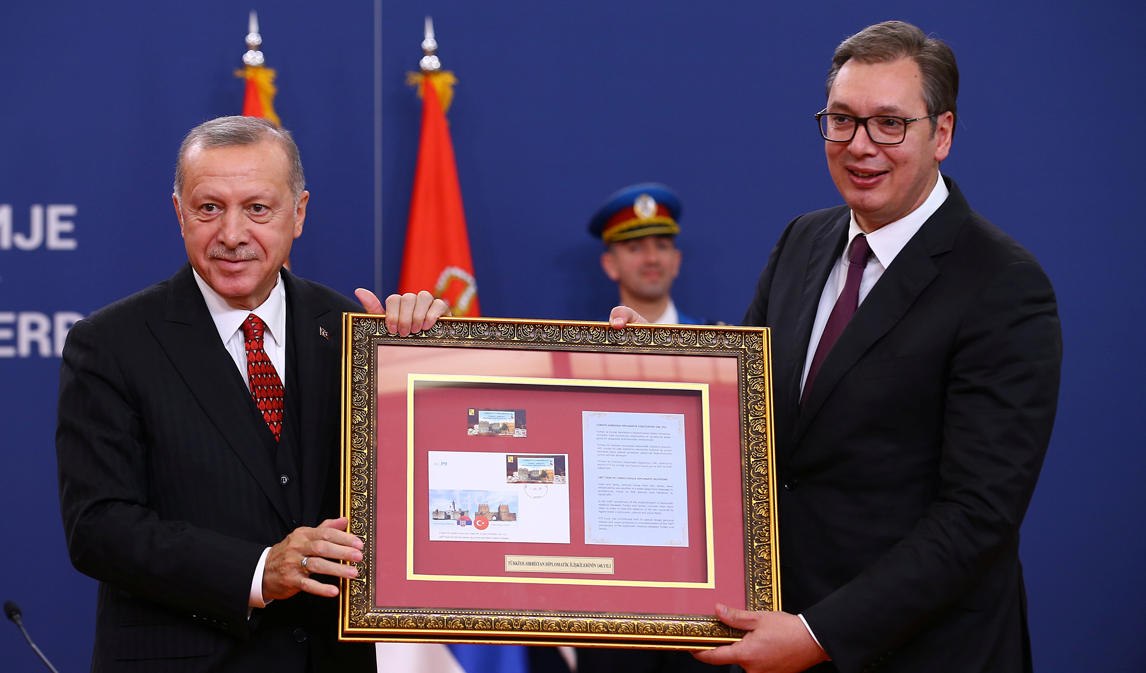 Erdoğan ve Vucic basın toplantısının ardından birbirlerine iki ülkenin diplomatik ilişkilerinin 140'ıncı yılı anısına basılan anı pulları takdim etti.