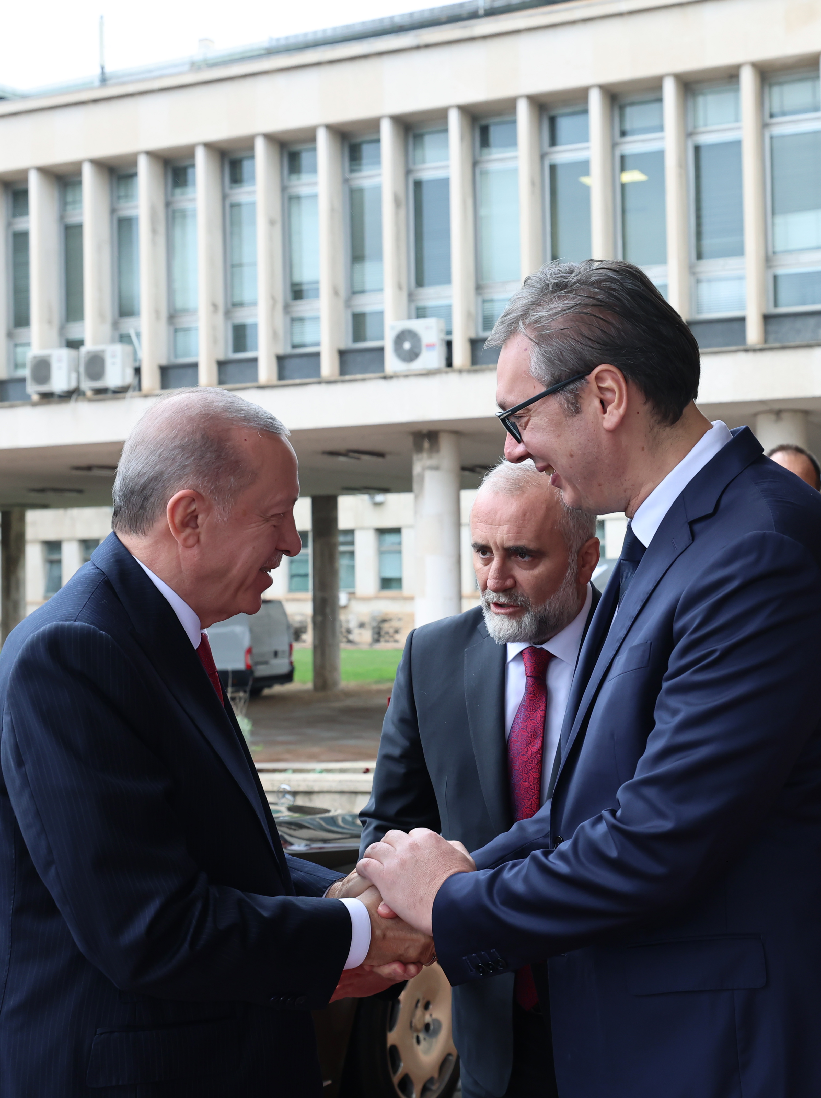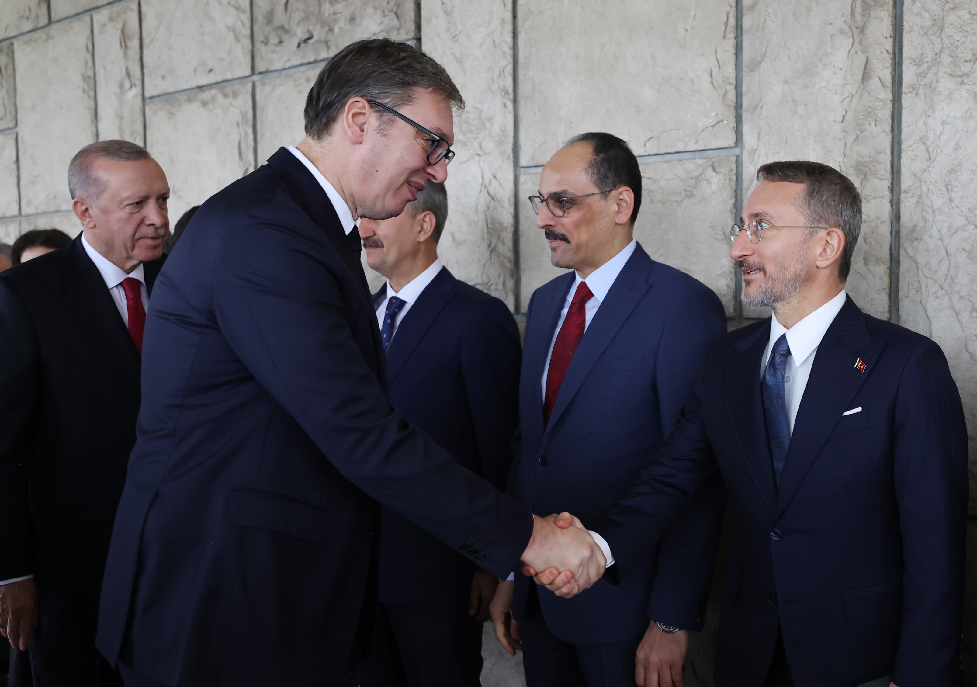 Tören kıtasını selamlayan Cumhurbaşkanı Erdoğan ve Vucic, tokalaşarak basın mensuplarına poz verdi. İki lider daha sonra heyetlerini takdim etti.