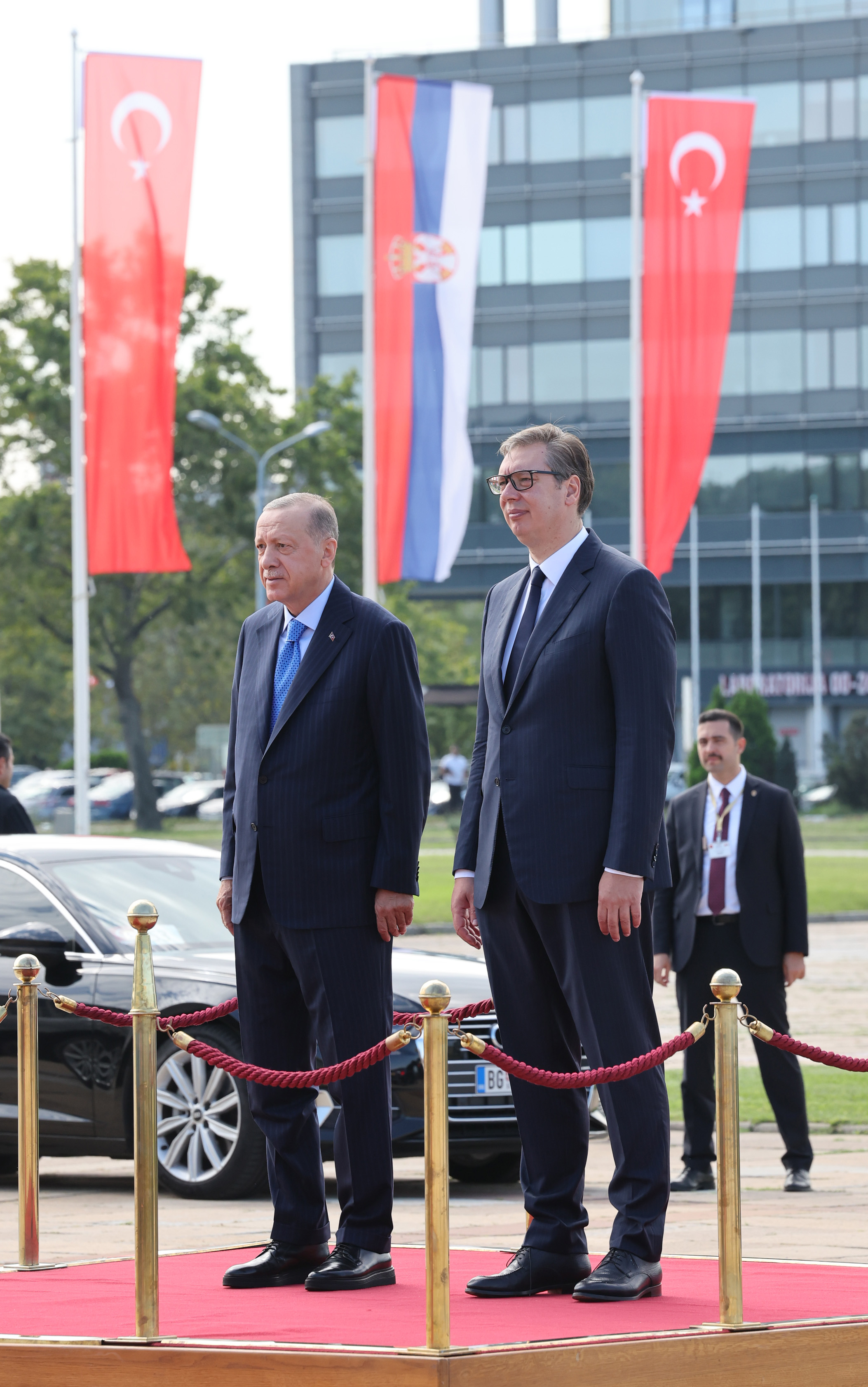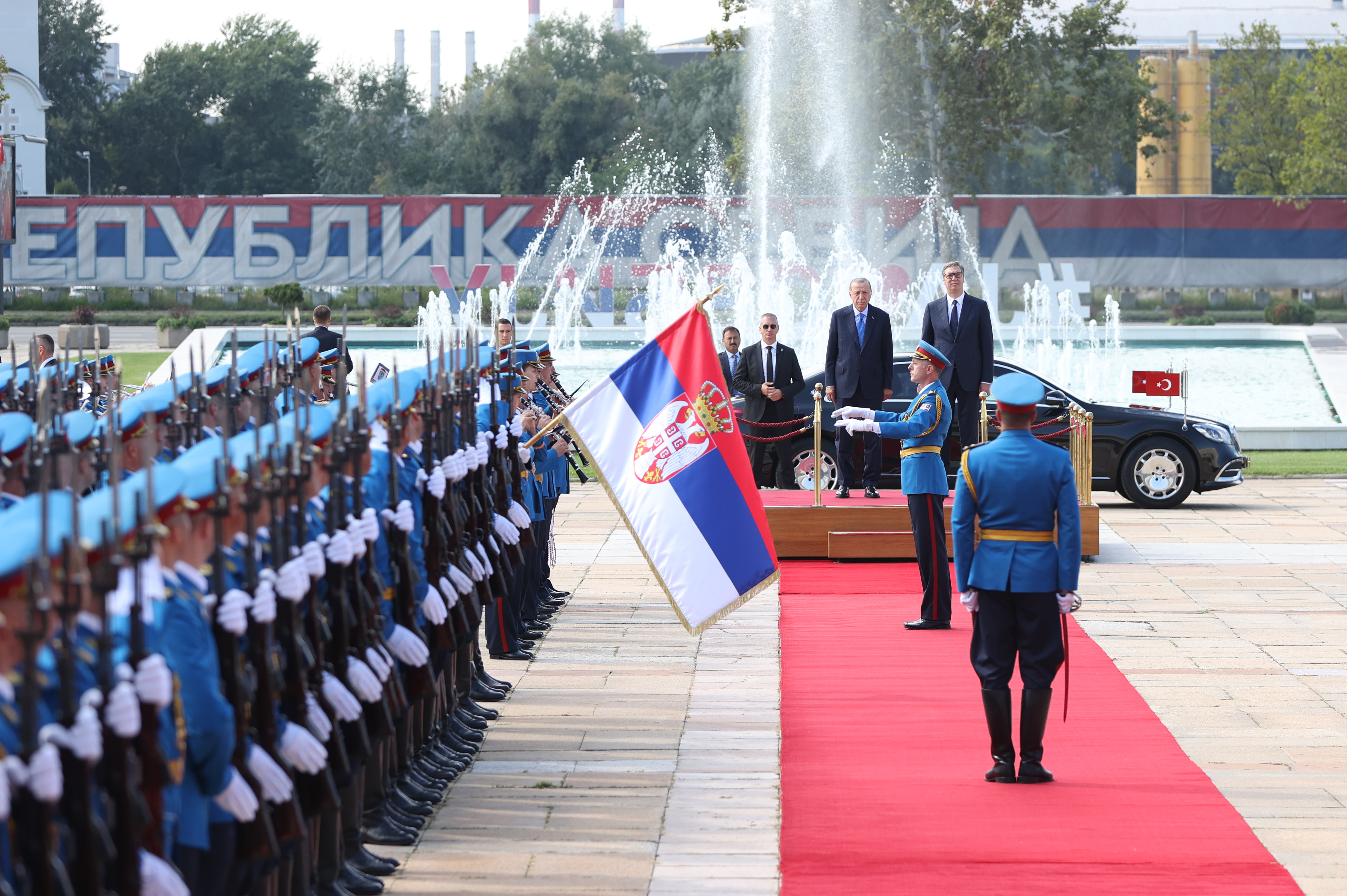 Cumhurbaşkanı Erdoğan'ı, Sırbistan Cumhurbaşkanlığı Sarayı'nda Sırbistan Cumhurbaşkanı Vucic karşıladı. İki ülke millî marşları okunurken 7 pare top atışı yapıldı.