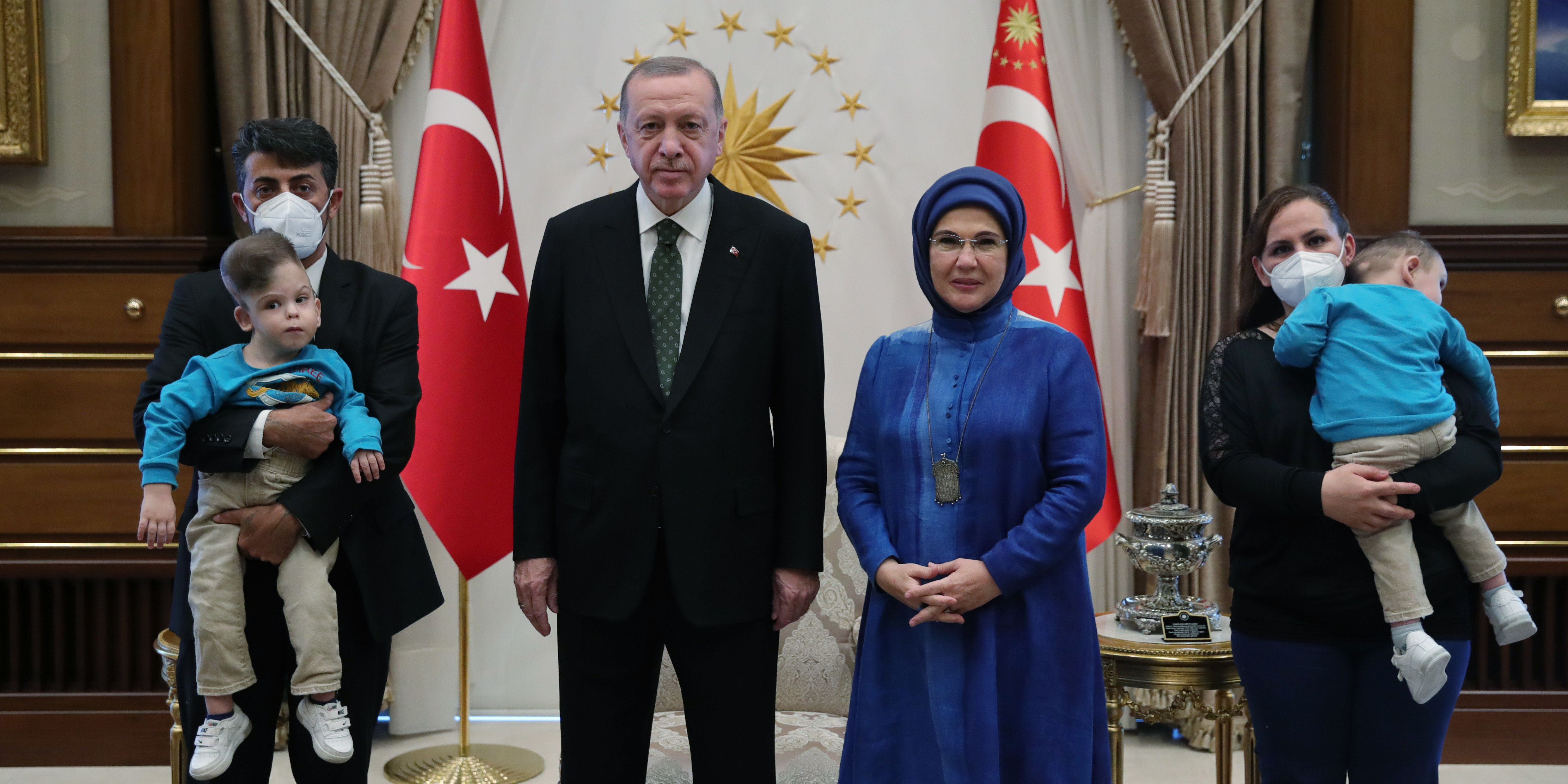 Cumhurbaşkanı Erdoğan ve eşi Emine Erdoğan siyam ikizlerinin sağlık durumuna ilişkin aile ve Dr. Jeelani'den bilgi aldı. İkizlere oyuncak hediye eden Erdoğan, Evrensel ailesi ve Jeelani ile hatıra fotoğrafı çektirdi.