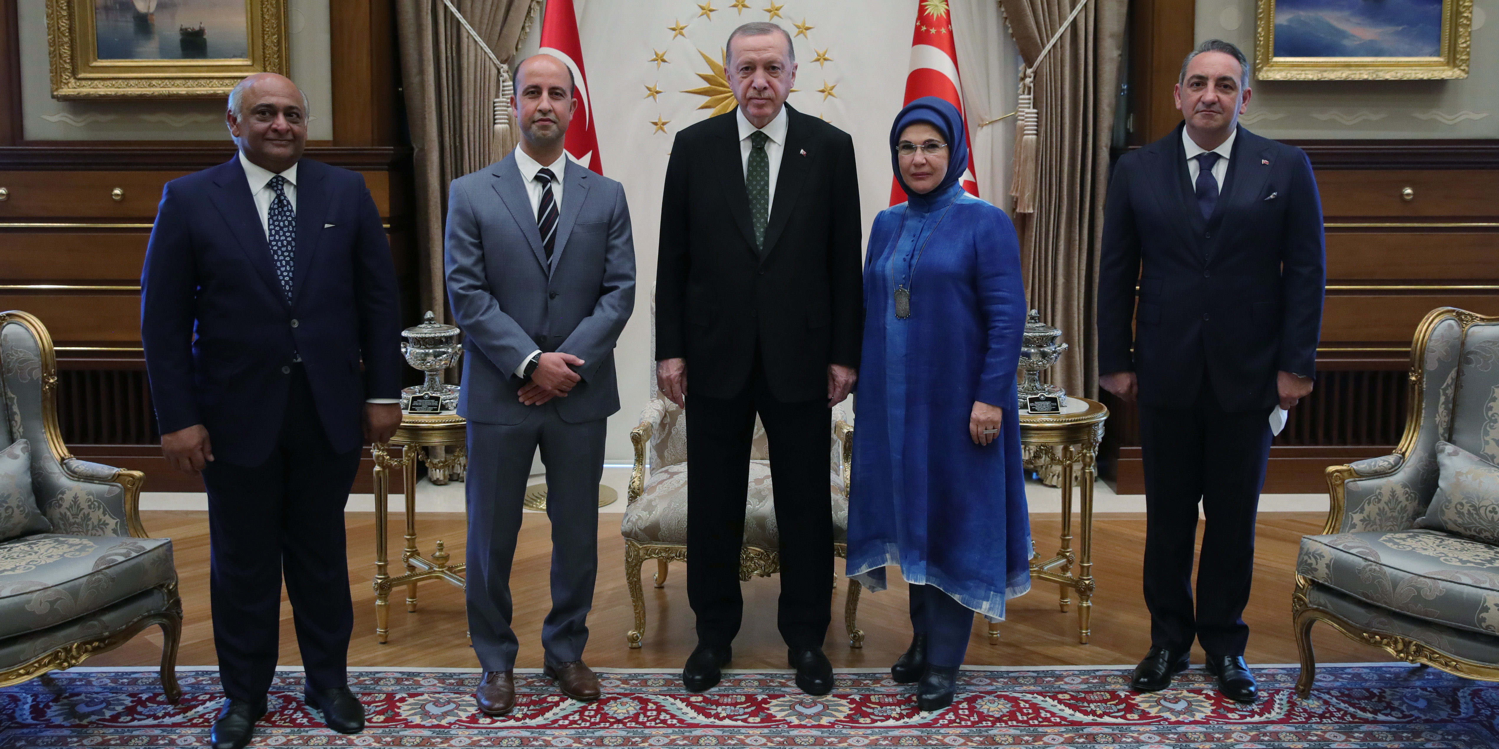 Cumhurbaşkanlığı Külliyesi'ndeki kabulde, Cumhurbaşkanı Erdoğan'ın eşi Emine Erdoğan ve Sağlık Bakanı Fahrettin Koca ile Fatma ve Ömer Evrensel çifti de yer aldı.