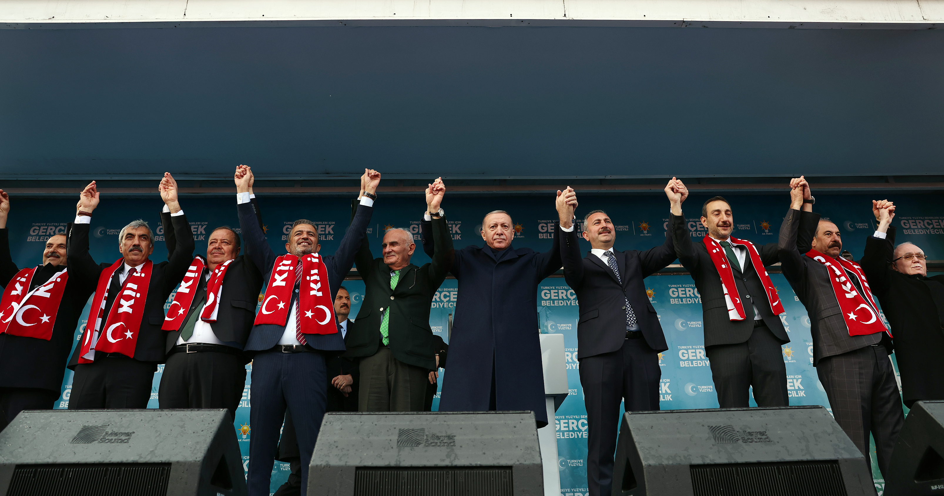 Bugünkü Kayseri mitinginden selamlar getirdiğini, muhteşem bir miting gerçekleştirdiklerini aktaran Cumhurbaşkanı Erdoğan, "Bizim siyasetteki yegâne referansımız, hizmetlerimiz ve yatırımlarımızdır. Biz icraatlarıyla, şehirlerimize kazandırdıkları eserlerle konuşan bir kadroyuz, böyle bir hükûmetiz. Meydanlarda verdiği sözleri göreve gelince unutanlardan hiçbir zaman olmadık." diye konuştu.