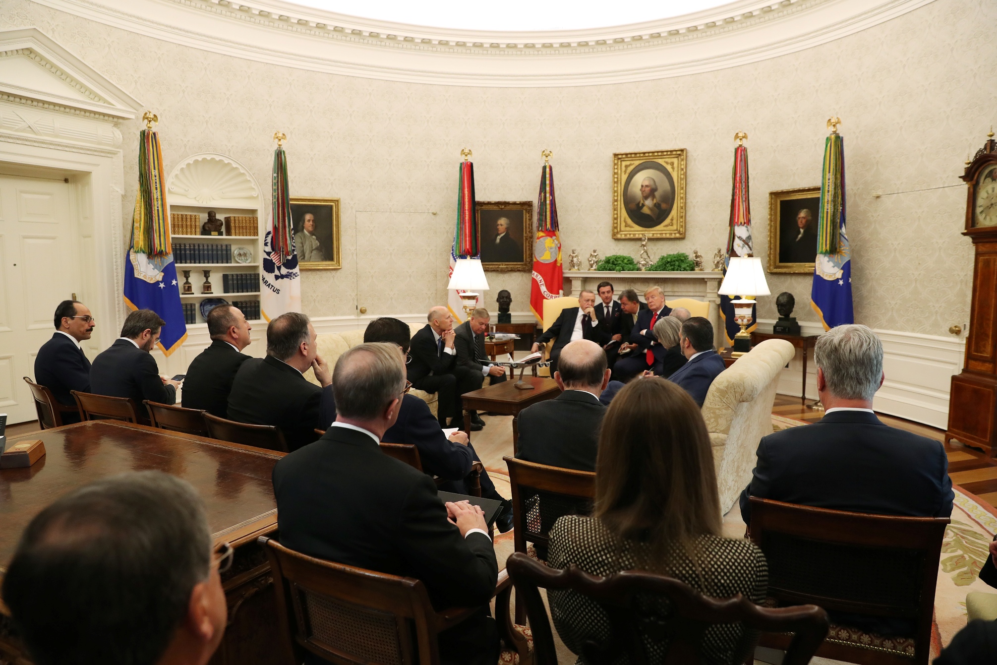 Cumhurbaşkanı Recep Tayyip Erdoğan Erdoğan, ABD Başkanı Donald Trump ile baş başa ve heyetler arası görüşmelerin ardından Oval Ofis'te bazı senatörlerle bir araya geldi.