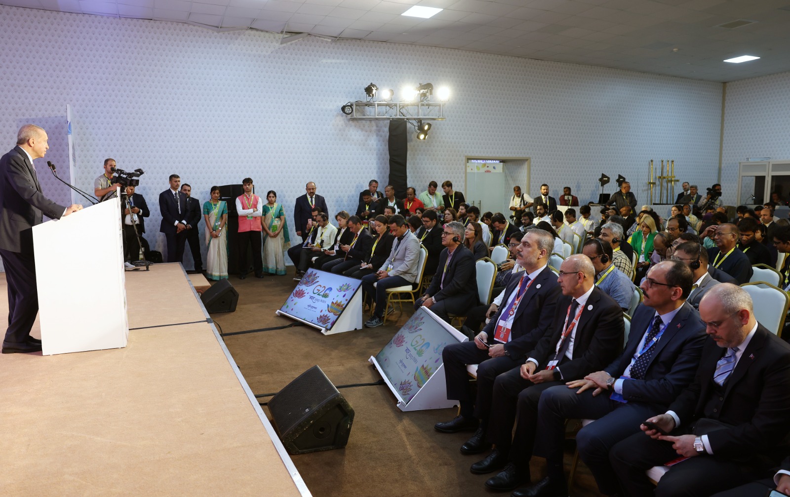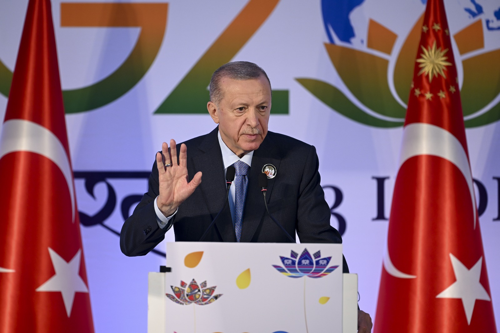 Hindistan'ın başkenti Yeni Delhi'de düzenlenen 18'inci G20 Liderler Zirvesi'nin sona ermesinin ardından düzenlenen basın toplantısında konuşan Cumhurbaşkanı Erdoğan "Bir parça ekmek ve su bulamadıkları için çocukların öldüğü, her yıl on binlerce umut yolcusunun çöllerde hayatını kaybettiği, hemen yanı başımızda yürek parçalayıcı trajedilerin yaşandığı bir dünyada, hiçbirimiz kendimizi güvende hissedemeyiz" ifadelerini kullandı.