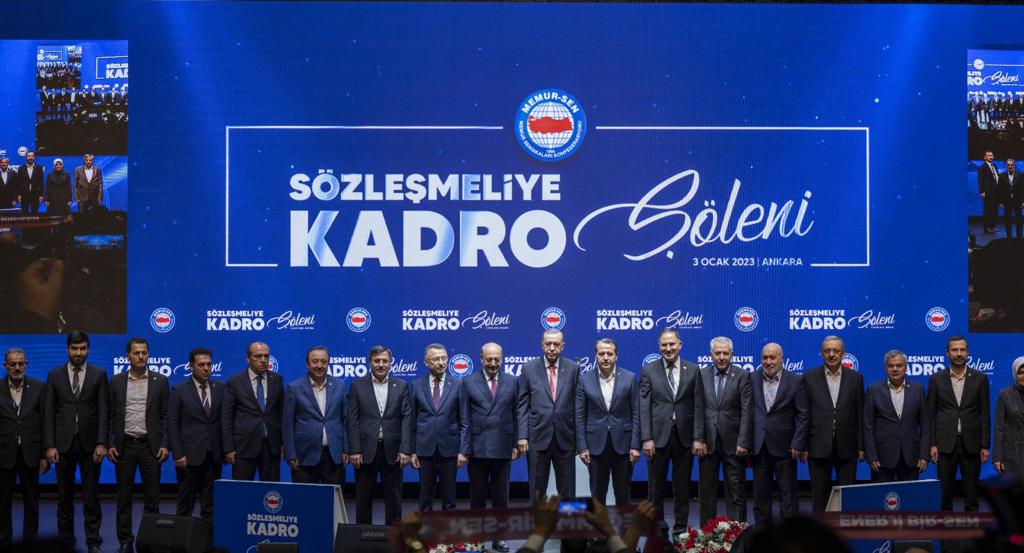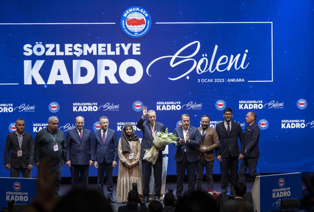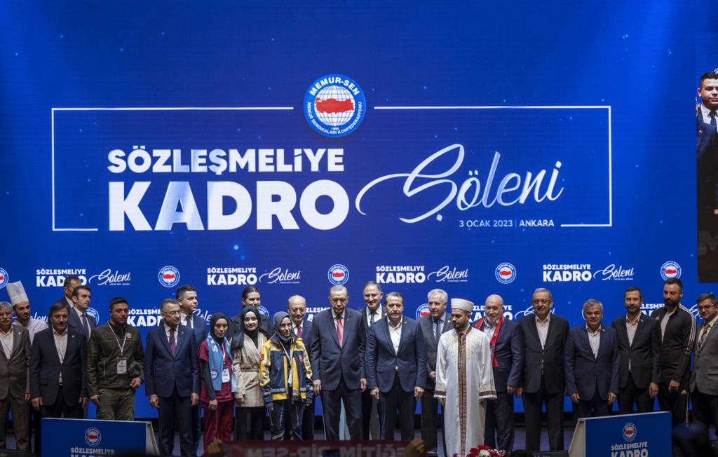 Cumhurbaşkanı Erdoğan, sözleşmelilerin kadroya geçiş sürecinde yoğun çaba harcayan Çalışma ve Sosyal Güvenlik Bakanlığı ile Memur-Sen'e teşekkürlerini ileterek "Niyet hayır olunca akıbetin de hayır olacağının en güzel, somut örneklerinden biri, sözleşmelilerin kadroya geçişidir. İnşallah hükûmet olarak diğer çalışanlarımızla birlikte kamu personelimizin de yanında olmaya, sıkıntılarını özellikle çözmek suretiyle bu süreci devam ettirmeye gayret edeceğiz." diye konuştu.