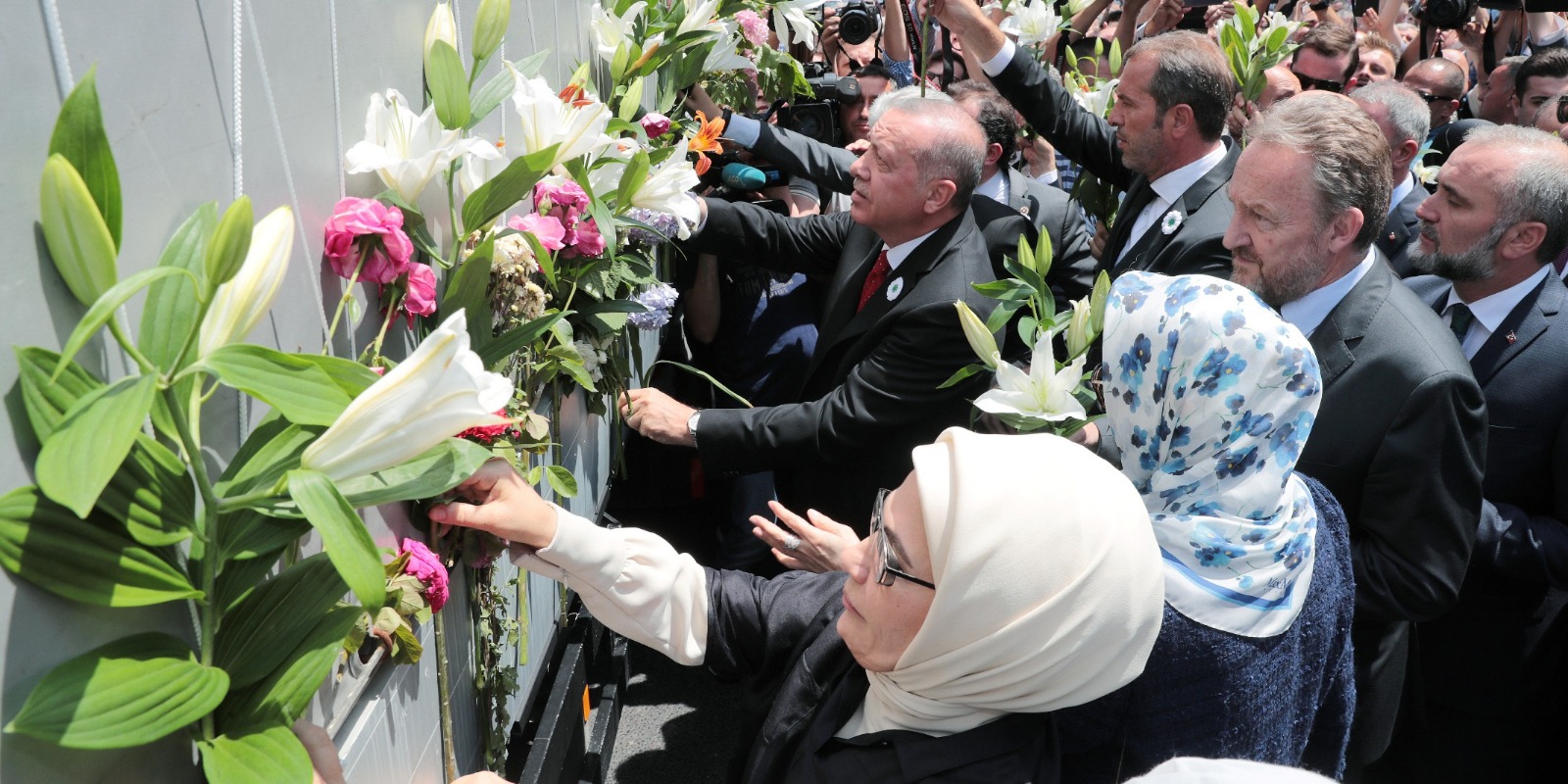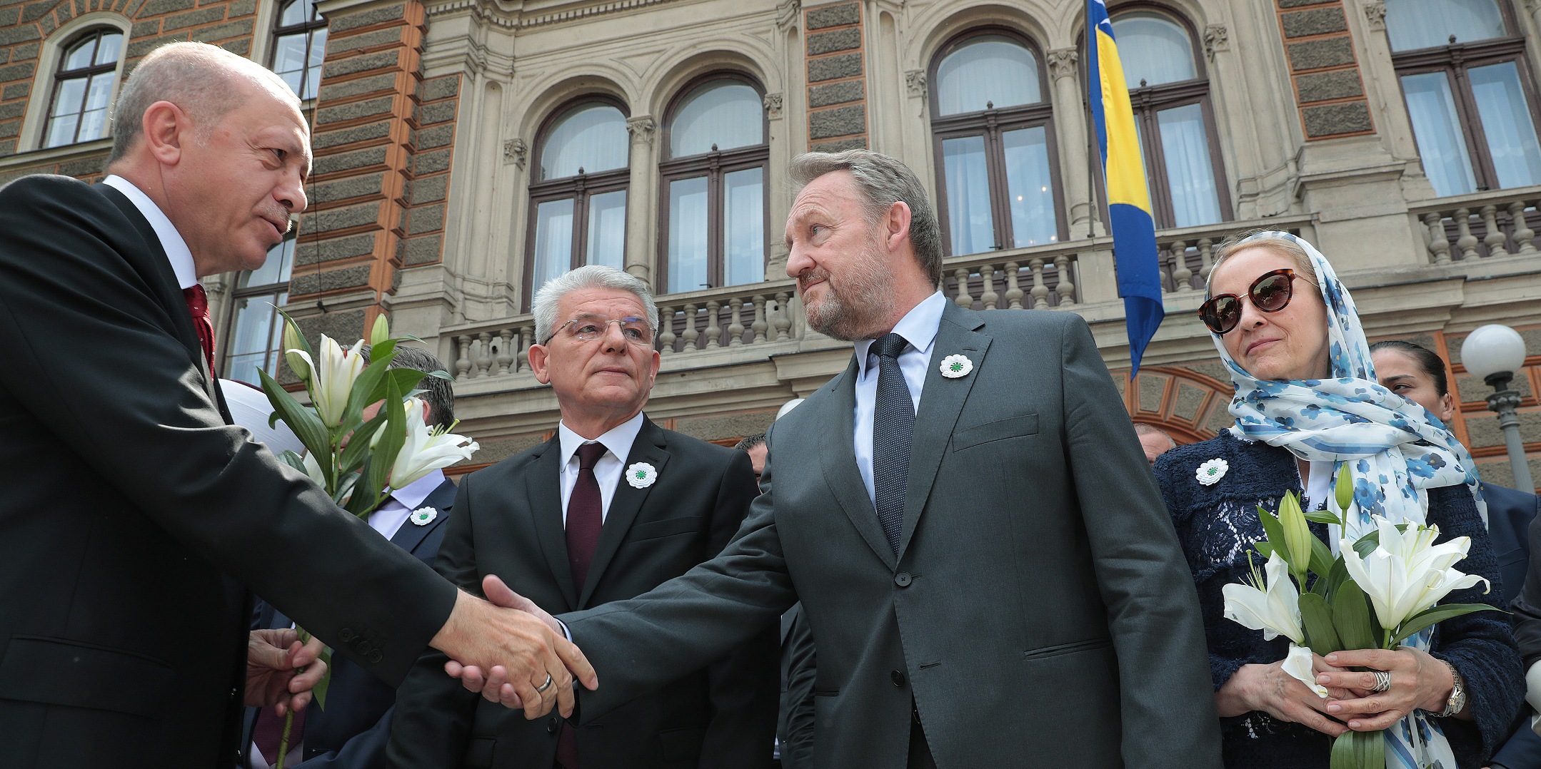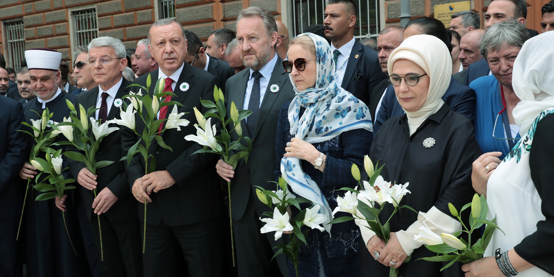 Törende cenazeleri taşıyan araç, Devlet Başkanlığı Konsey Binası önüne geldi. Cumhurbaşkanı Erdoğan ve beraberindekiler ile Bosnalı vatandaşlar burada, soykırım kurbanları için dua etti ve aracın üzerine çiçekler yerleştirdi.
