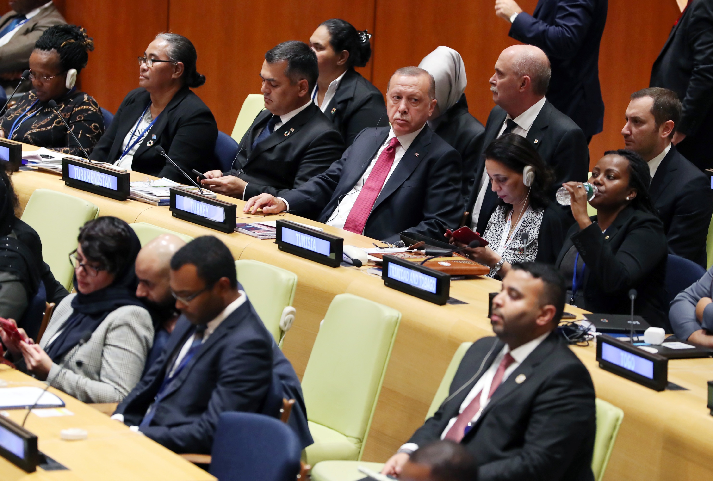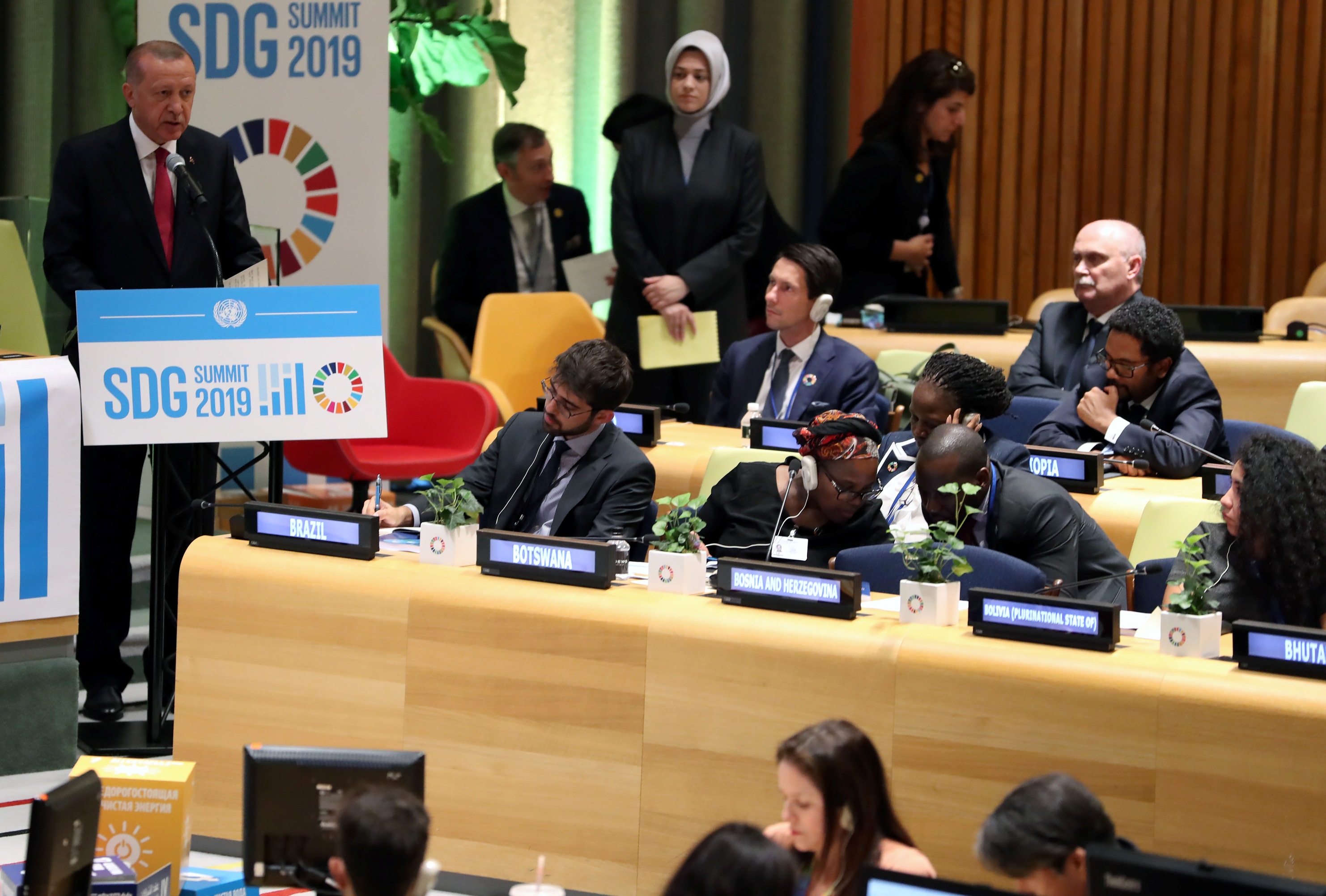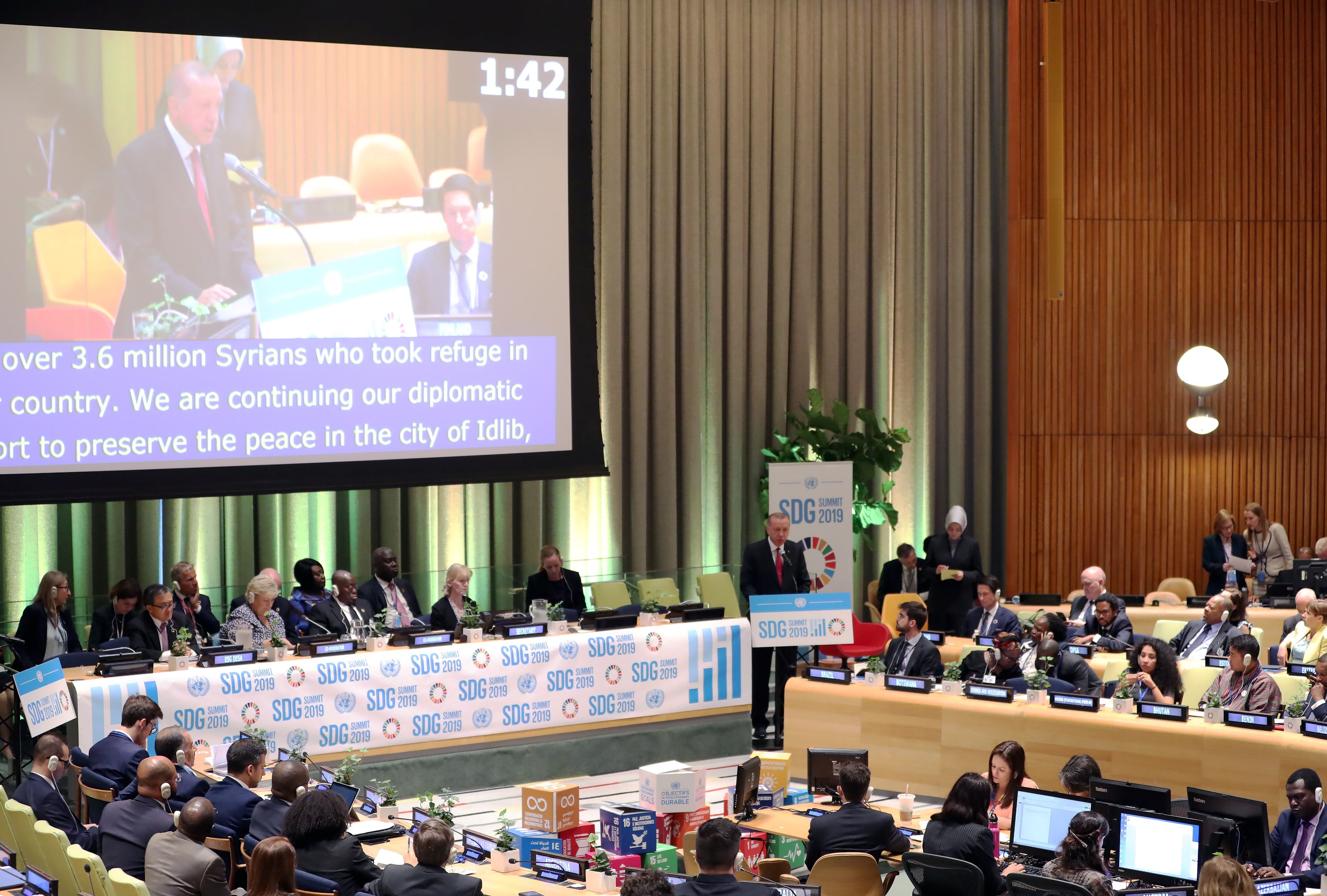 Birleşmiş Milletler 74. Genel Kurulu görüşmelerine katılmak üzere New York'ta bulunan Cumhurbaşkanı Recep Tayyip Erdoğan, BM'deki programları çerçevesinde, Sürdürülebilir Kalkınma Amaçları Zirvesi kapsamındaki "Sürdürülebilir Kalkınma Hedeflerinin Hayata Geçirilmesini Etkileyen Mega Eğilimler" konulu liderler diyaloğu oturumunda konuştu.
