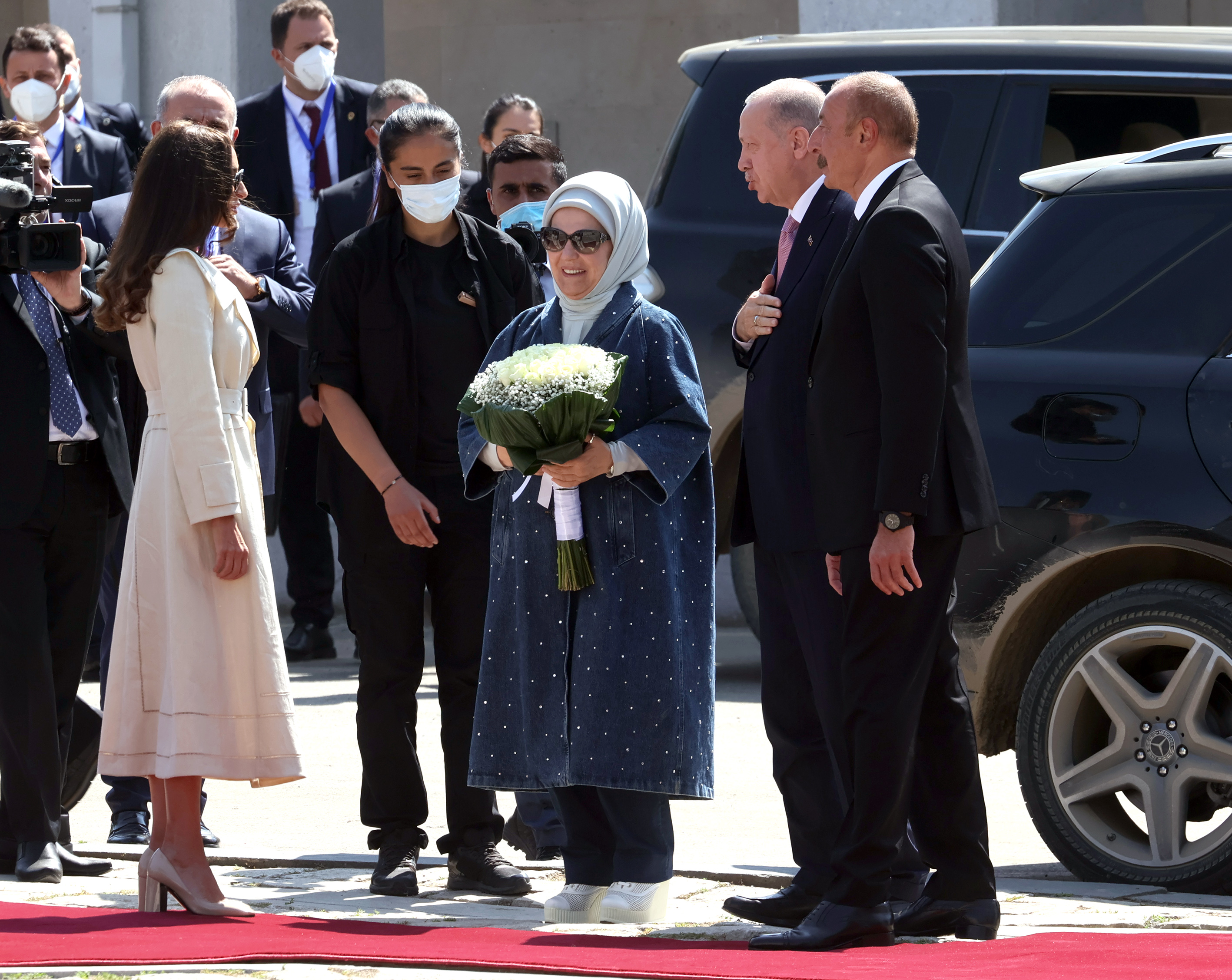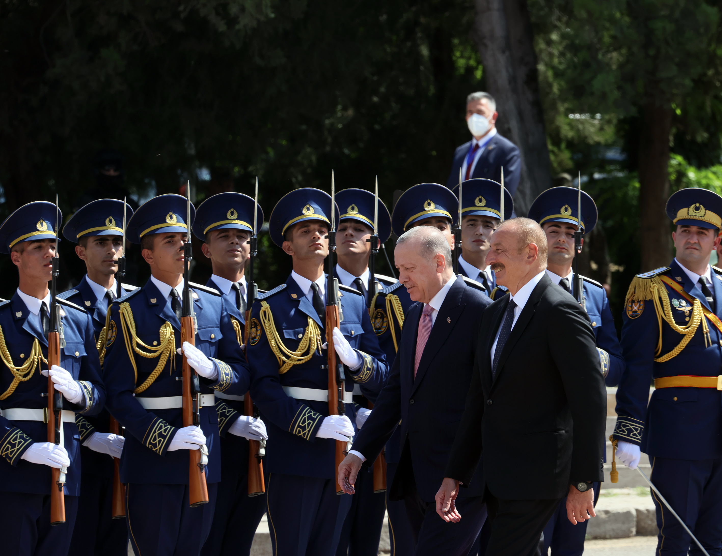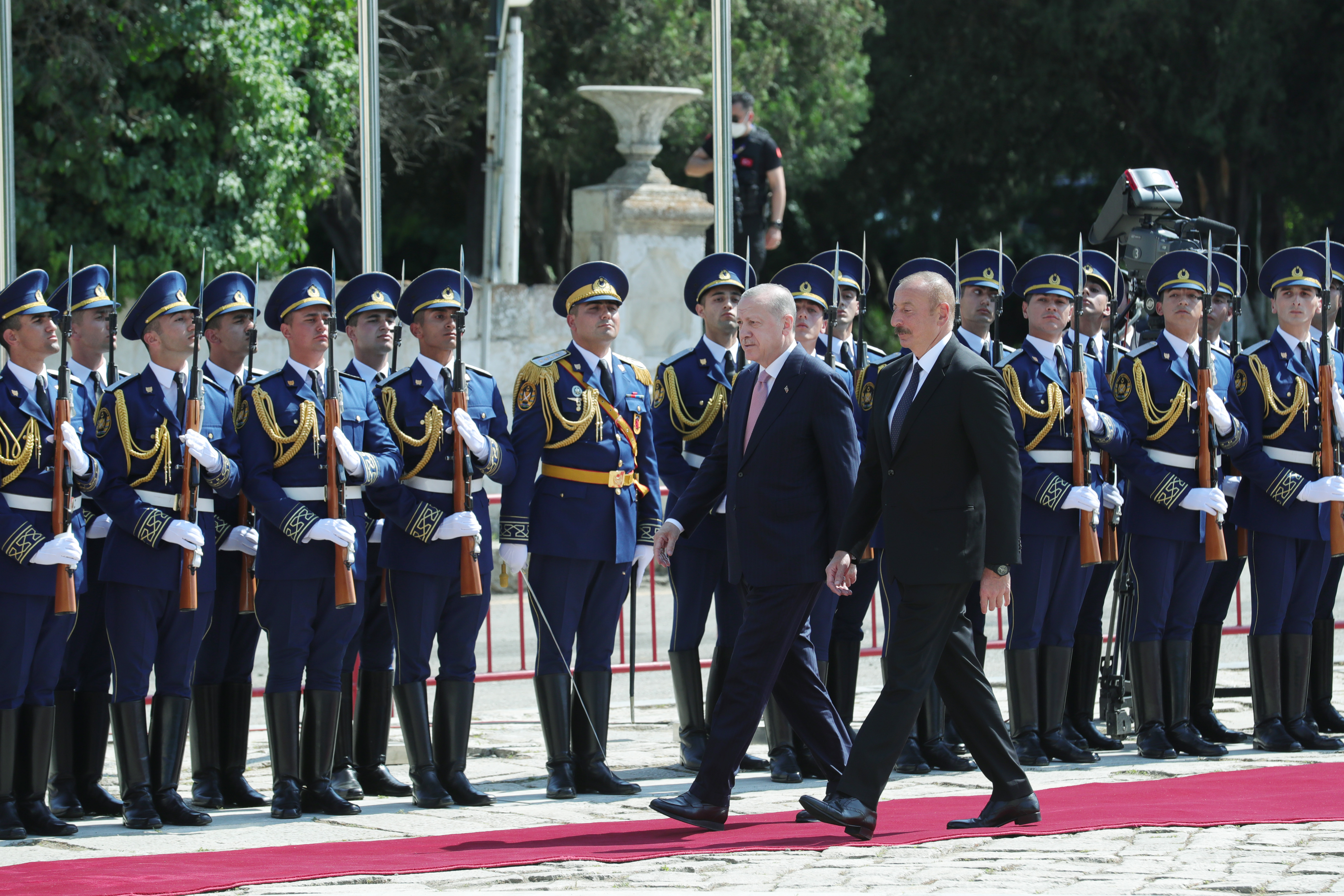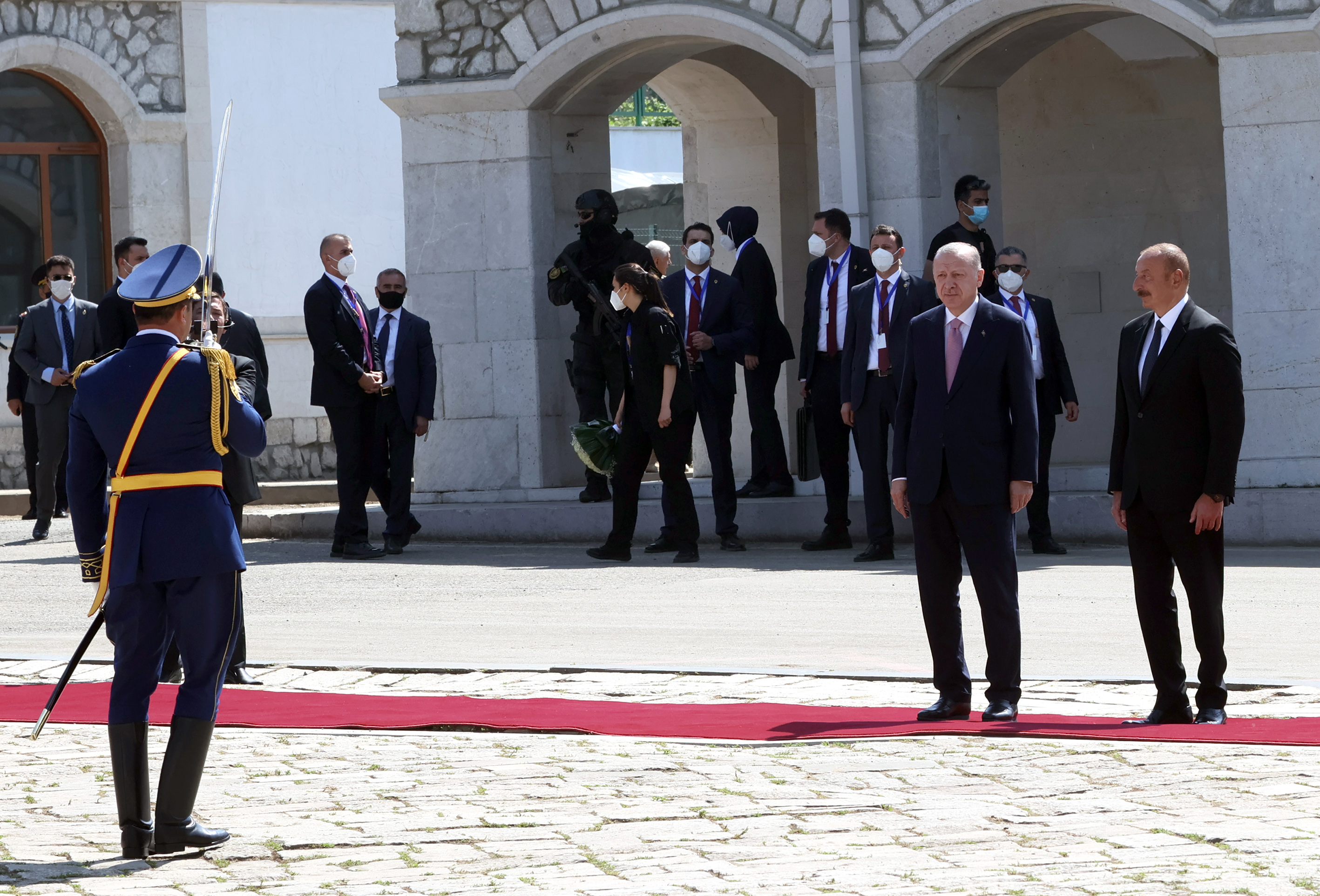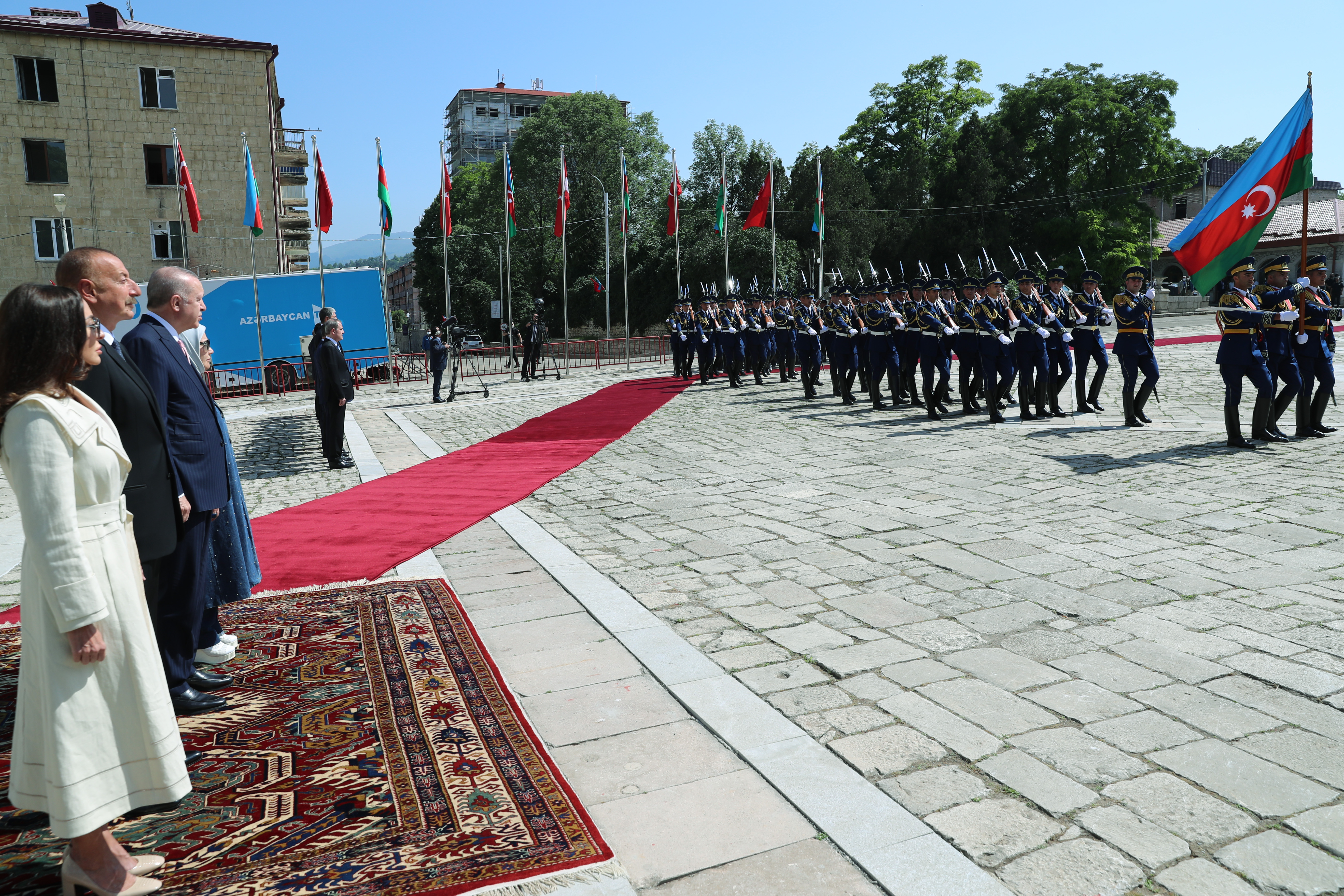 Cumhurbaşkanı Erdoğan için Şuşa Valiliği'nde karşılama töreni düzenlendi. Azerbaycan Cumhurbaşkanı Aliyev, Cumhurbaşkanı Erdoğan'ı makam aracından inişinde karşıladı. Cumhurbaşkanı Erdoğan ve Azerbaycan Cumhurbaşkanı Aliyev'in tören alanındaki yerlerini almasının ardından iki ülke milli marşları çalındı. Azerbaycan Cumhurbaşkanı Aliyev ile tören kıtasını denetleyen Cumhurbaşkanı Erdoğan, askerleri selamladı.