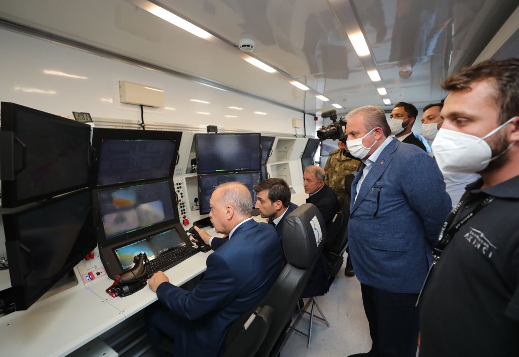 Cumhurbaşkanı Erdoğan, Bayraktar AKINCI TİHA'nın taksi, kalkış ve alçak uçuşunu izledikten sonra hava araçlarının kontrol merkezine girerek incelemelerde bulundu.