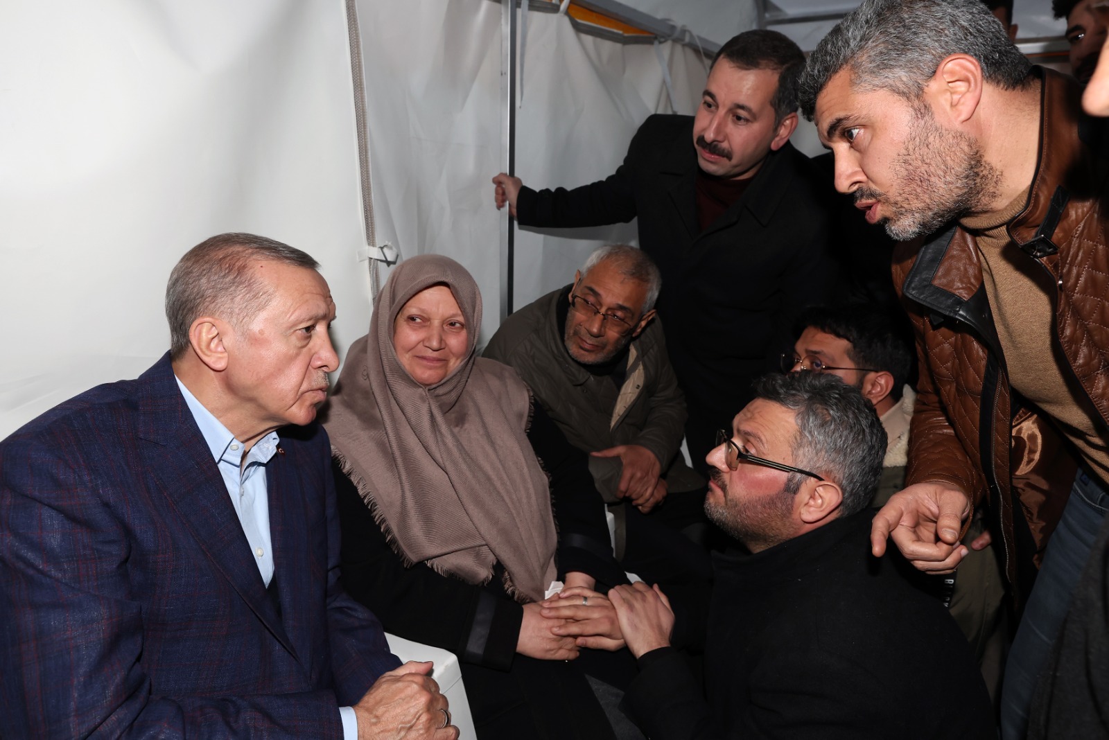 Taziye çadırında kısa bir konuşma yapan Cumhurbaşkanı Erdoğan, depremde hayatını kaybedenlere Allah'tan rahmet, yaralılara şifa diledi. Cumhurbaşkanı Erdoğan, "Bu felaketten de inşallah bir yıl sizlerden izin talep ediyoruz. Bir yıl içinde inşallah hem enkaz kaldırma hem inşa, ihya bu çalışmalarımızı bitireceğiz. İlla enkazların olduğu yer şart değil. Belediyelerimizin ve devletin rezerv alanlarında biz bu inşaatlarımızı inşallah başlatacağız." diye konuştu.