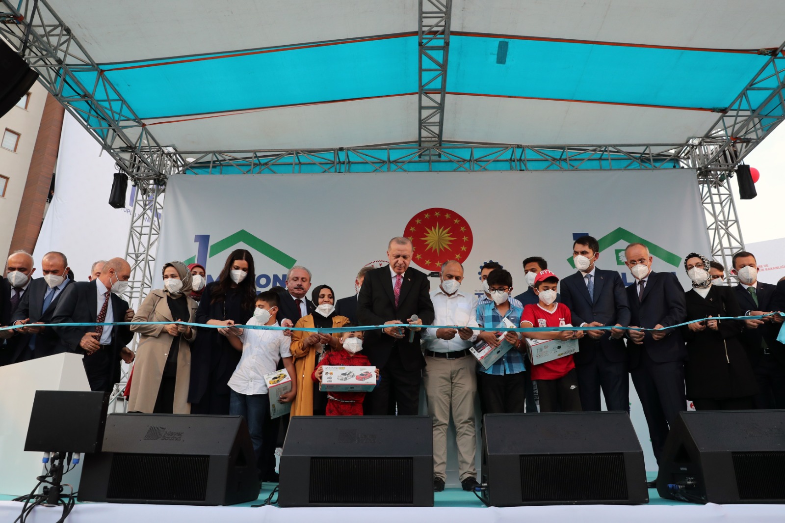 Tüm eserlerin hayırlı olmasını dileyen ve yatırımların kazandırılmasında emeği geçen Çevre ve Şehircilik Bakanlığını, Toplu Konut İdaresini, yüklenici firmaları, mühendisleri ve işçileri tebrik eden Cumhurbaşkanı Erdoğan, Türkiye'nin en büyük konut hamlesinin 1 milyonuncu konutunun anahtarını da bu vesileyle teslim etmekten büyük memnuniyet duyduğunu söyledi.
