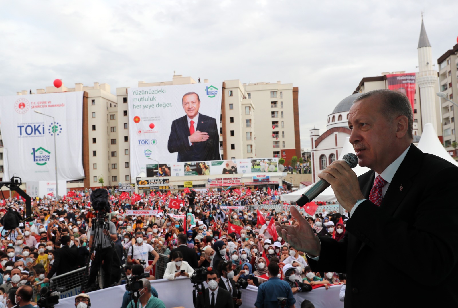"Sincan'daki kimi mahallelerin de önemli örneklerinden biri olduğu yapı kooperatifleri yoluyla katedilen mesafe ihtiyacı karşılamakta yetersiz kalmıştır. İstanbul Büyükşehir Başkanlığı görevine geldiğimde bu anlayışla hemen şehrin iki yakasına, iki örnek şehir kurmak için kolları sıvadık. Başbakanlık görevini devralır devralmaz da aynı seferberliği tüm ülkeye yaydık. Rahmetli Özal'ın kurduğu TOKİ'yi yeniden yapılandırarak, ülkemizin konut ve kamu binası üretim merkezi haline getirdik. Ülkemizde 1964-1979 yılları arasında 250 bin binada 878 bin konut, 1980-2002 yılları arasında 1 milyon 65 bin binada 4 milyon konut, 2003-2019 döneminde ise 1 milyon 173 bin binada 11 milyon 320 bin konut üretilmiştir. Bu tablo da göstermektedir ki Türkiye'nin konut sorununun çözümünde son 19 yıl kritik öneme sahiptir."