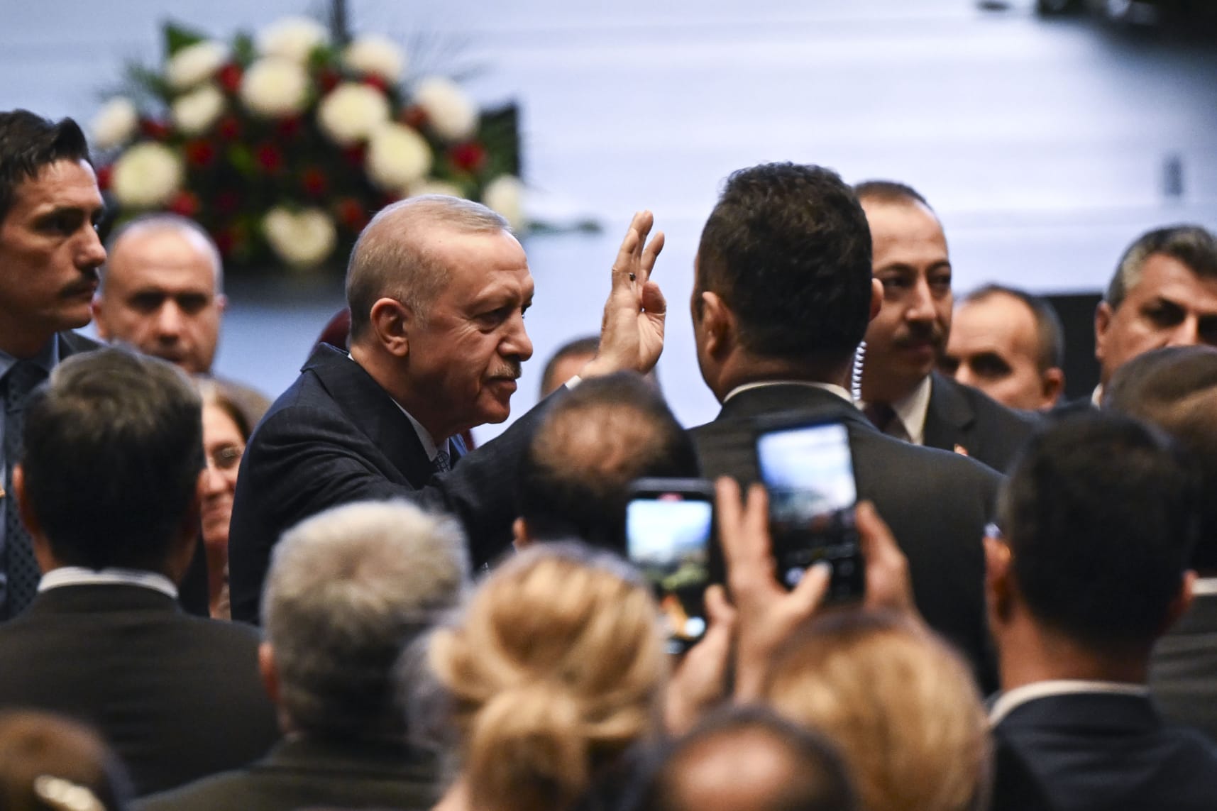 Konuşmasının ardından Cumhurbaşkanı Erdoğan'a, İnsan Suresi 6. ayetinin yazıldığı tablo hediye edildi.