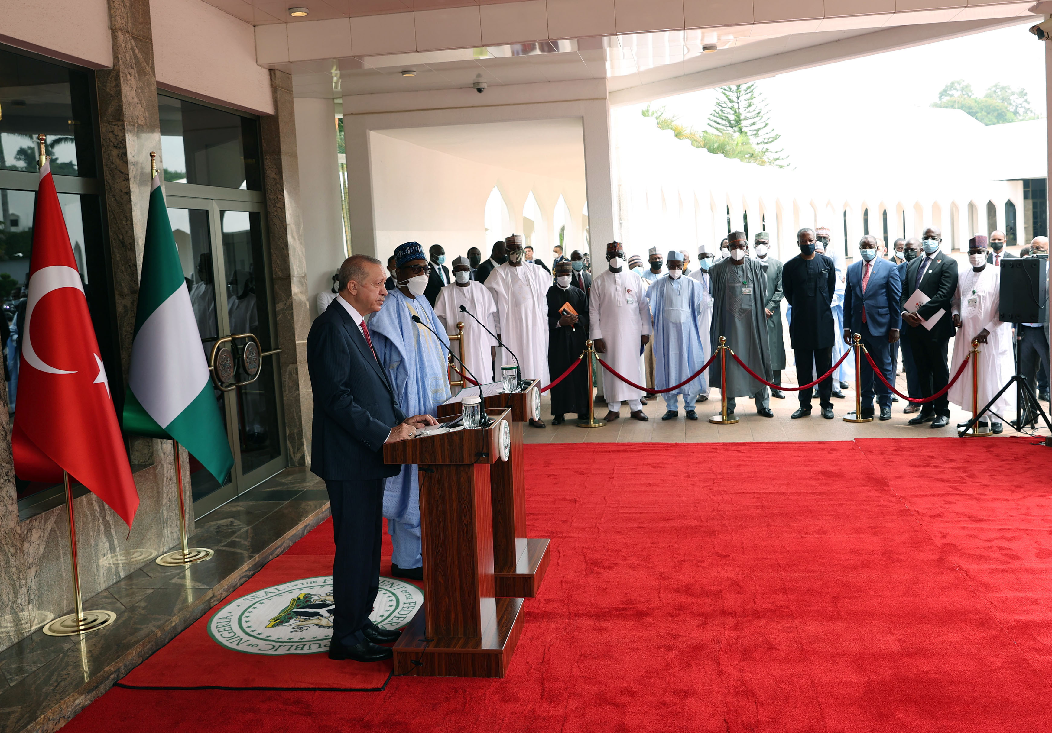 Sokoto eyaletindeki bir pazar yerinde 2 gün önce yaşanan terör saldırısında hayatını kaybedenlere rahmet, ailelerine ve Nijerya halkına başsağlığı dileyen Cumhurbaşkanı Erdoğan, "5 yıl aradan sonra Nijerya'ya gerçekleştirdiğim bu resmi ziyaretin ilişkilerimizi bir üst düzeye çıkaracağına inanıyorum. Az önce çeşitli alanlarda imzalamış olduğumuz anlaşmalar, ziyaretimizi taçlandırmıştır." ifadelerini kullandı.